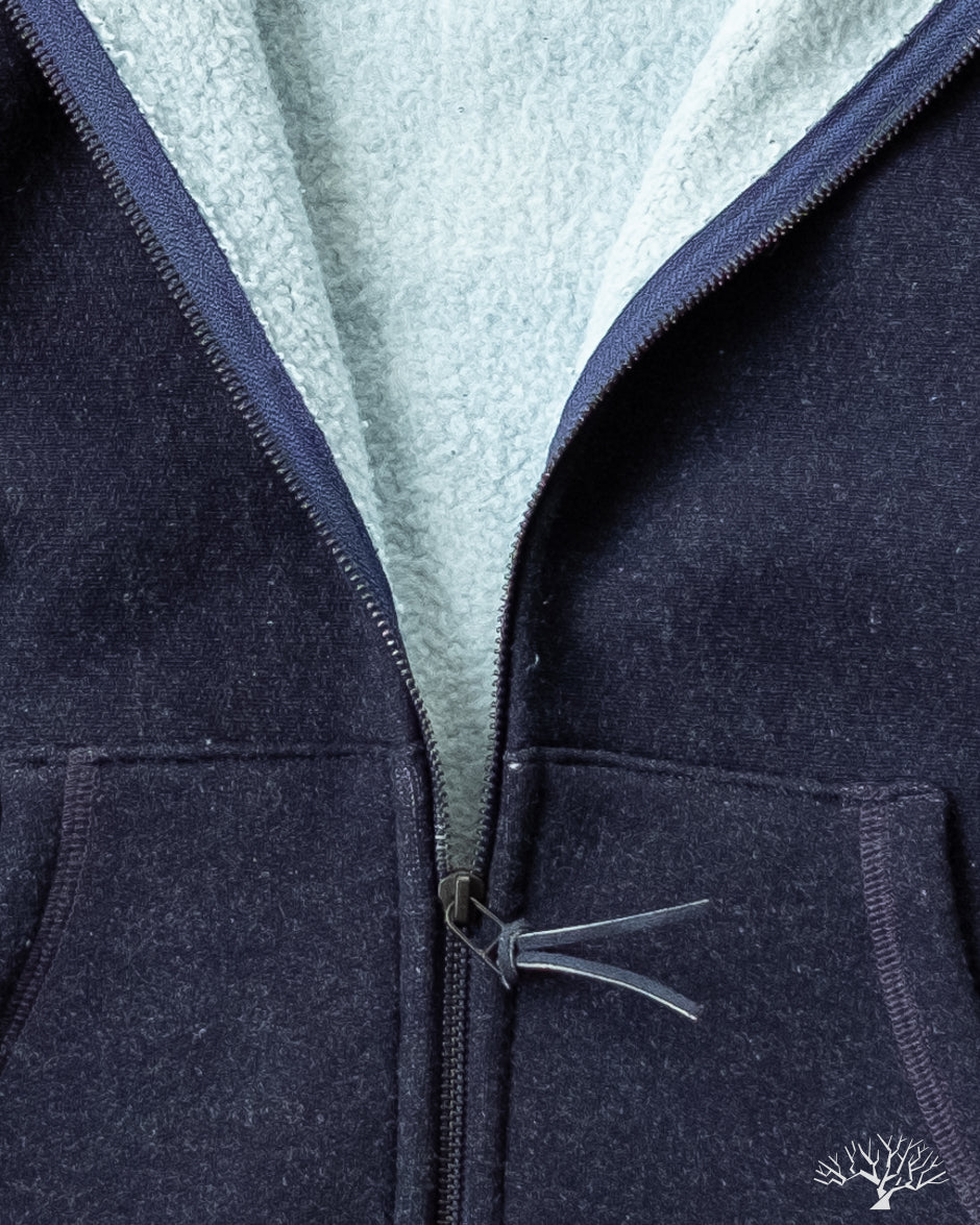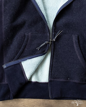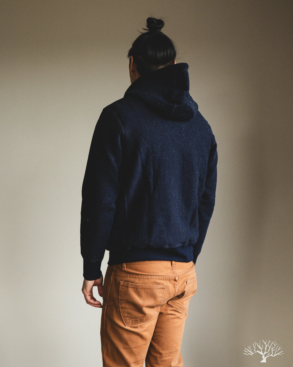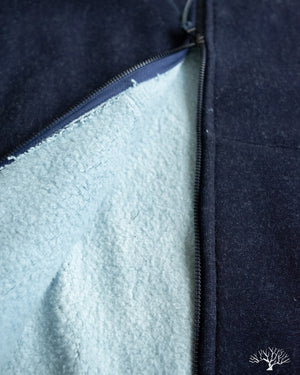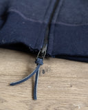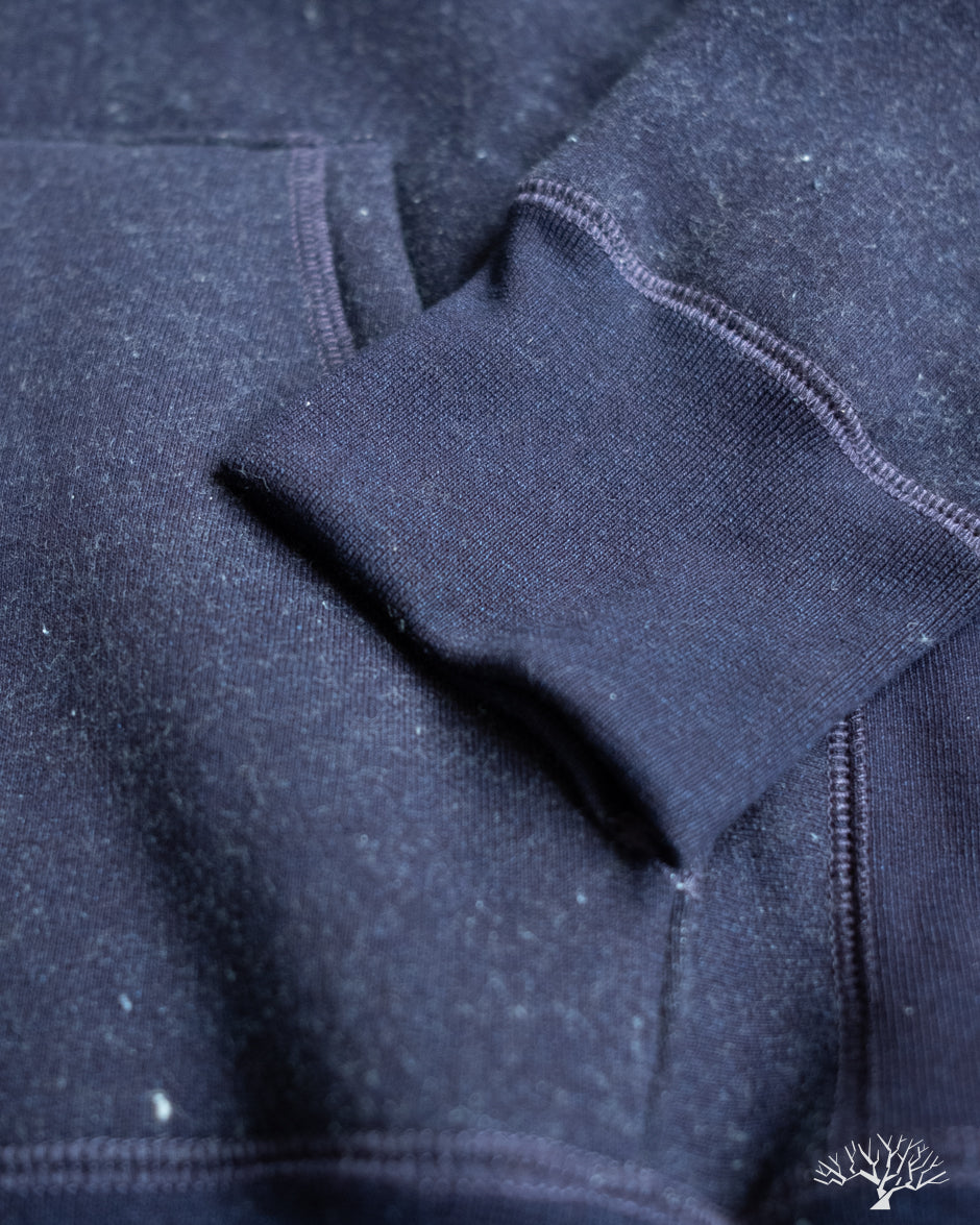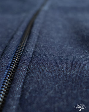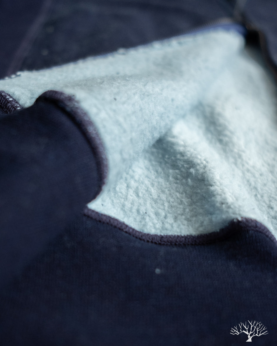 - 500gsm (14.75oz) custom yarn-dyed indigo knit fleece