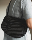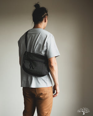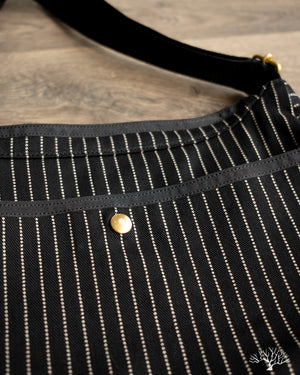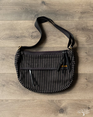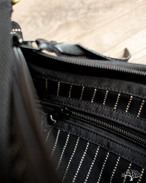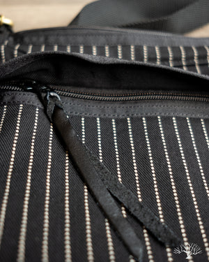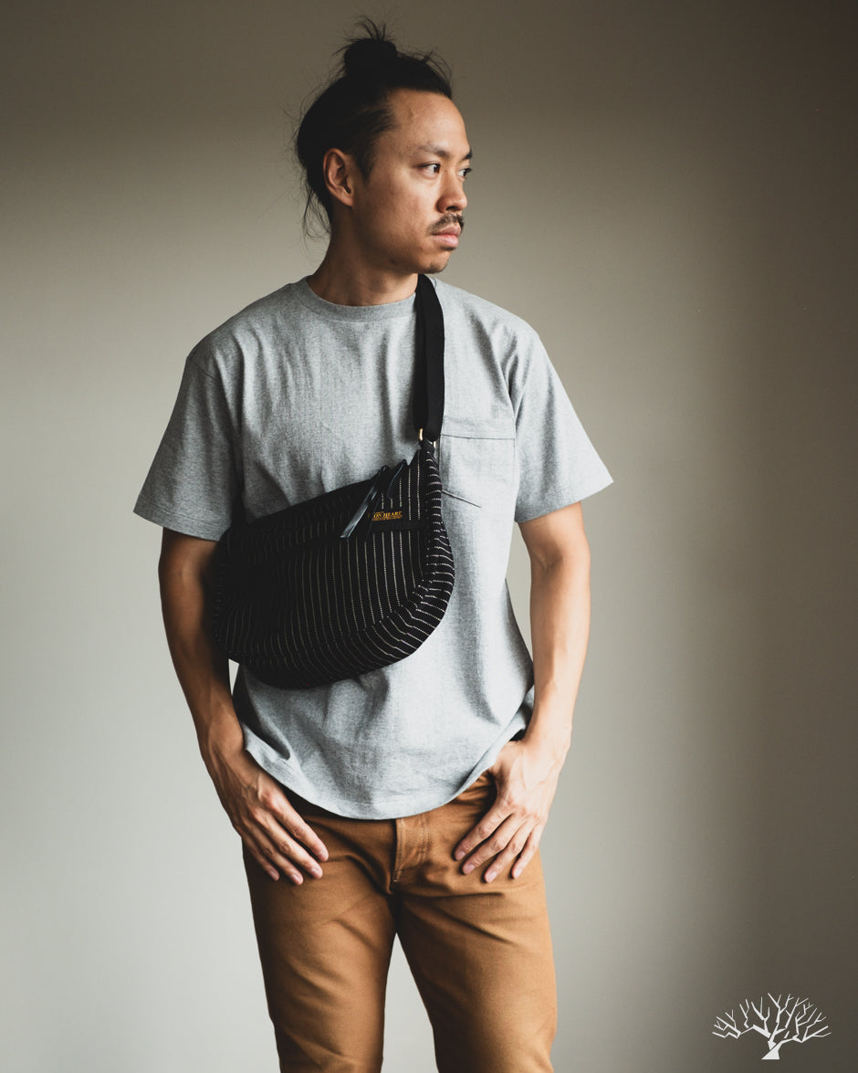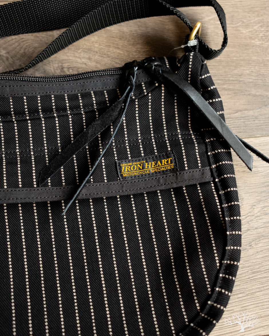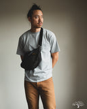 Iron Heart's famous 12oz Black Wabash fabric made in a small shoulder-slung pack. This bag hits above its weight with spacious accommodations inside, despite its small form factor. The wabash fabric is black rope dyed and will fade over time for a beautifully unique bag. The bag has a zippered external pocket on one side, and an open pocket with a snap button on the other. The internal main compartment features a two-way zipper closure and an additional internal pouch closure for smaller items (i.e. wallet, change, passport). The main compartment can easily fit a 1-litre sized water bottle with additional room to spare.
