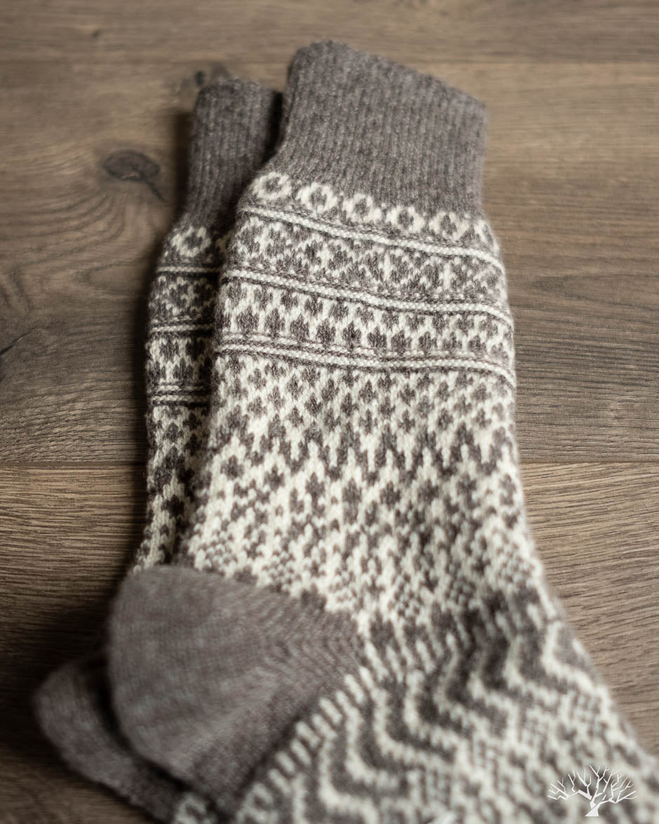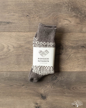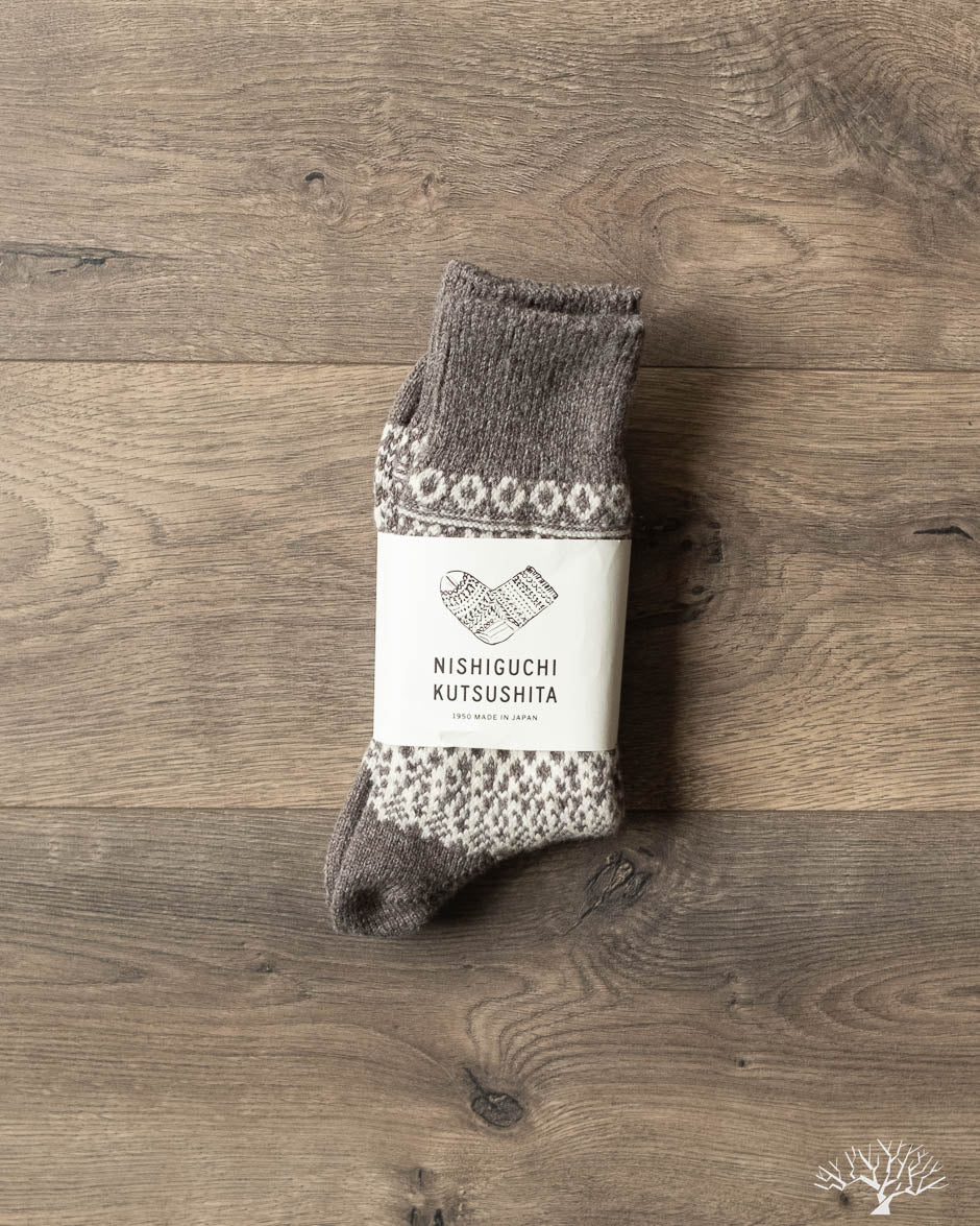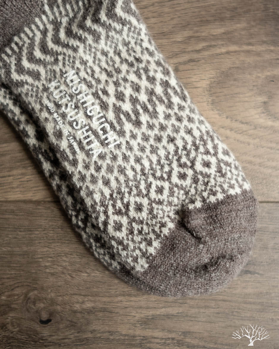 Nishiguchi Kutsushita Wool Jacquard socks in Gray feature timeless patterns using a specialty pre-shrunk wool to produce a cozy and plush sock that will keep your feet warm this winter.
