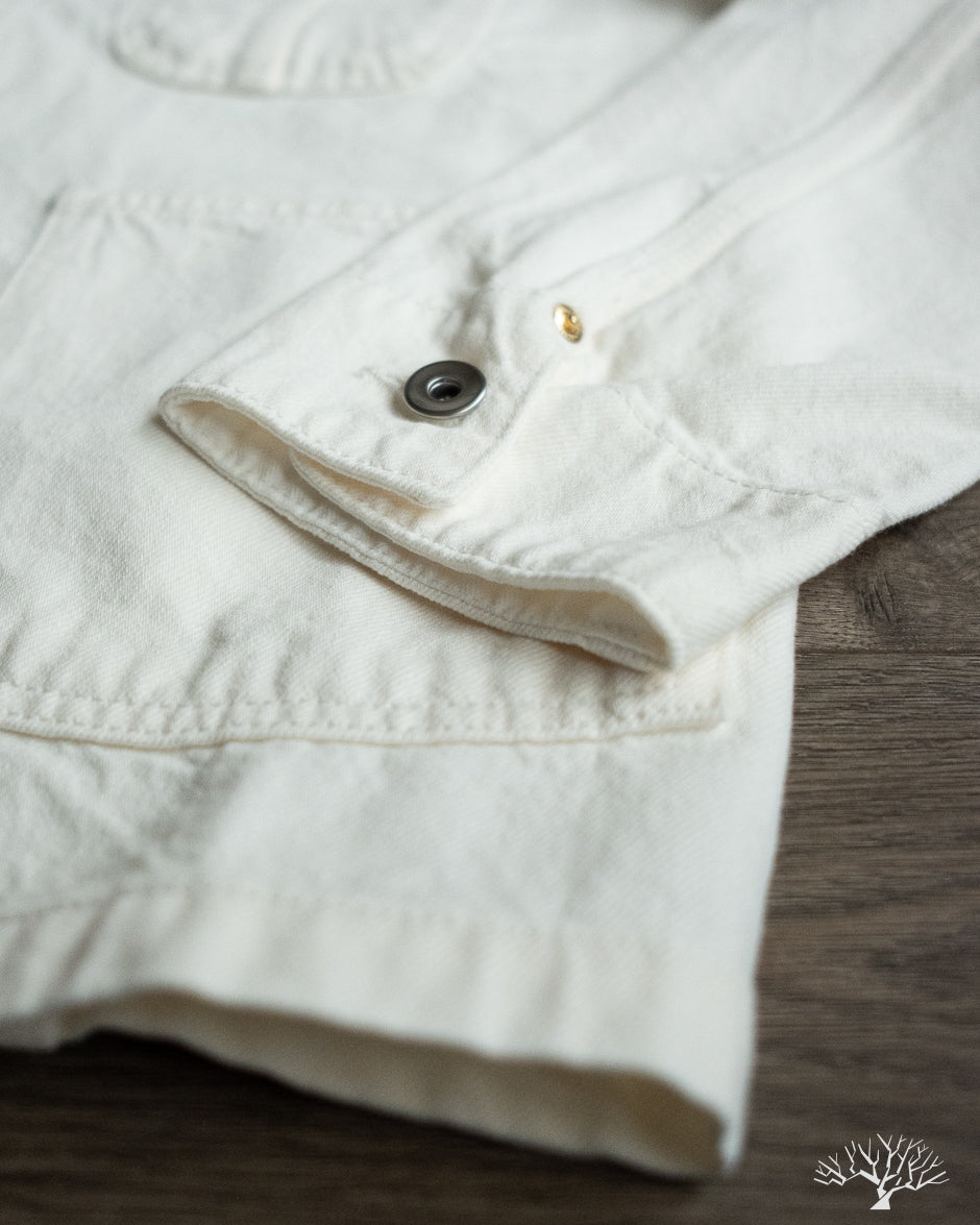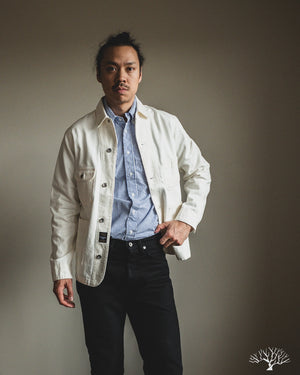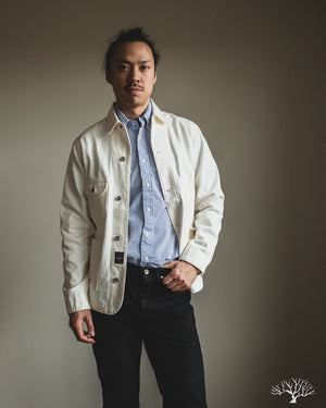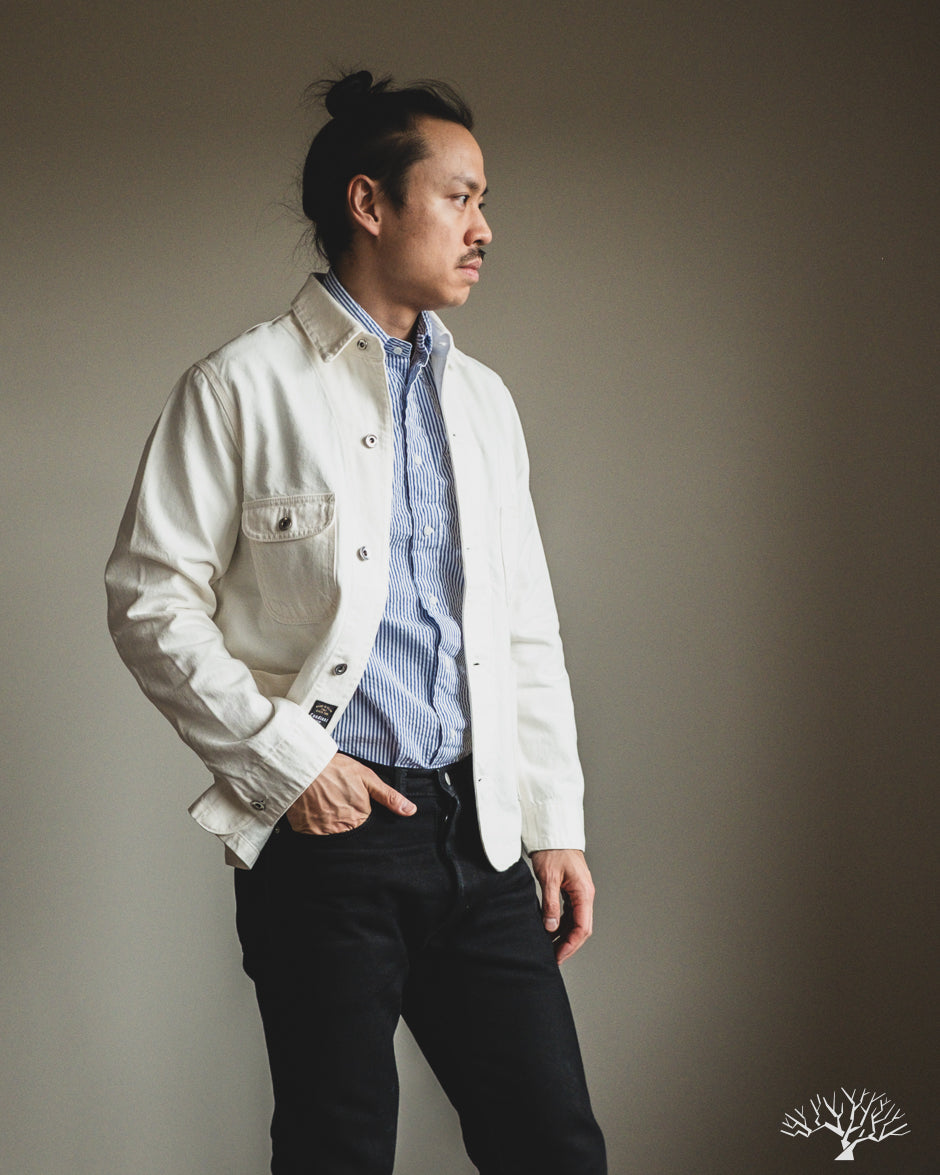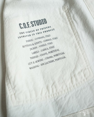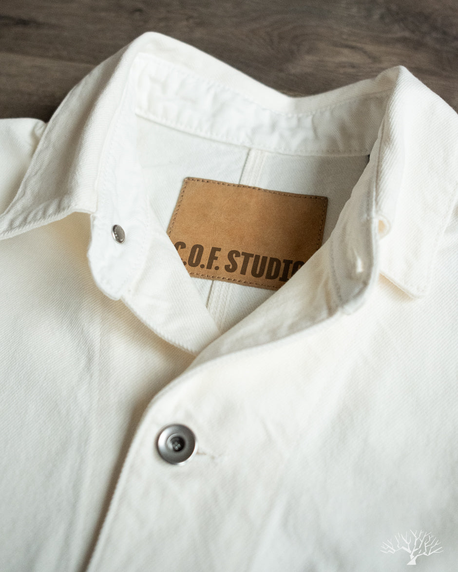 The C.O.F. Studio Railway Jacket in Ecru Stone Wash has a nice clean aesthetic to it. You don't need to be afraid of a white/ecru jacket, which pairs surprisingly well with a lot of outfits. Wear it over a button-up, or just throw it over your sweatshirt, it's an easy chore coat to work into your wardrobe. This ecru denim from Candiani Mills in Italy has been giving a stone wash for a broken-in feel. The Railway Jacket has a unique modern aesthetic to it with the extended placket that curves into and under the collar.