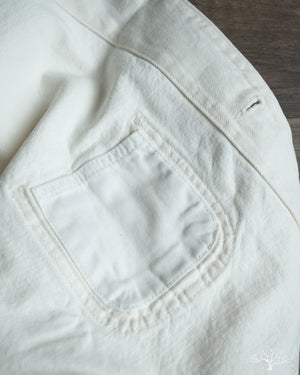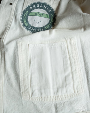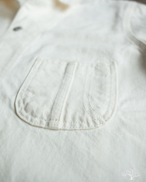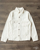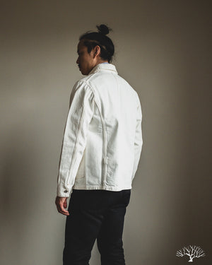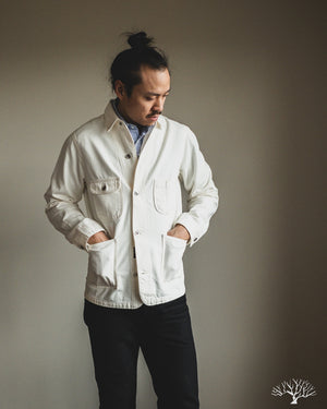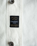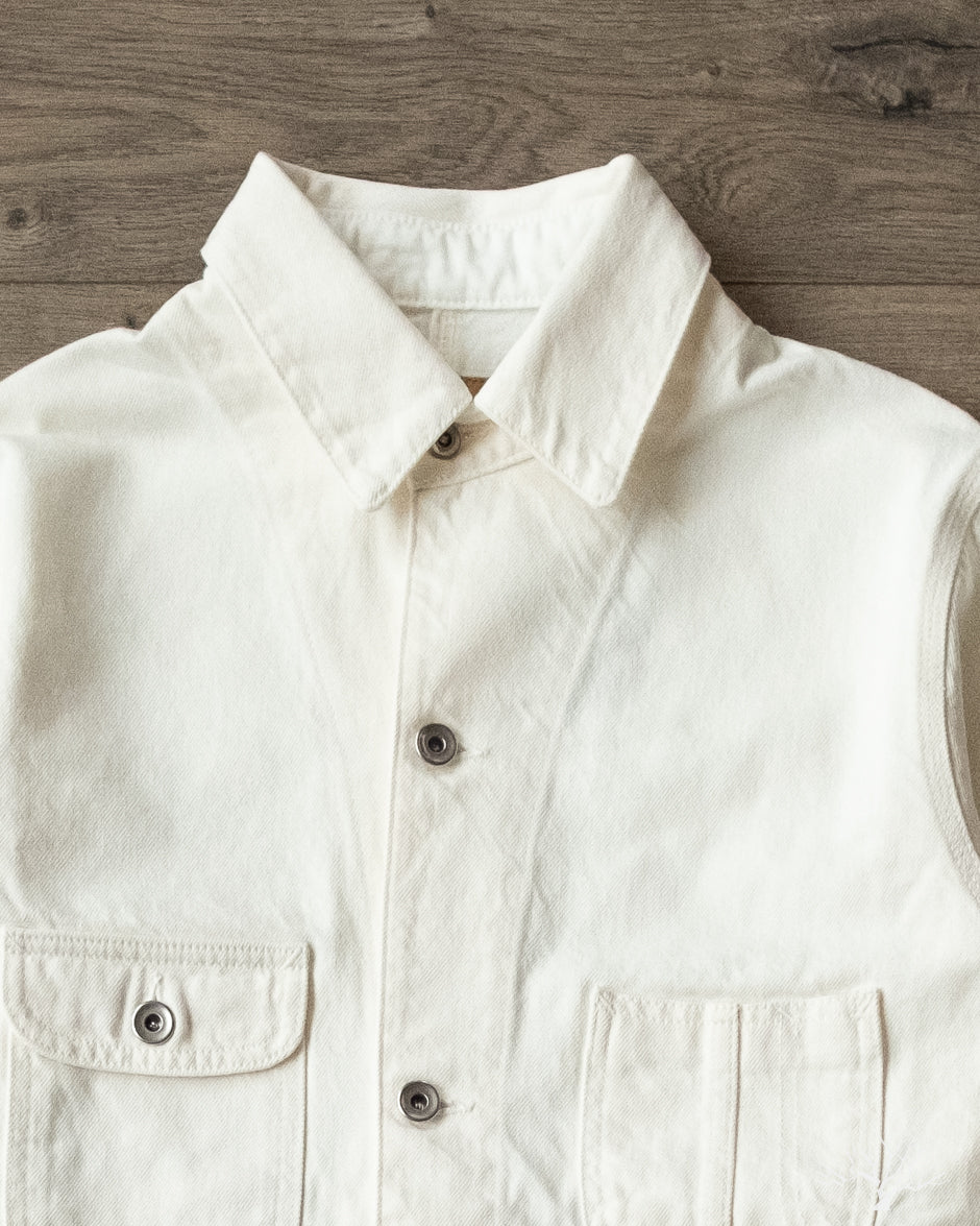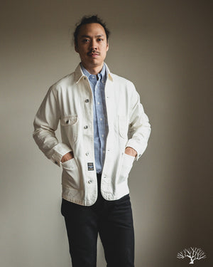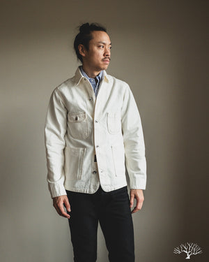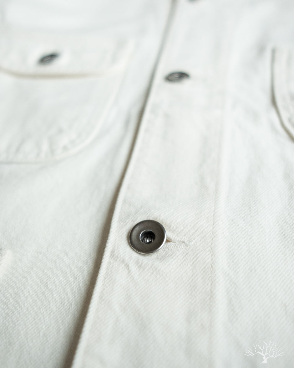The C.O.F. Studio Railway Jacket in Ecru Stone Wash has a nice clean aesthetic to it. You don't need to be afraid of a white/ecru jacket, which pairs surprisingly well with a lot of outfits. Wear it over a button-up, or just throw it over your sweatshirt, it's an easy chore coat to work into your wardrobe. This ecru denim from Candiani Mills in Italy has been giving a stone wash for a broken-in feel. The Railway Jacket has a unique modern aesthetic to it with the extended placket that curves into and under the collar.
