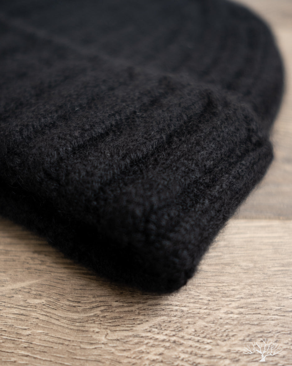 Câbleami Cashmere 2x2 Rib Watch Cap in Black is an amped up luxury version of their standard waffle cap with a full on 100% cashmere fabric and a wider rib pattern. Made for those who just can't deal with any but the finest and softest material. This is one watch cap that you'll know you spared no expense in getting the absolute best.