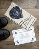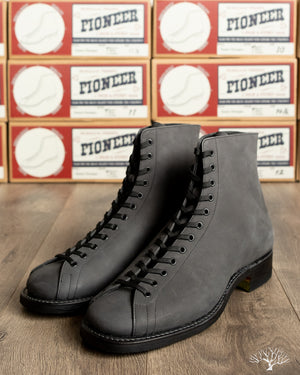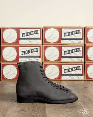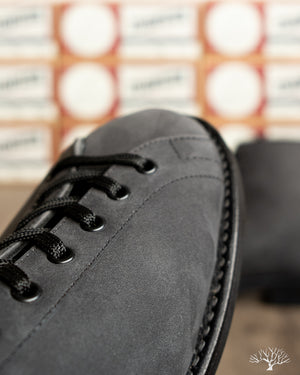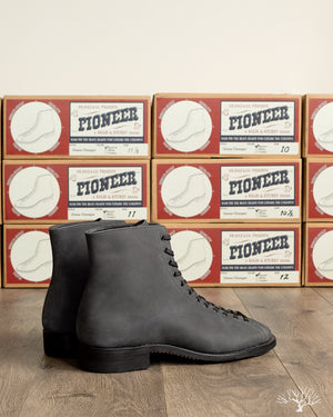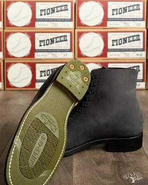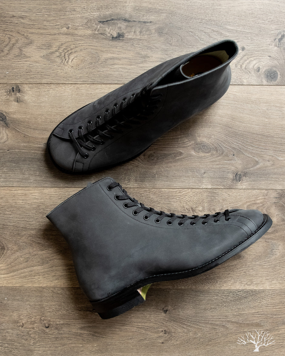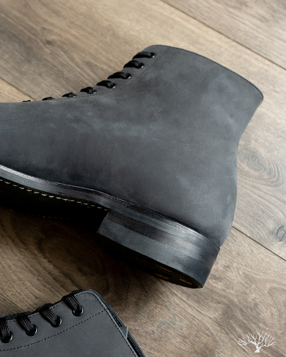 Dr. Sole for Withered Fig Game Changer Boots in Black Nubuck, part of our exclusive Withered Fig 5 Year Anniversary Collection. These boots feature a velvety black top-grade nubuck leather that will age well over time. The Game Changer Boot is inspired from 1920s sports boots with a lace-to-toe design that you might come across in vintage-styled athletic posters of years past. As part of this special collaboration, Dr. Sole has included their 10th Year Anniversary Bandana with every pair.