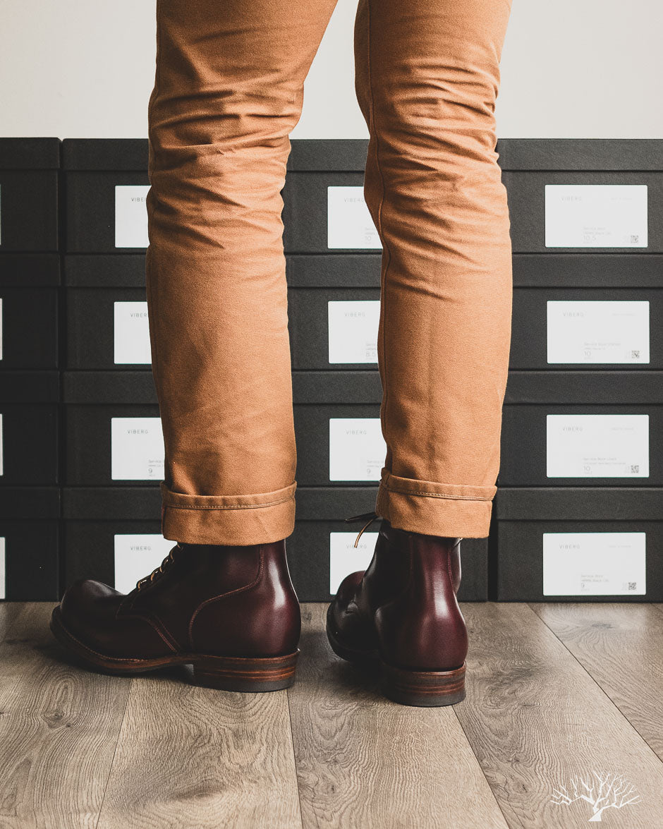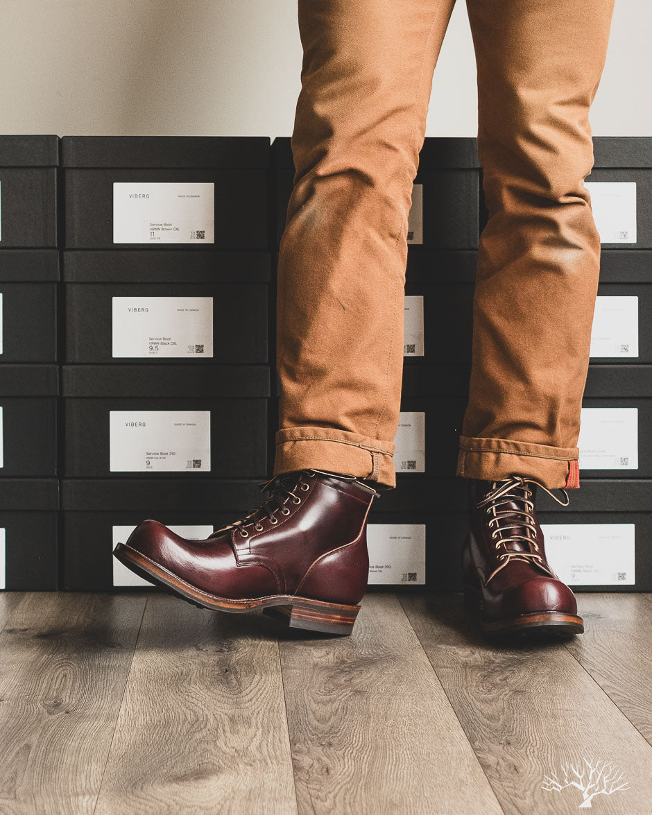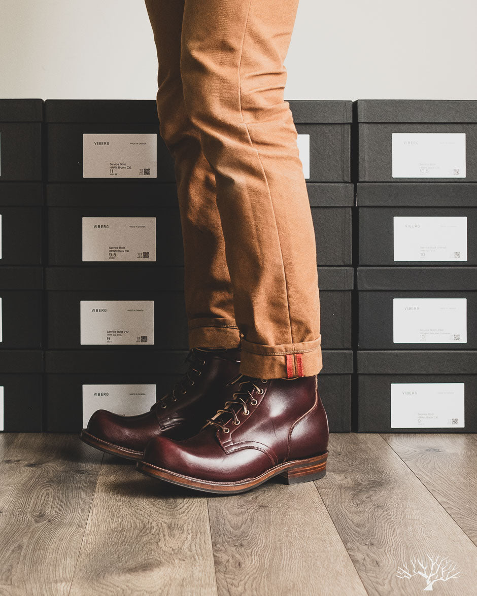 The Viberg 310 Service Boot in a Color 8 Chromexcel (CXL) is known for its chunky last and vintage appearance. Horween's Color (Col.) 8 CXL leather has a burgundy-like appearance and can be a nice tweener leather between semi-dress and casual. The 310 Service Boot has a lot of curves and shape to it, making it one of the more notable pairs in their lineup of fashion-forward workwear styles.