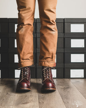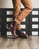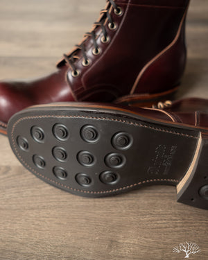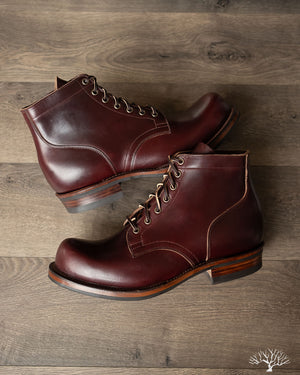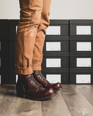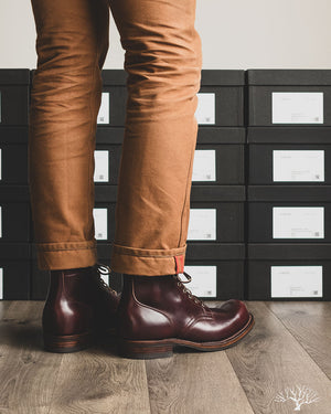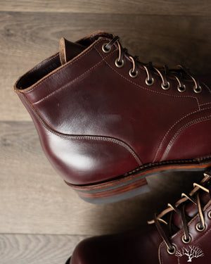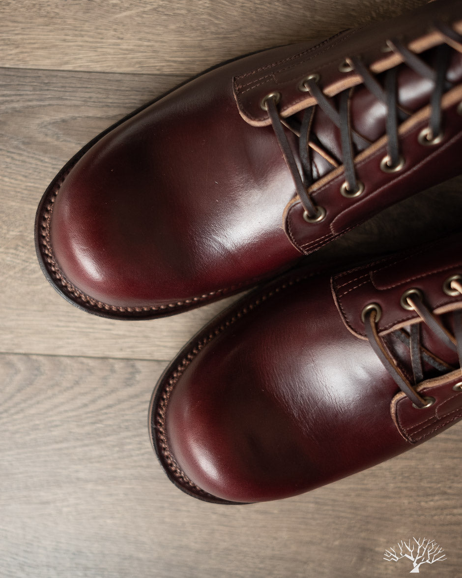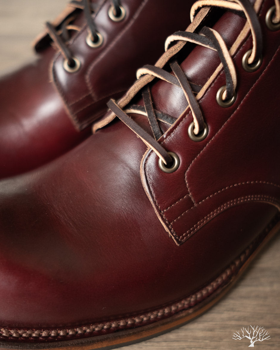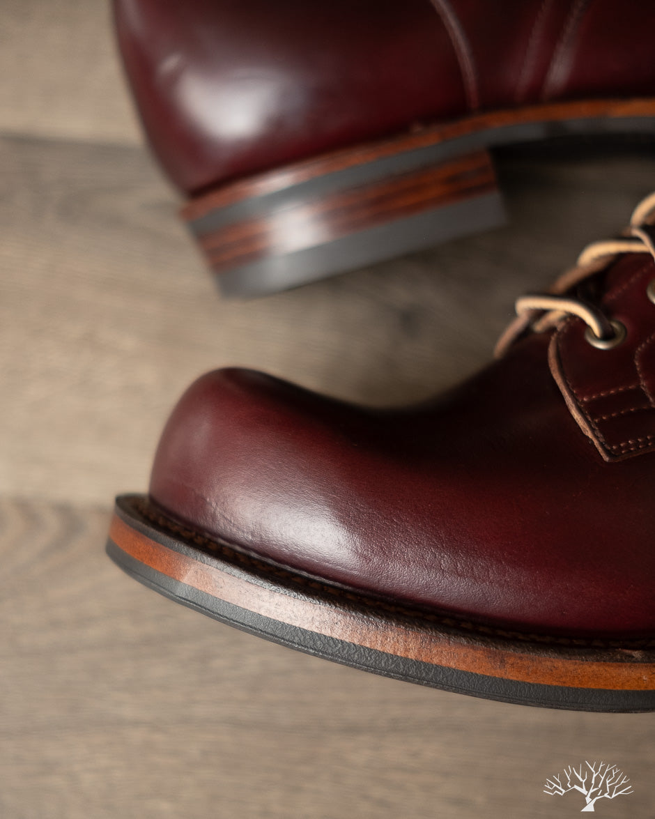The Viberg 310 Service Boot in a Color 8 Chromexcel (CXL) is known for its chunky last and vintage appearance. Horween's Color (Col.) 8 CXL leather has a burgundy-like appearance and can be a nice tweener leather between semi-dress and casual. The 310 Service Boot has a lot of curves and shape to it, making it one of the more notable pairs in their lineup of fashion-forward workwear styles.