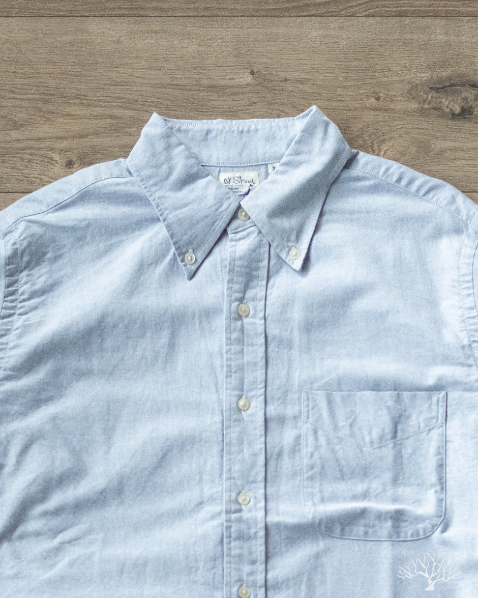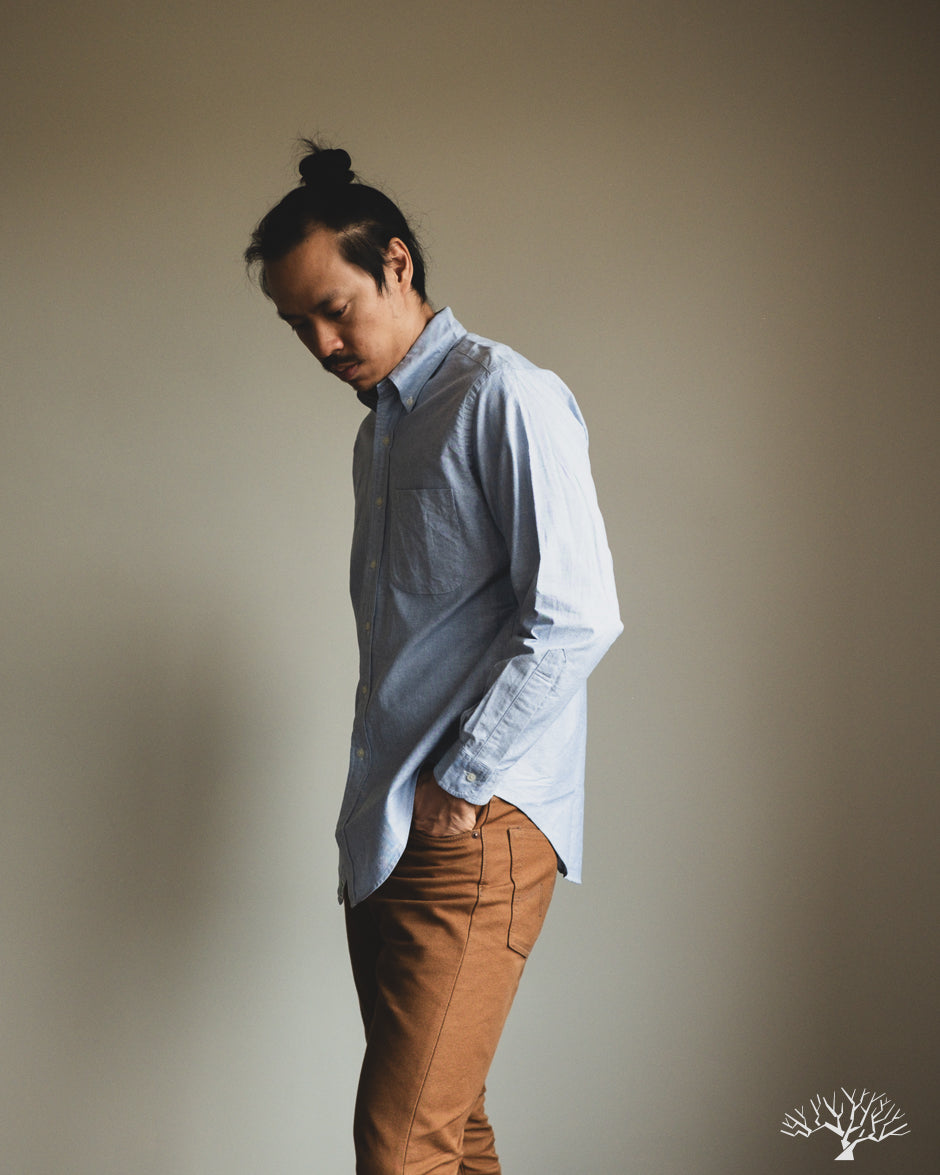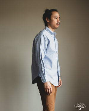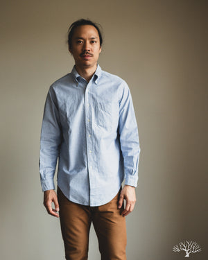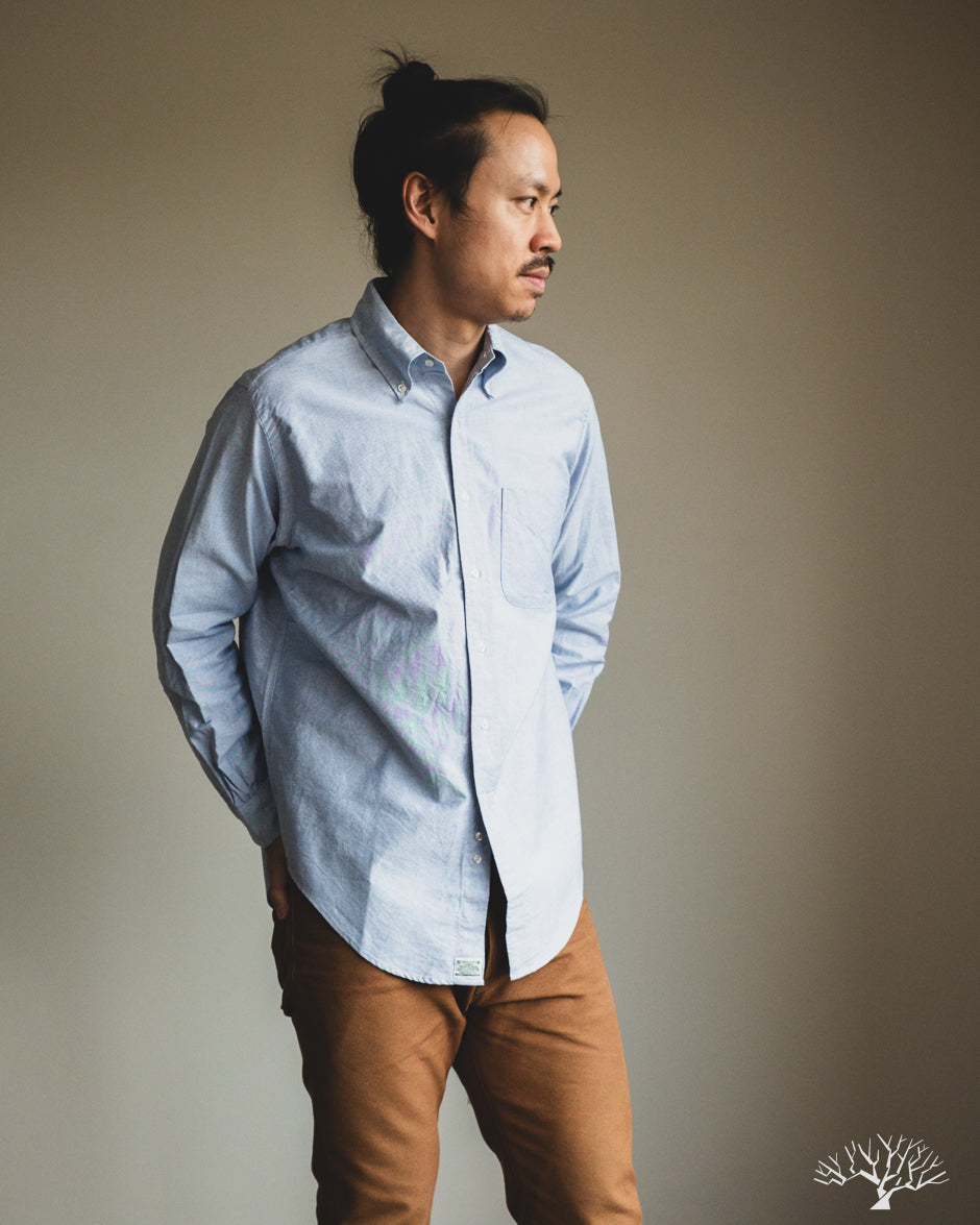 The orSlow Oxford Button Down Shirt is the perfect oxford for the uninitiated. This Light Blue Oxford is cut in their standard fit, not too slim nor too relaxed. This can be a staple in your wardrobe for a slightly more elevated look. Classic and timeless, the orSlow Oxford Shirt is made from 100% cotton in a lightweight combed cotton fabric that will never go out of style.