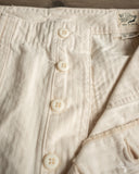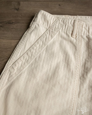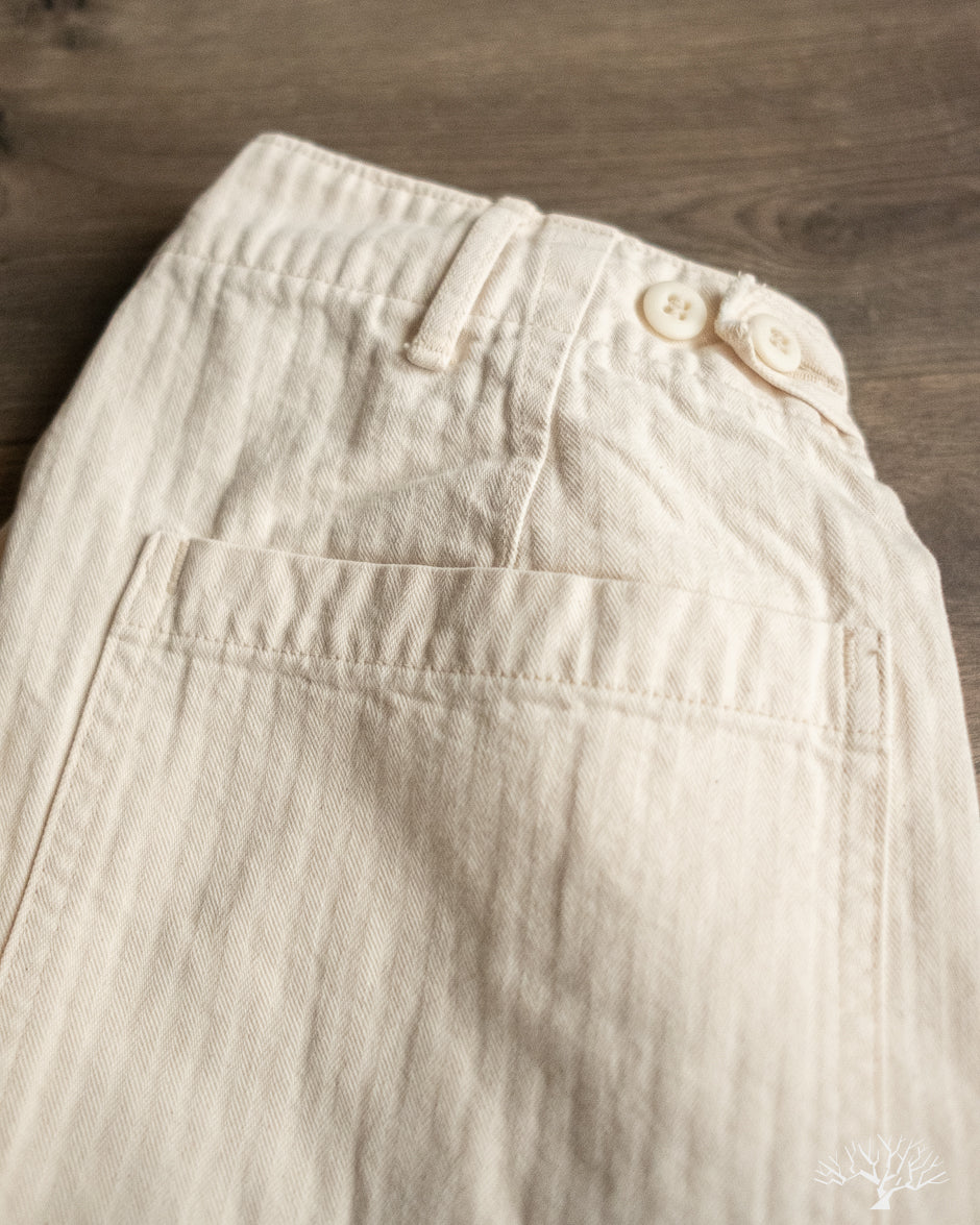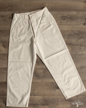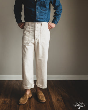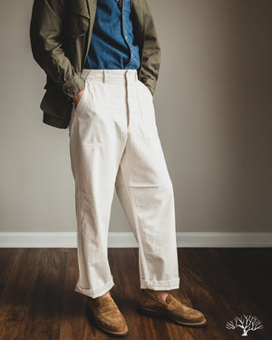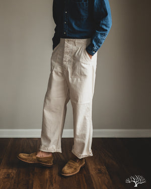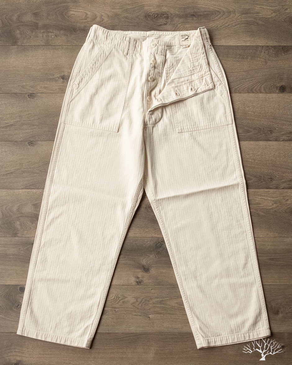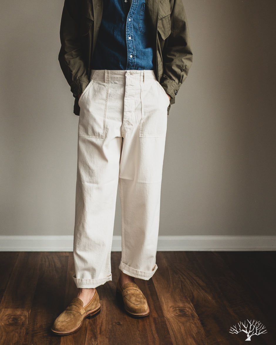 These lightweight and airy Summer Fatigue Pants from orSlow are the perfect pair if you're looking for a roomy straight cut that keeps you cool this summer. Cut in summer-perfect Ecru herringbone twill fabric, these are light in the hand and will feel breathable throughout. These are cut with a roomy top block and wide fit through the legs; these are probably most similar to the Dad's 101 Fit in this regard. orSlow maintains the button tabs on the waist that allows for a custom fit.