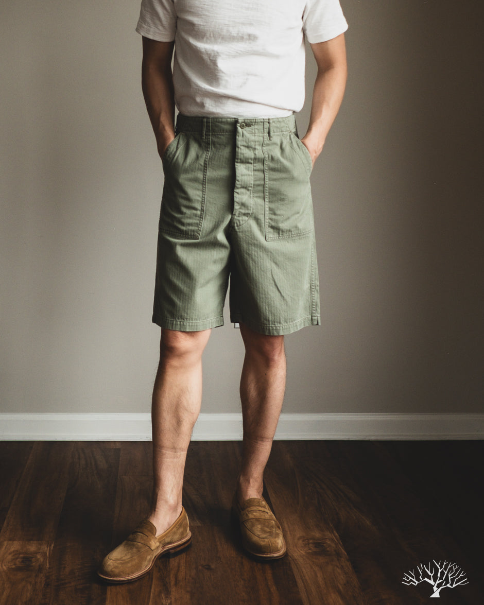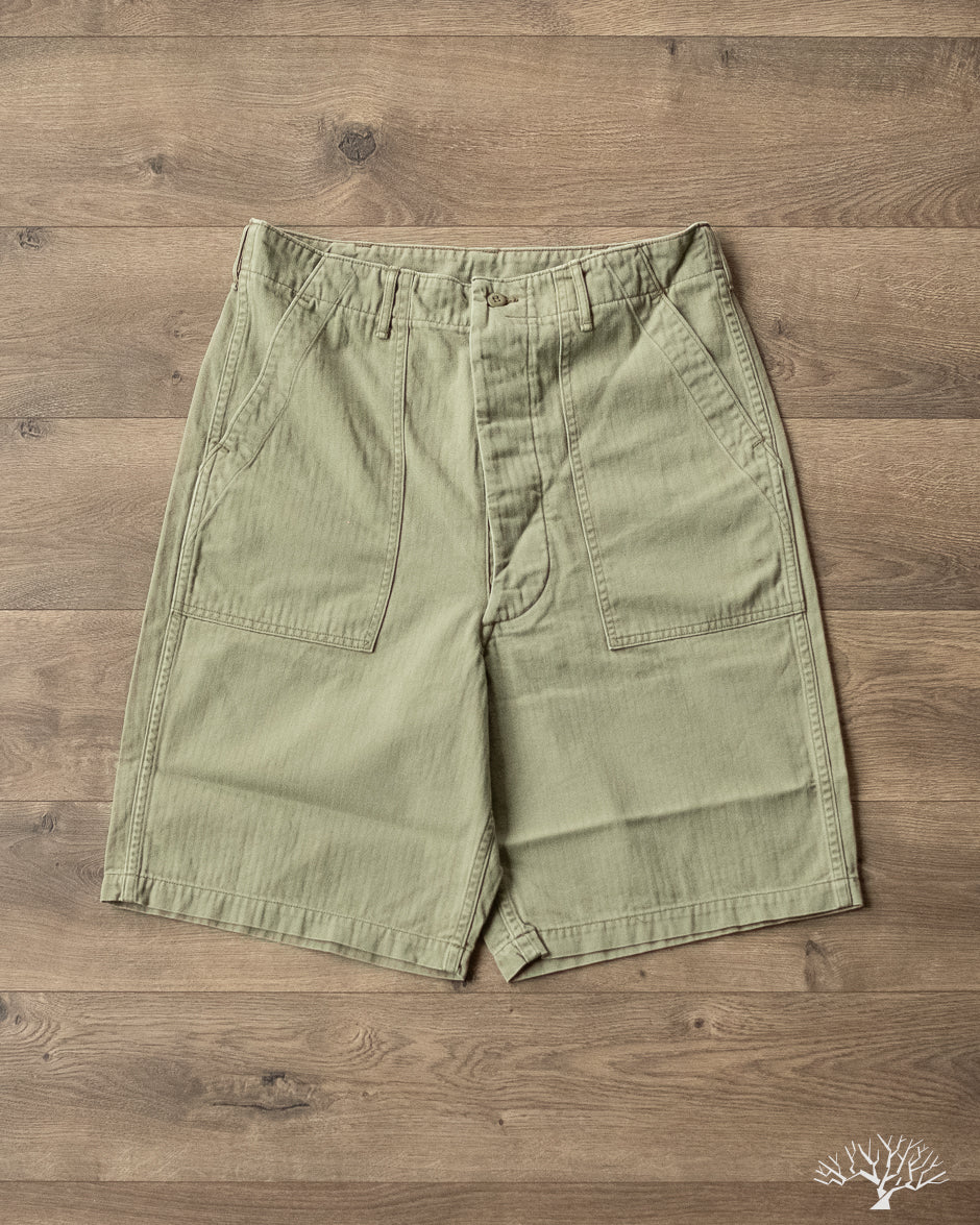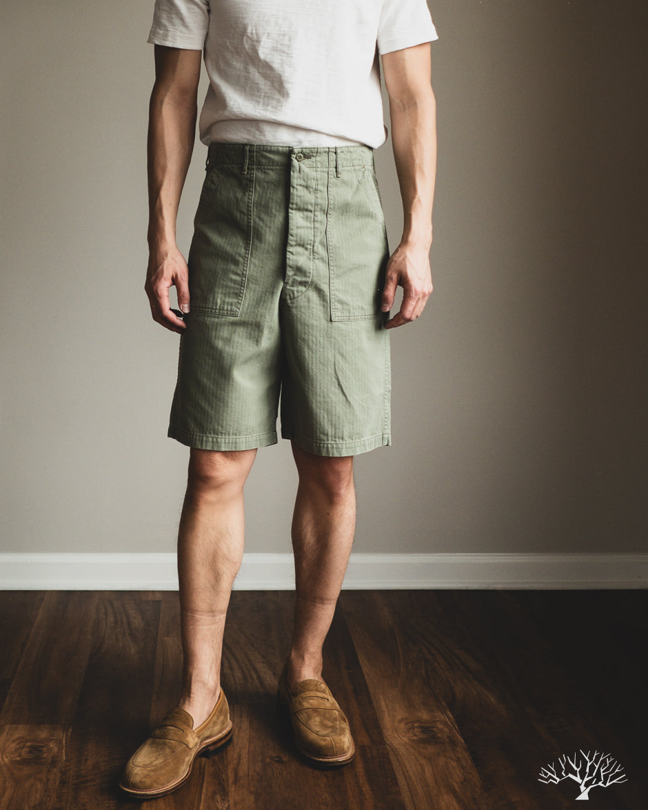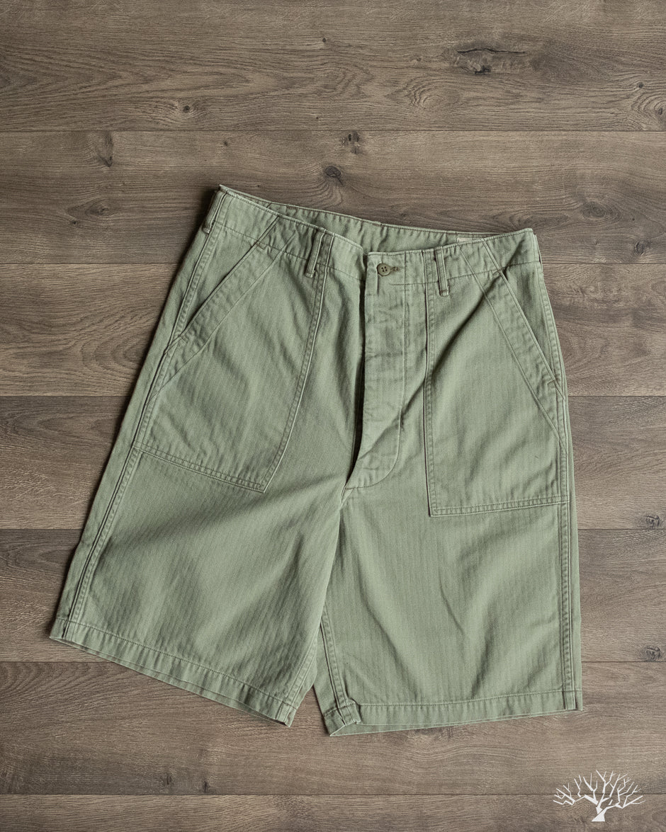 The orSlow Summer Fatigue Shorts are a relatively lightweight roomy pair of shorts allowing ample breathability and mobility. Cut in slightly washed and faded green herringbone fabric, these are light in the hand and will feel great on those warm summer days. These Fatigue Shorts feature a very high rise and a roomy fit throughout.