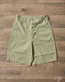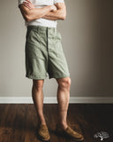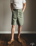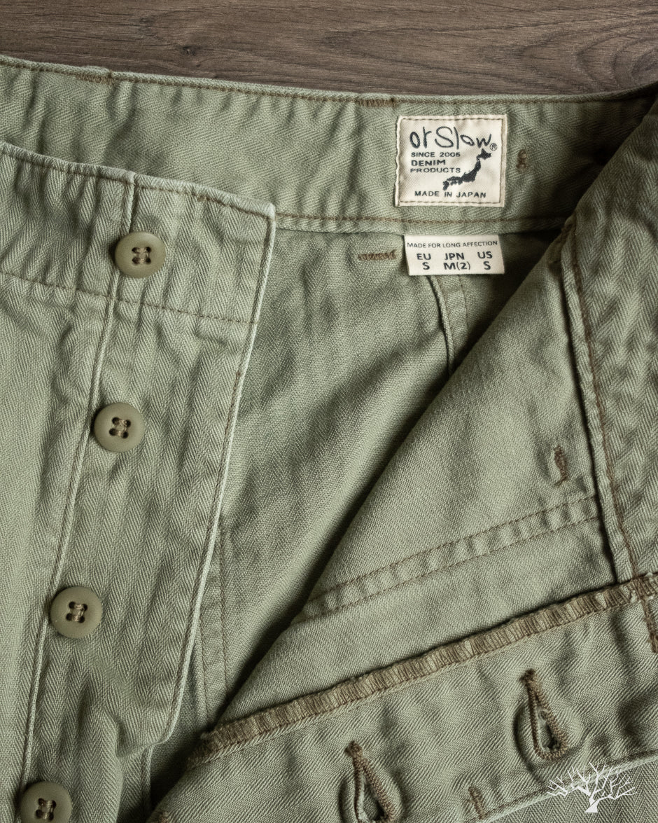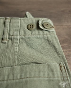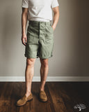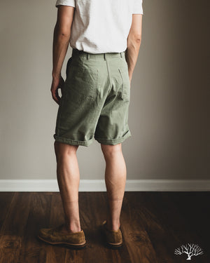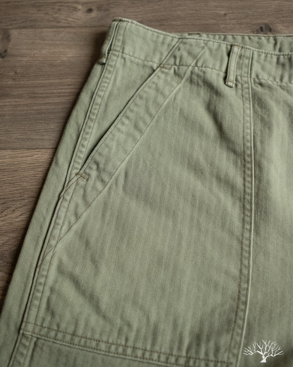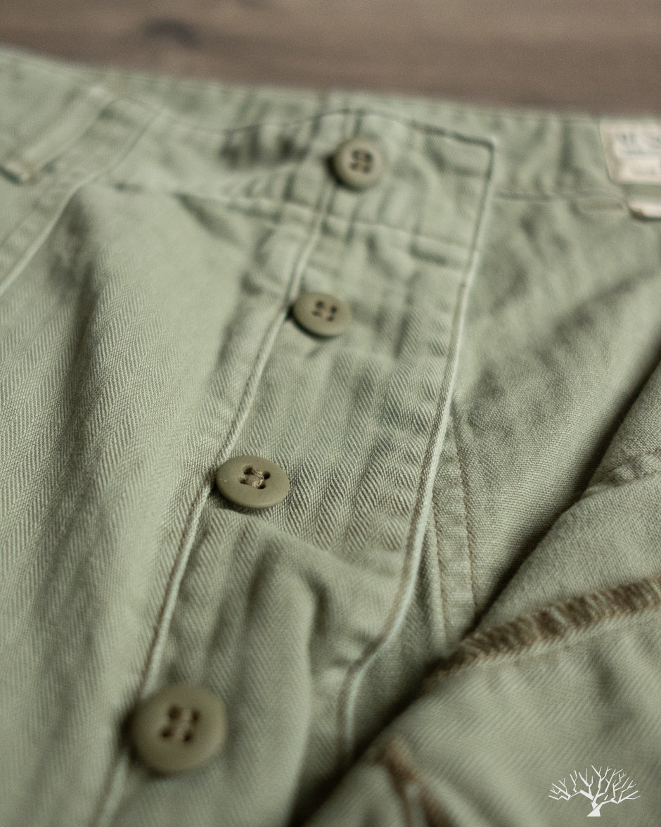 The orSlow Summer Fatigue Shorts are a relatively lightweight roomy pair of shorts allowing ample breathability and mobility. Cut in slightly washed and faded green herringbone fabric, these are light in the hand and will feel great on those warm summer days. These Fatigue Shorts feature a very high rise and a roomy fit throughout.