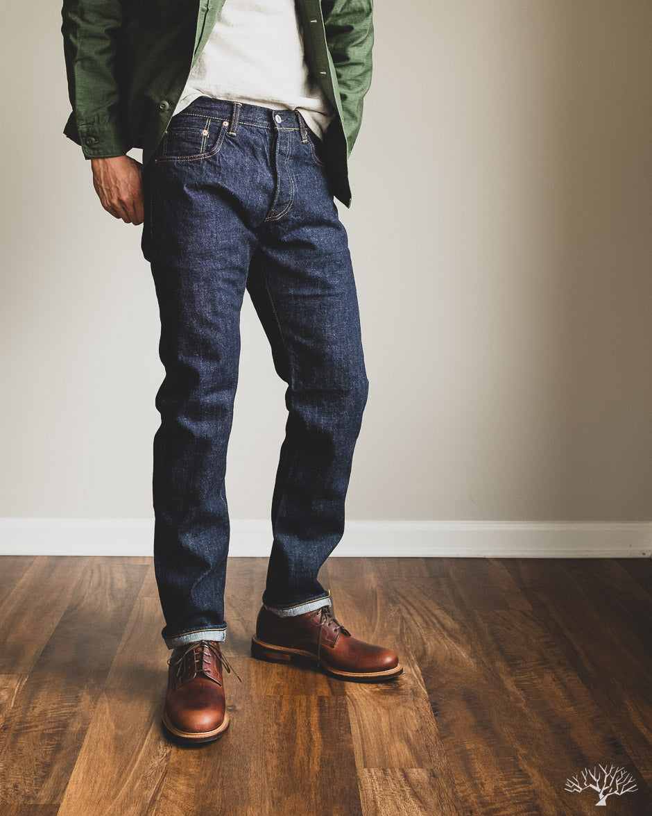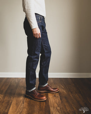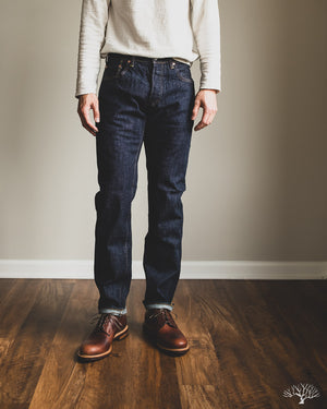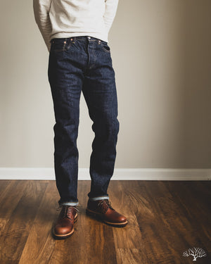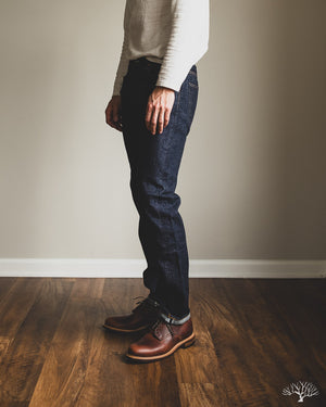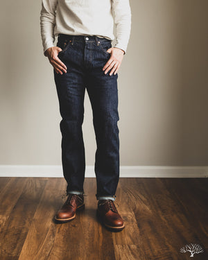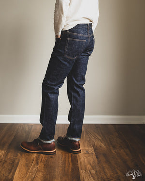 The TCB 50's Slim Jeans T is one of their recent additions to their lineup of repro vintage denim. While TCB generally sticks to vintage cuts, they've spec'd out this slim-tapered cut while maintaining all the other details as on their original 50's Jeans. This uses the same custom woven 13.5oz denim that serves as an excellent medium-weight pair, with irregular texture and a slight nep to the fabric. Additional details include the selvedge coin pocket and a paper patch for an authentic vintage feel that will ultimately break down and reveal the dark indigo denim underneath it.
