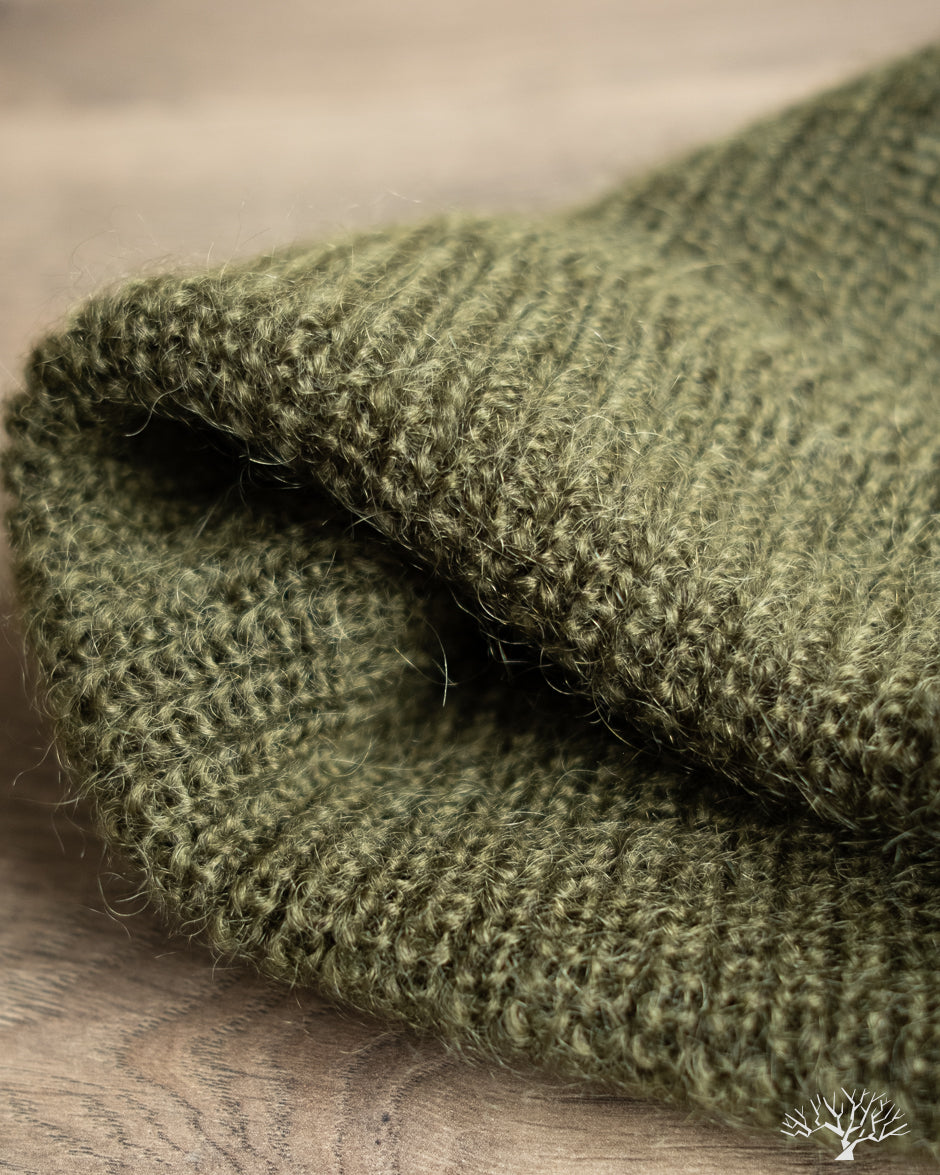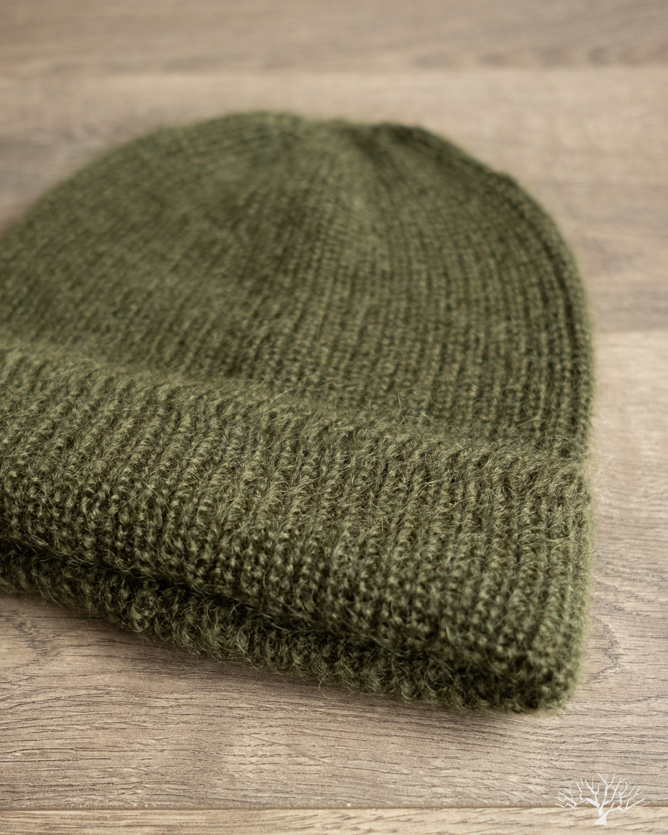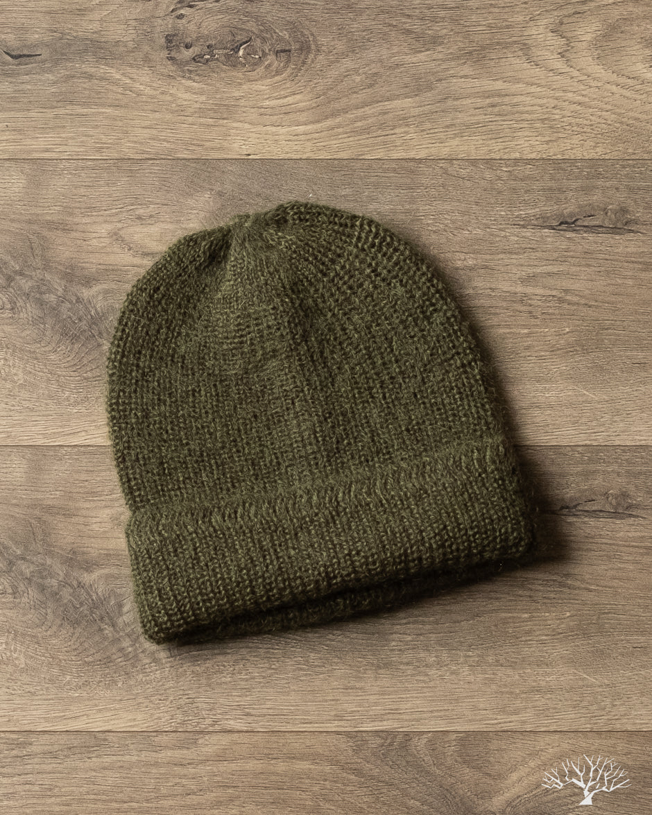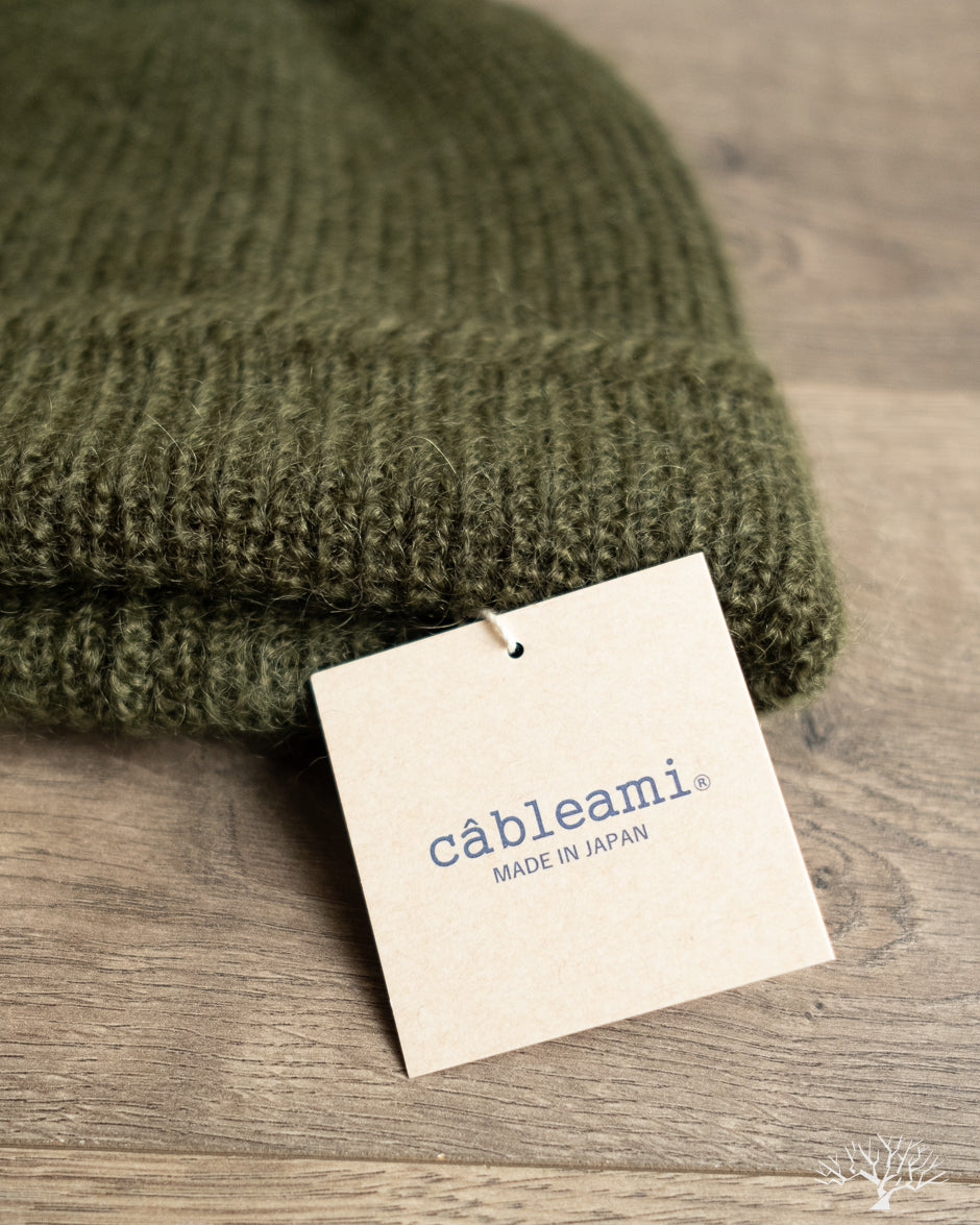 Câbleami Mohair Tube-Yarn Watch Cap in Olive is a new style for this season, featuring a tighter braid of mohair fibers than previous mohair watch caps. Coming in a deep olive color, this watch cap has a hairy texture yet a very soft a lustrous feel. These are excellent watch caps for the cool nights ahead.