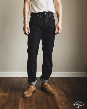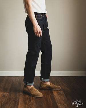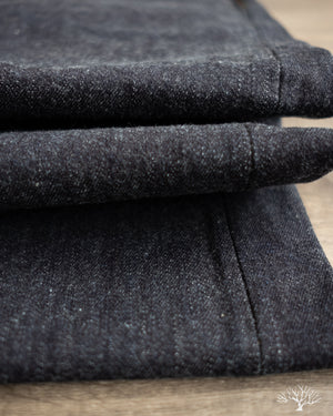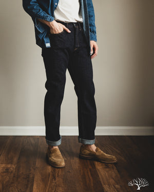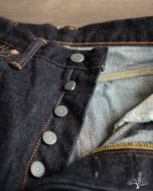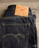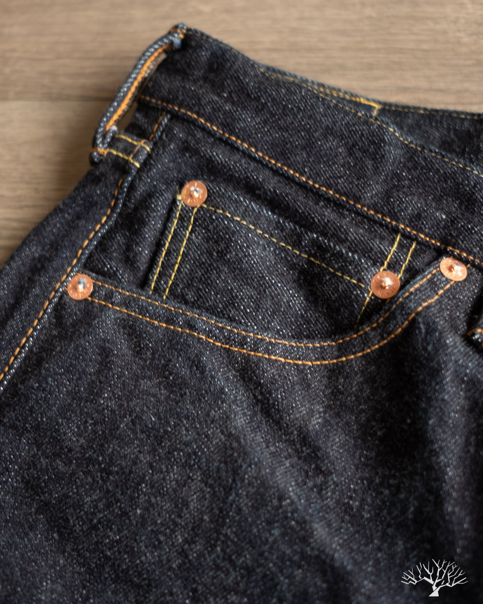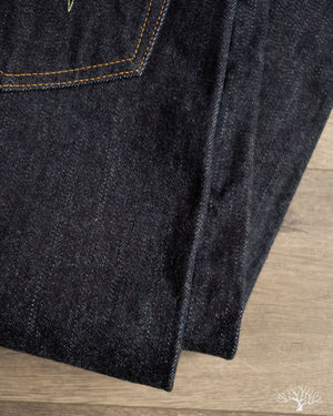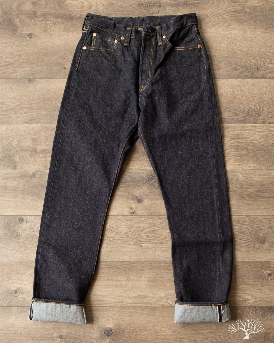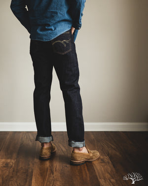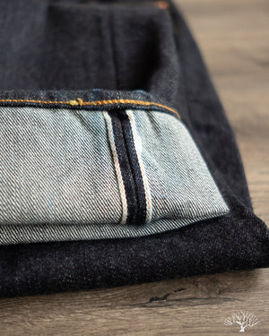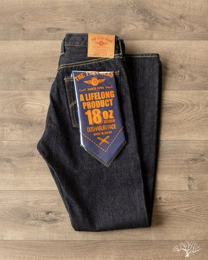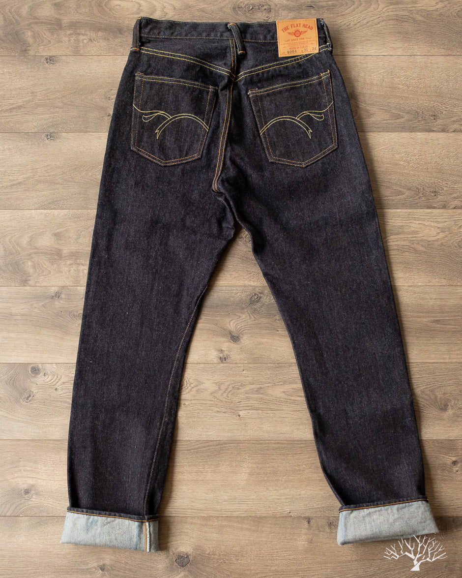 The Flat Head 18oz Wide Tapered Indigo Selvedge Denim is a high rise, wide tapered fit that will produce some high contrast indigo fades with time. This heavyweight denim fabric has a bit of irregularity to it, as well as a decent amount of nap to the surface. Flat Head details include raised belt loops and hidden copper rivets for aesthetics and durability. This denim has notable vertical streaking to it, which should produce rain-drop like fading as you wear it in.