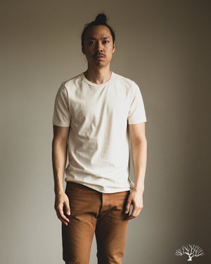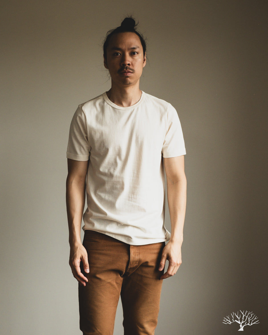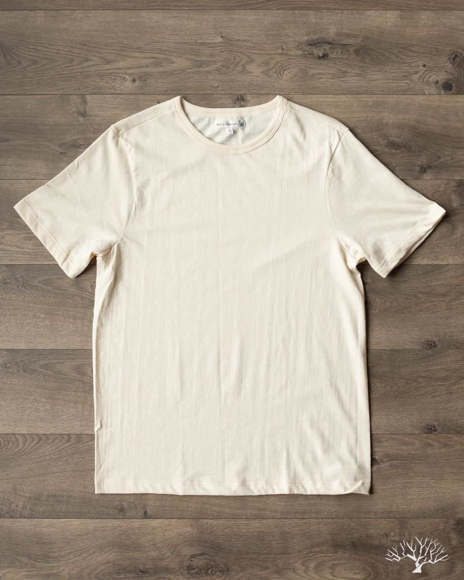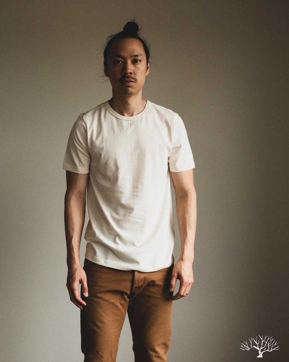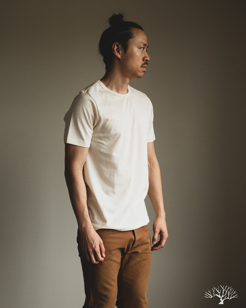 Made out of 100% organic cotton, Merz b. Schwanen's 1950s Loopwheel Tee in a soft Nature colorway is ultra-soft to the touch. Coming in a lightweight single-thread fabric, these have a comfortable and stretchy fit. These 1950s tees are cut in their Classic Fit, which runs slim throughout. The t-shirt has a rounded crew neckline and a triangle insert under the armpit for maximum comfort. Made on original loopwheelers in Germany - one of two remaining loopwheeler operations in the world, the result is a seamless tubular fabric that will be your softest and most comfortable tee.