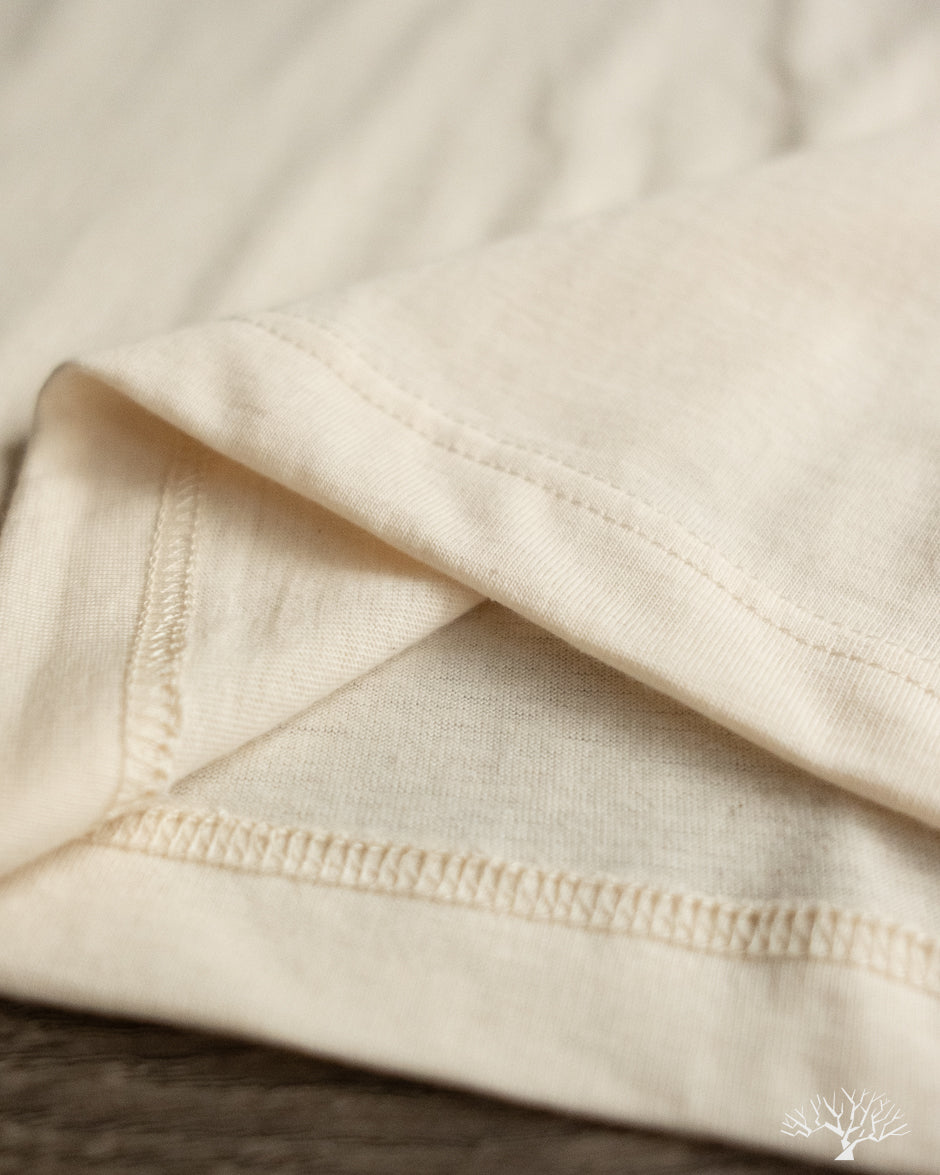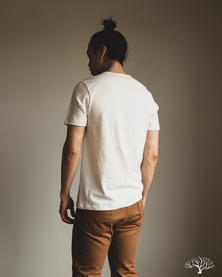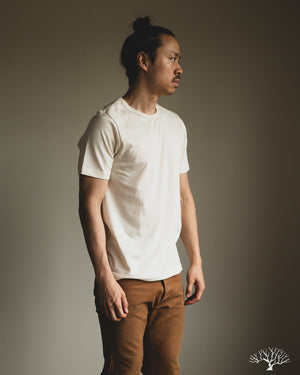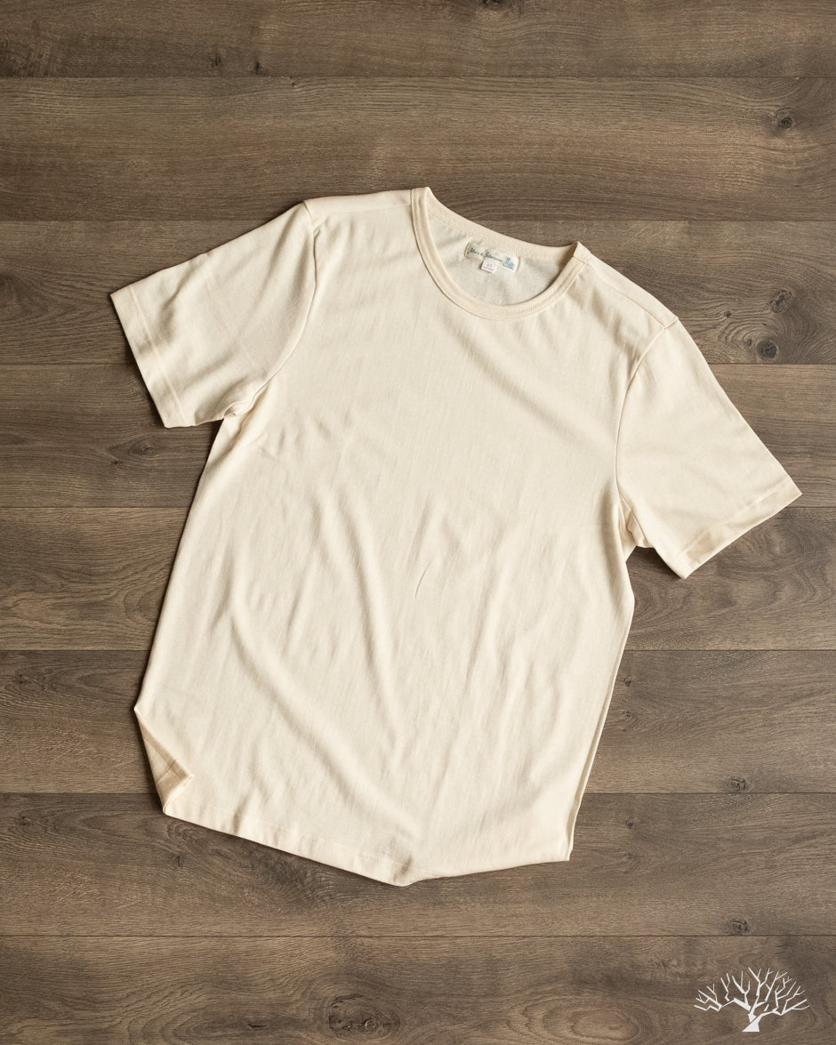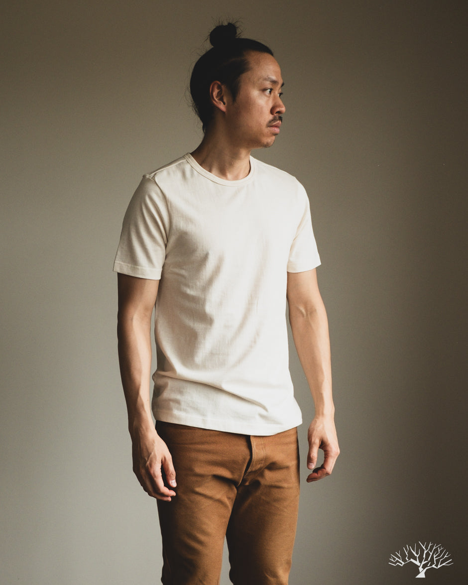 Made out of 100% organic cotton, Merz b. Schwanen's 1950s Loopwheel Tee in a soft Nature colorway is ultra-soft to the touch. Coming in a lightweight single-thread fabric, these have a comfortable and stretchy fit. These 1950s tees are cut in their Classic Fit, which runs slim throughout. The t-shirt has a rounded crew neckline and a triangle insert under the armpit for maximum comfort. Made on original loopwheelers in Germany - one of two remaining loopwheeler operations in the world, the result is a seamless tubular fabric that will be your softest and most comfortable tee.