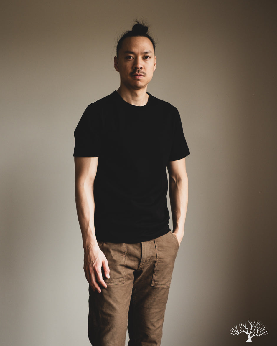 The Merz b. Schwanen 2M15 Black t-shirt is a solid medium-to-heavyweight t-shirt made with 100% organic cotton and made using vintage circular knitting machines. This jersey t-shirt is a solid alternative to their popular 215 t-shirt, with a slightly lighter fabric weight and side seams that may allow for some to have a better fit.