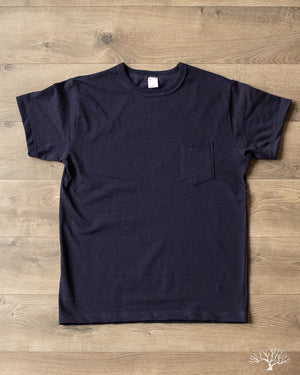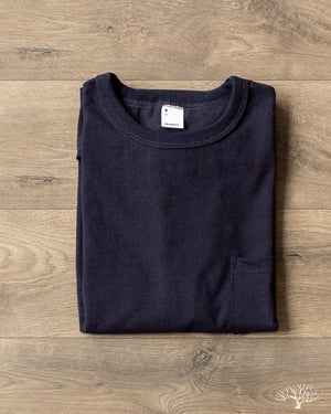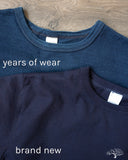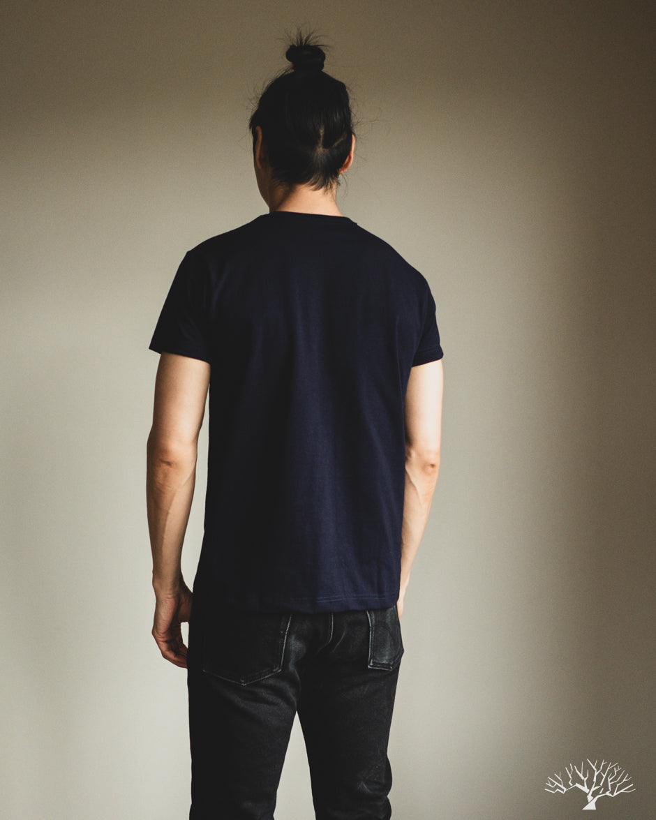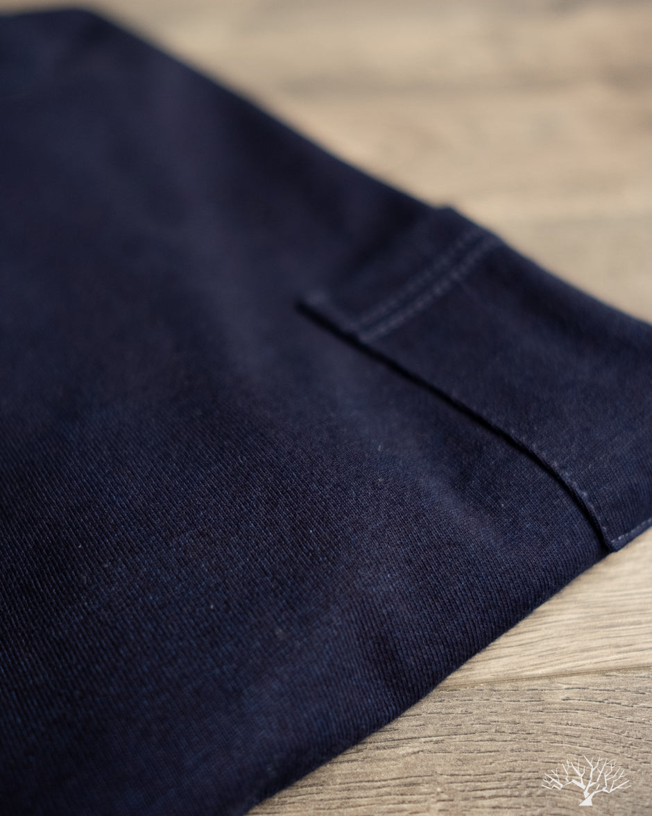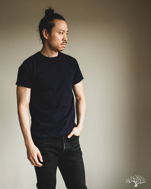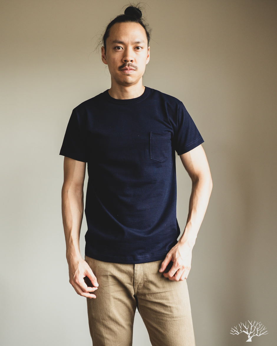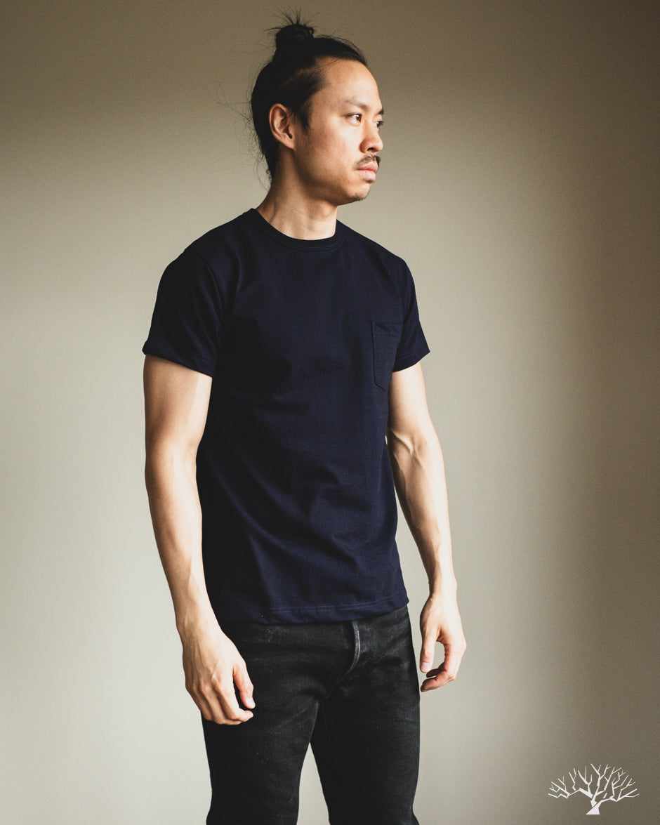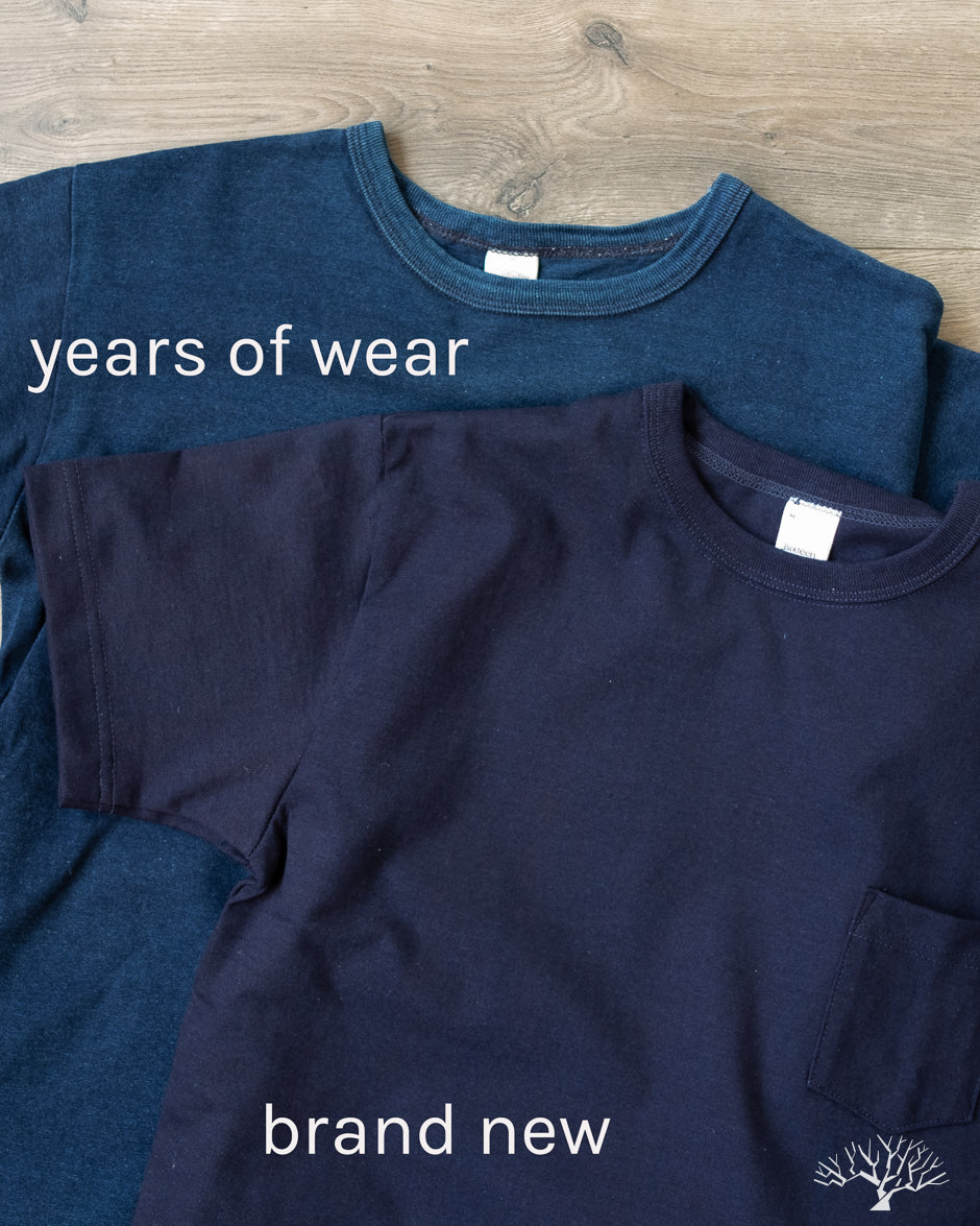 The 3sixteen indigo heavyweight pocket tee has a substantial feel and weight to them that looks just as good as they feel. The tee features a triple needle coverstitched collar that keeps the neckline tight over extended wears and doesn't sag. This specific tee is indigo-dyed and will lighten over time (see last two product photos for worn-in tee comparisons).