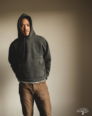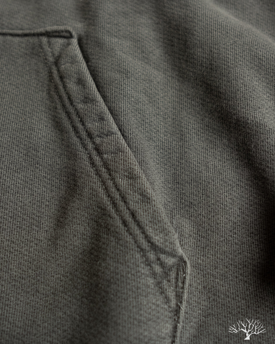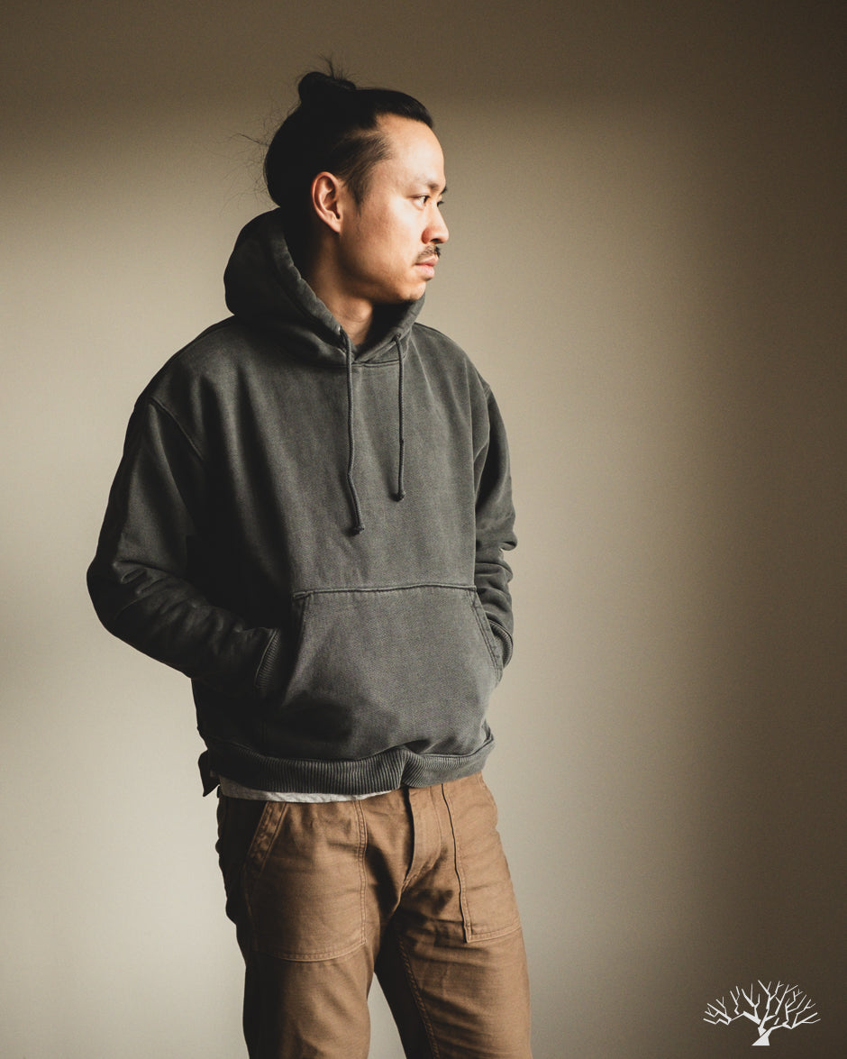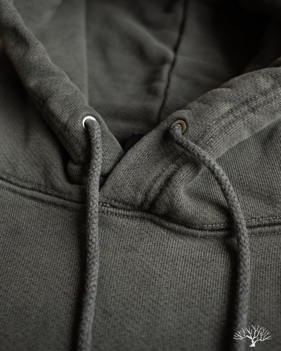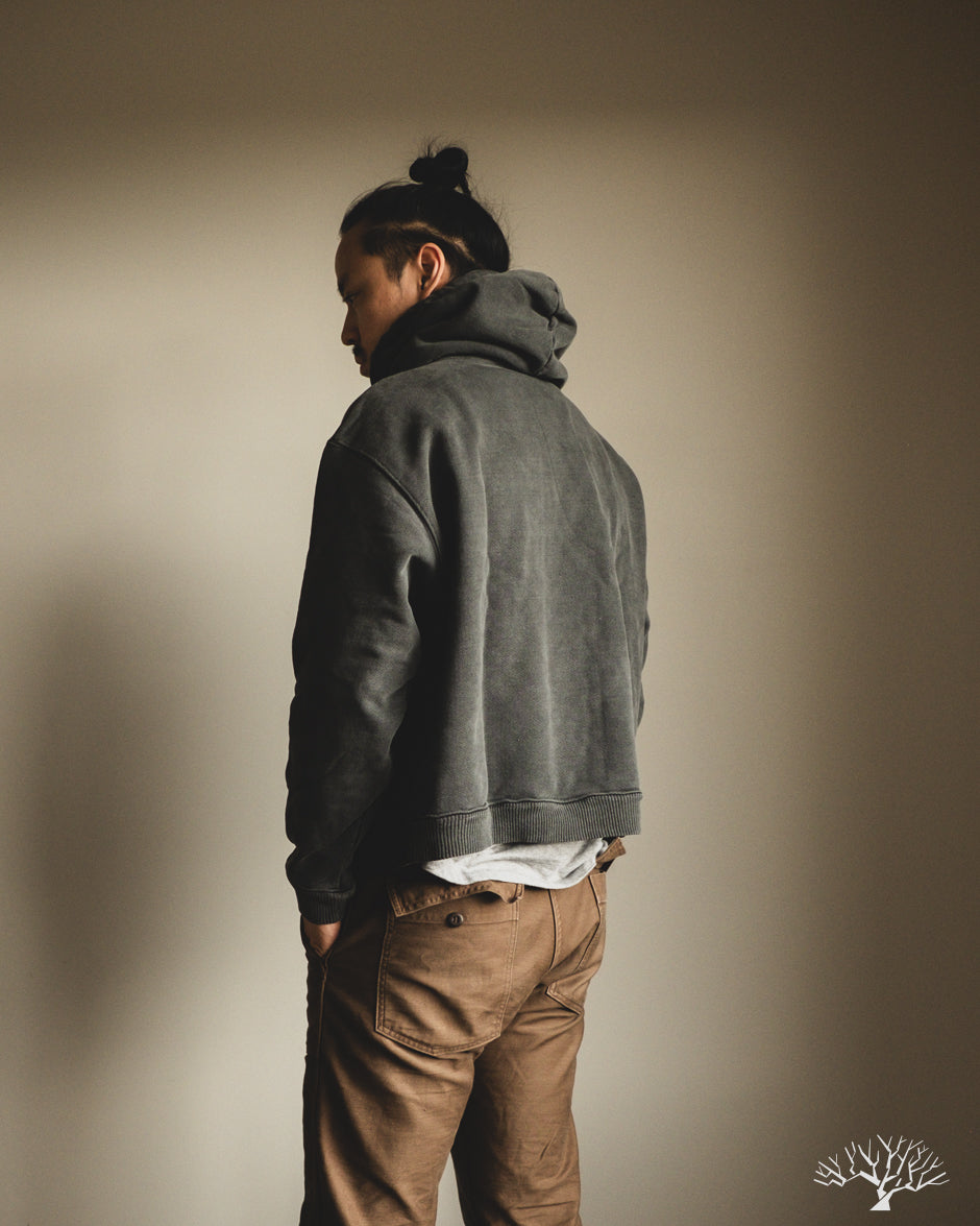 The 3sixteen Ultraweight Pullover Hoodie in Smoke is knit in a 32oz super (ultra) heavyweight French Terry fabric that has been garment dyed for a soft and easy-going piece. These 3sixteen hoodies are cut in a cropped and boxy fit with generous roomy throughout. The Smoke version has a slightly rougher hand compared to the Kombu Green version (which has a more soft and smooth hand).