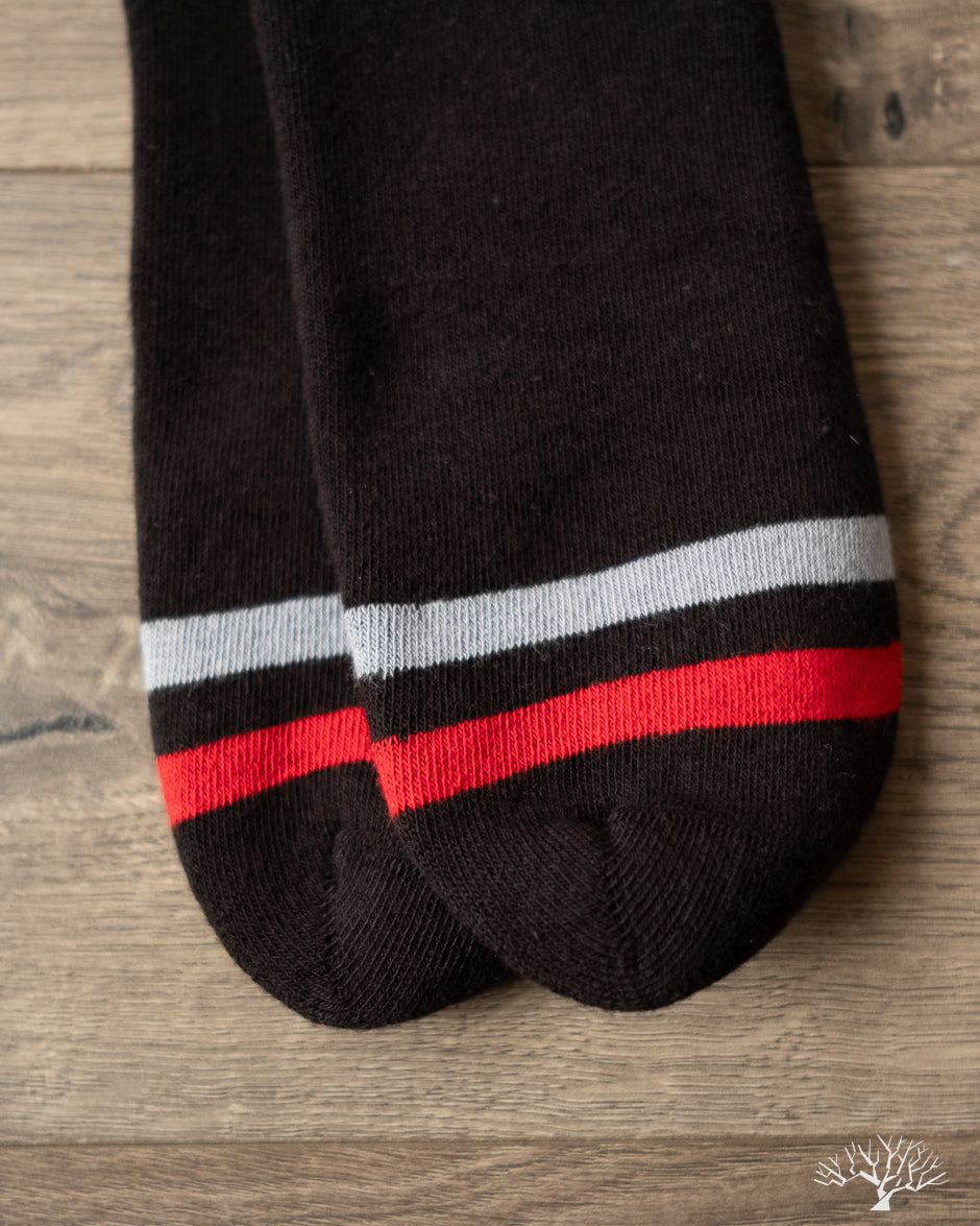 American Trench Kennedy Ankle socks are a popular nod to the iconic striped socks often sported by John F. Kennedy. These feature a bold striping at the toes for a mostly hidden and otherwise unassuming pair of ankle socks. Only when your footwear comes off are you pleasantly surprised with the nice stylish classic stripes.