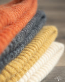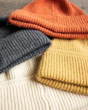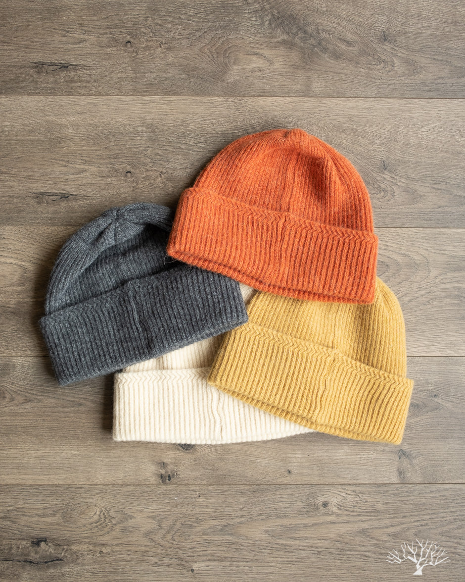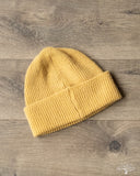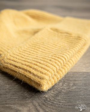Câbleami's Baby Alpaca Watch Cap in Yellow utilizes an even blend of alpaca and wool for a warm and rich beanie. You'll find the fabric on this to be a bit nappier than the cashmere, giving it a unique comfy look and feel.