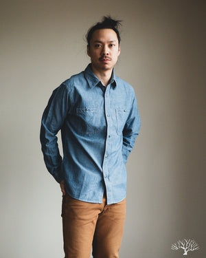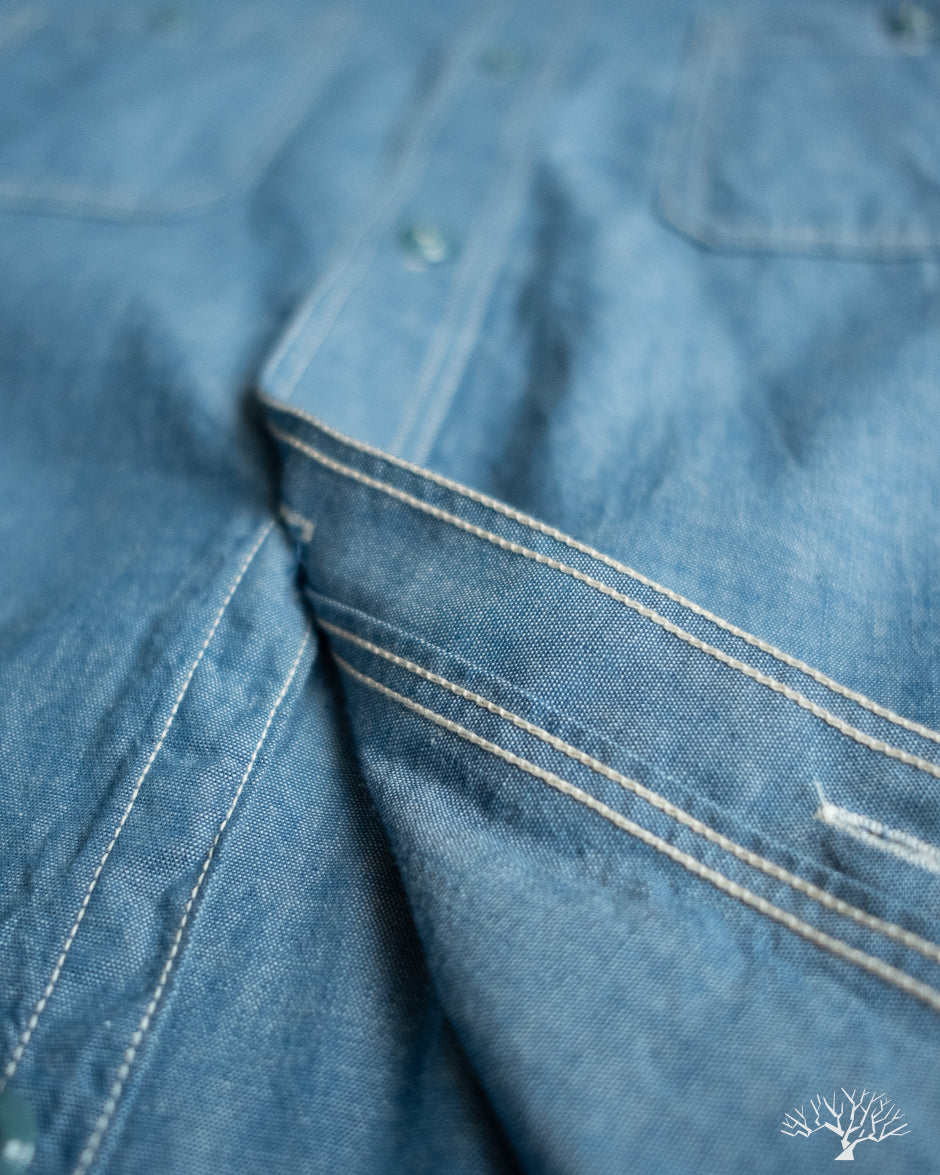 This UES Chambray Shirt is their take on this classic style, cut with selvedge chambray detailing and in a lightweight fabric. The UES Chambray Shirt is inspired from vintage 1930s work shirts, and the details are intended for a clean appearance. The raw material is made from a blend of American and Austrlian cotton in a 6.5oz chambray fabric, which will fade with wear and washes.