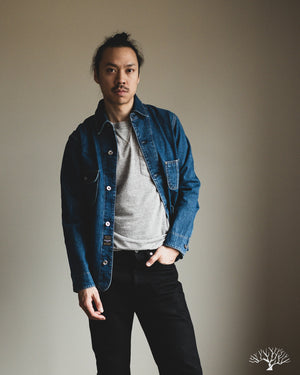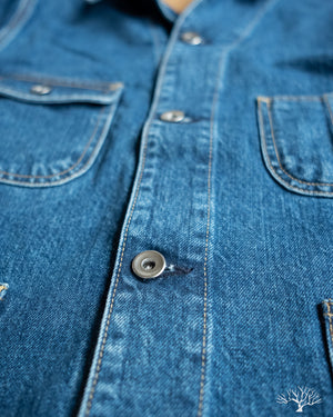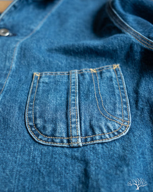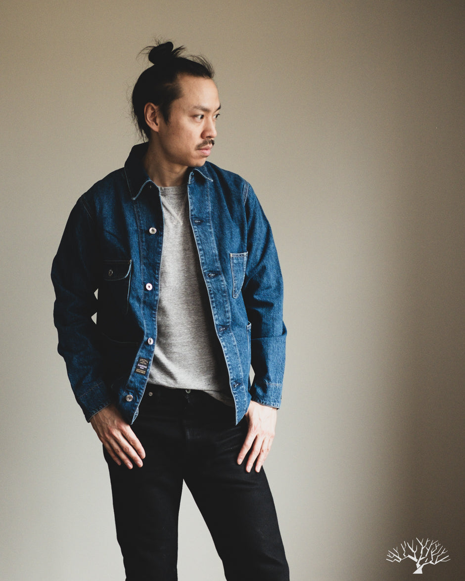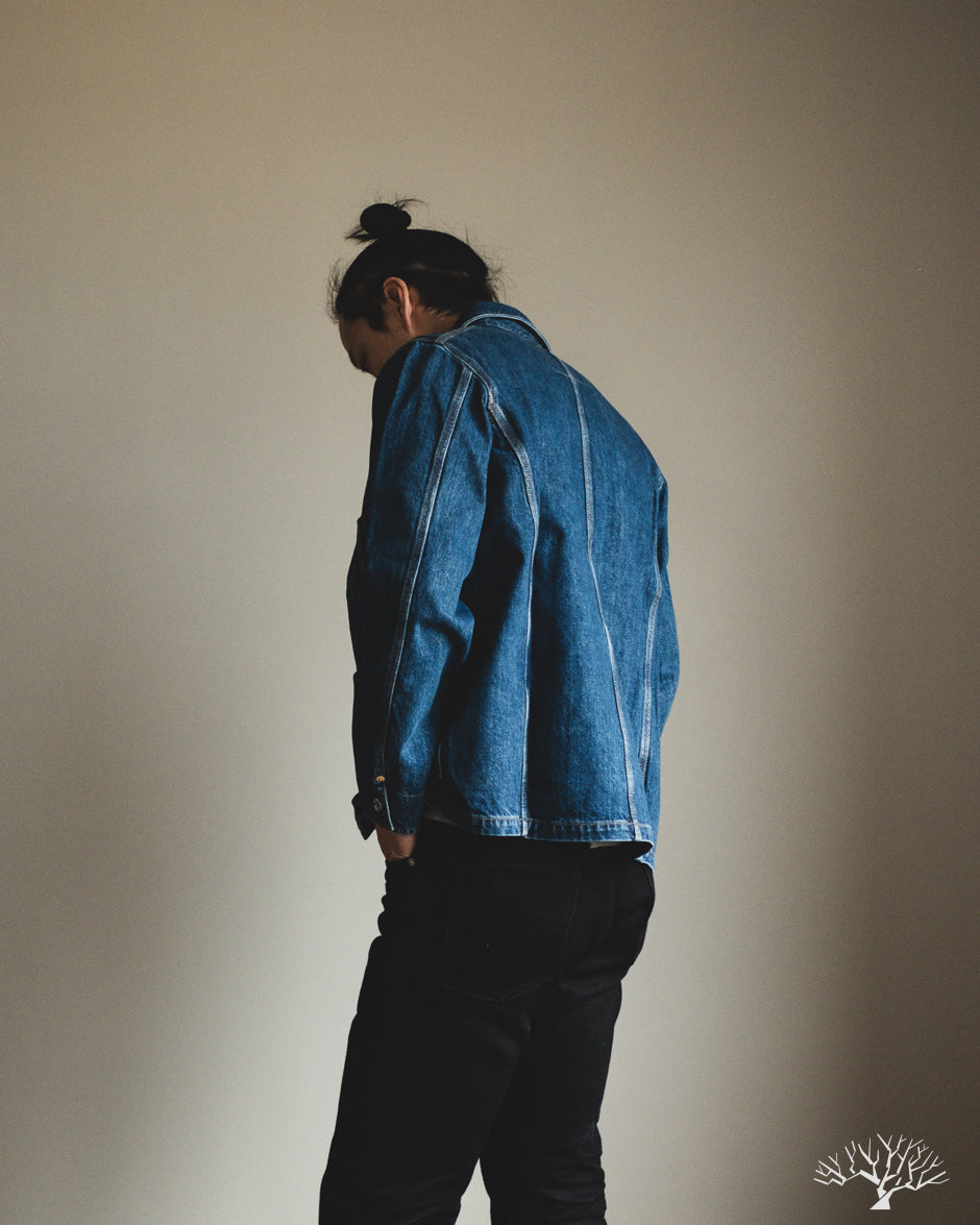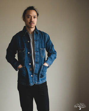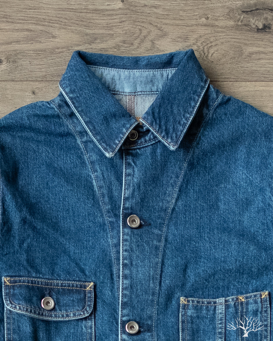 The C.O.F. Studio Railway Jacket comes in a chore coat style length and functionality. This indigo denim from Candiani Mills in Italy has a beautiful wash (6x) for a worn-in appearance and vintage charm. We love this jacket for the functional pockets inside and out, and solid details with its triple-chainstitched side seams and use of organic cotton for the denim. This has a nice modern aesthetic to it with the extended placket that curves into and under the collar.