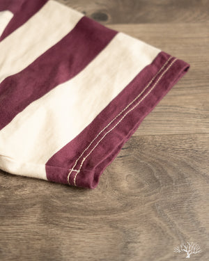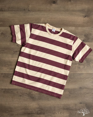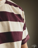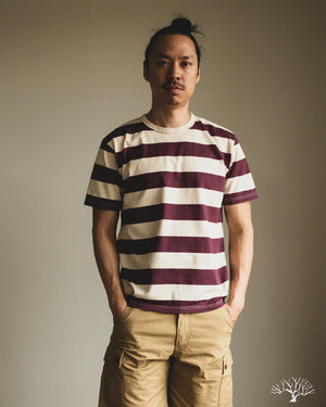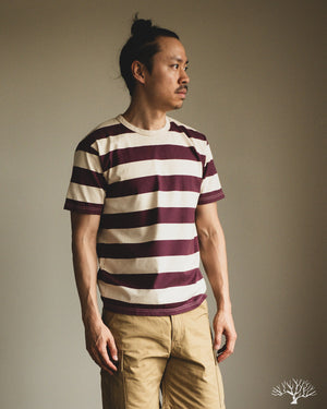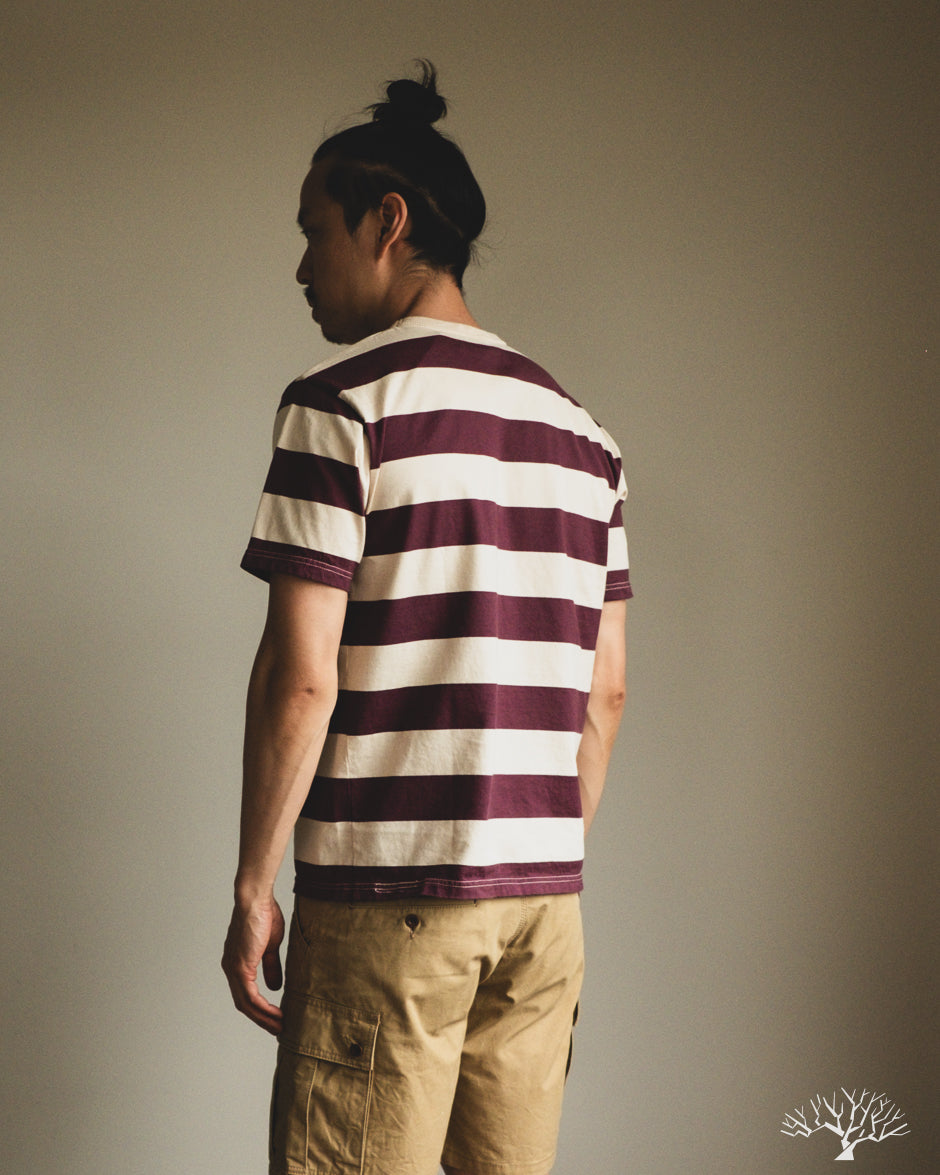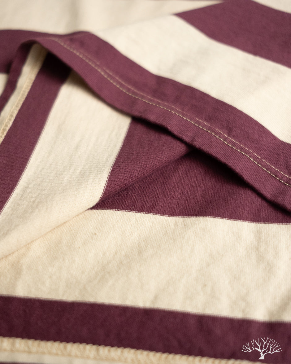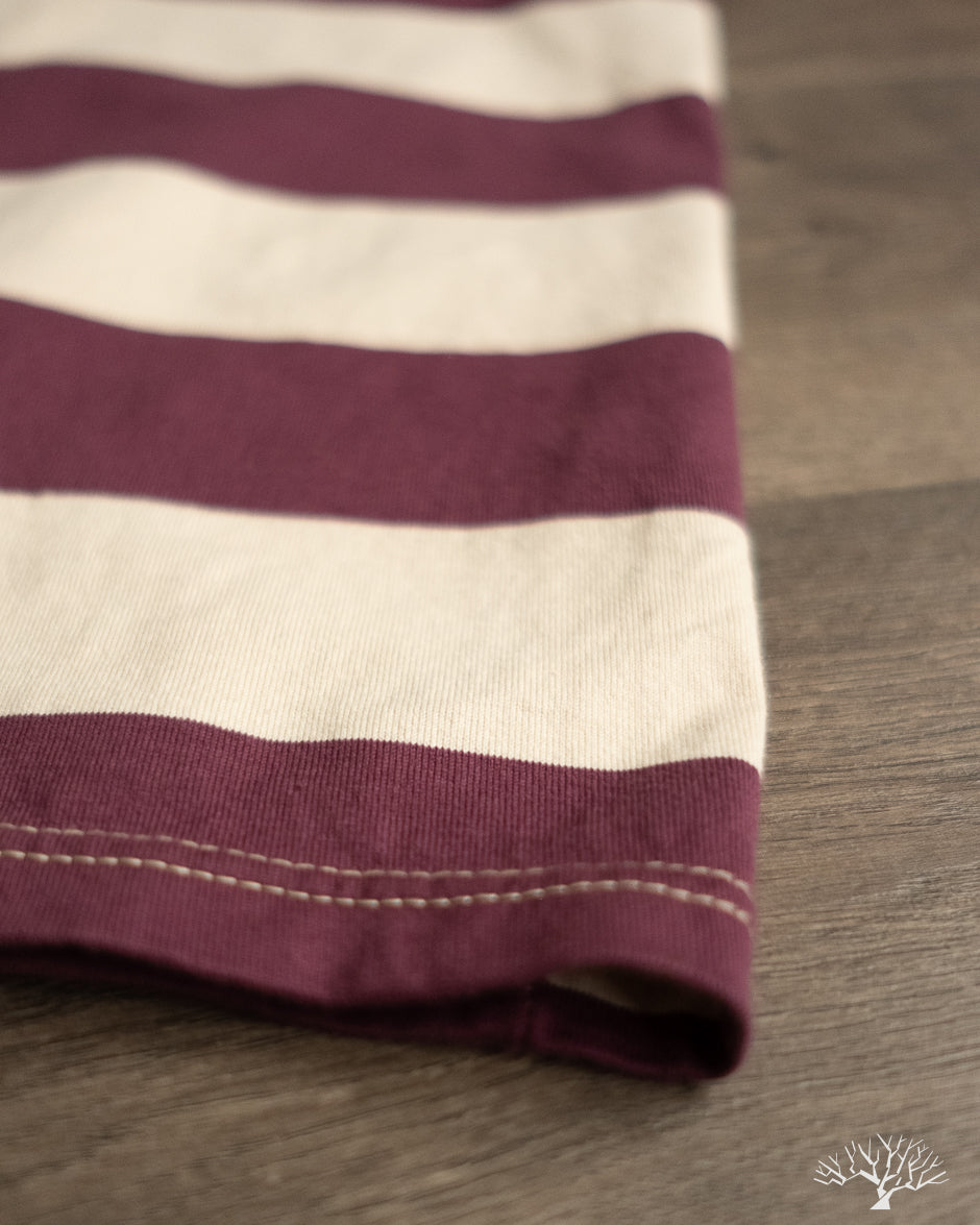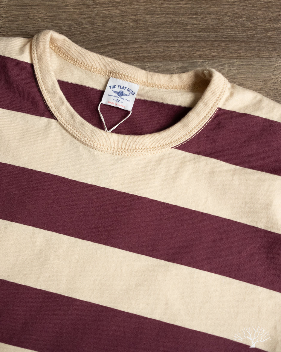 The Flat Head Border T-Shirts are a classic t-shirt with wide border striping, with attention to the sewing pattern to ensure a consistent and pleasurable appearance. The Flat Head uses a combed cotton fabric to provide a comfortable and smooth hand that is still durable and thick. Their never-sag triple-stitch neckline provides a sturdy collar to accompany the sturdy fabric.