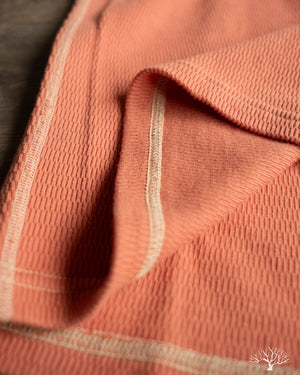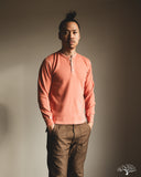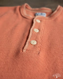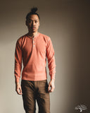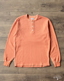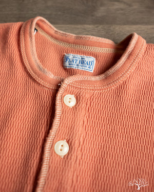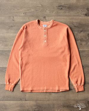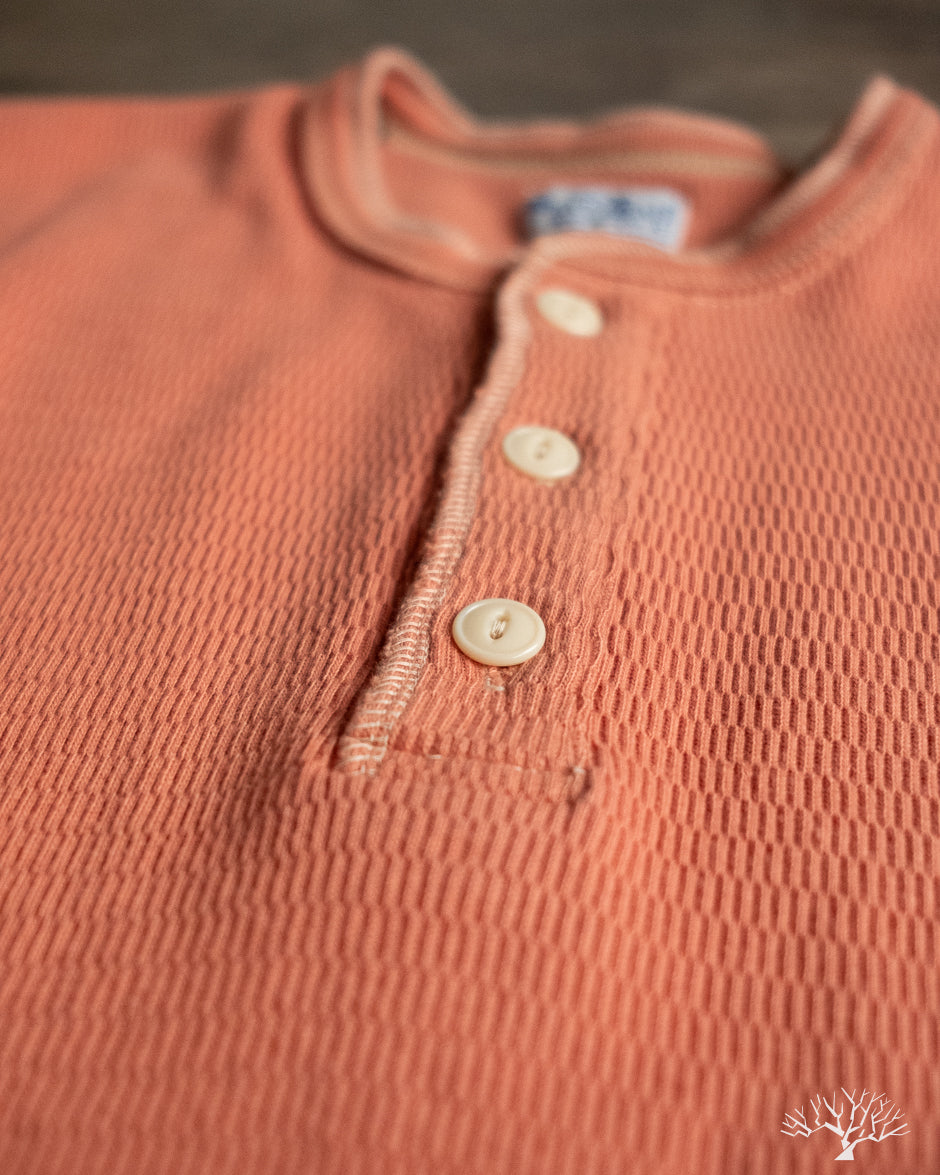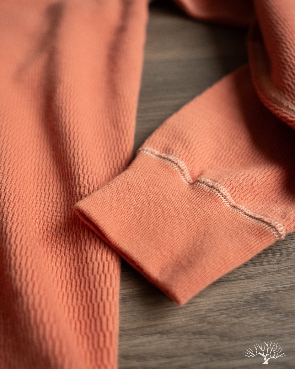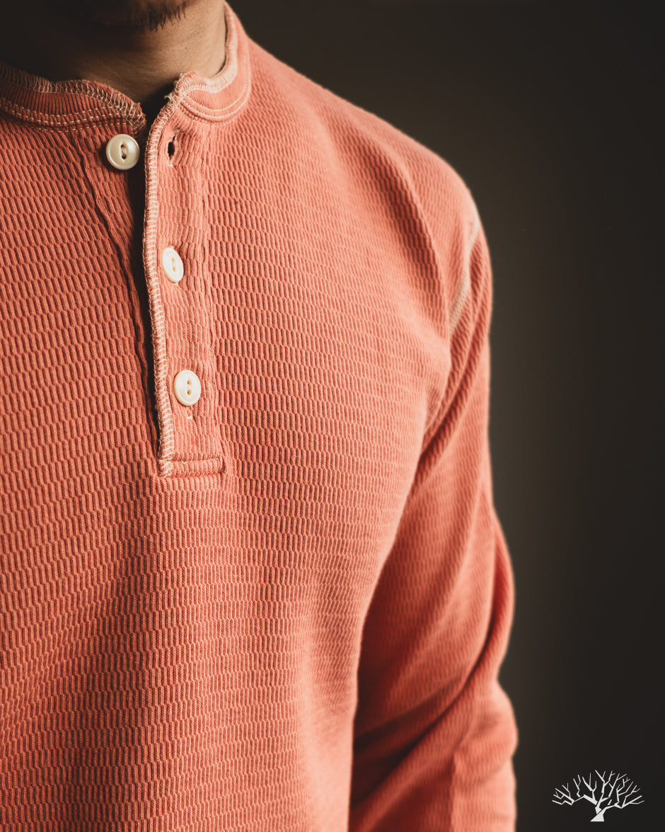 The Flat Head Waffle Knit Henley Thermal in Light Orange is a comfortable and excellent warming layer that is soft and stretchy, and can be versatile as both a base layer or as your primary layer. These have a beautiful micro-waffle structure with high elasticity to make this comfortable in the width (chest/torso), but still appropriate in the length without shrinking or stretching too much. These are constructed with a 1960s Union Special flat seam machine for the side-seams, making this an excellent thermal that will lay flat against your body with no bumps.