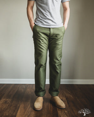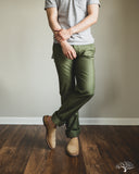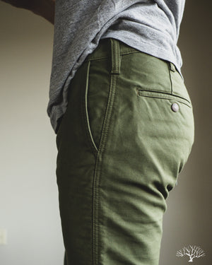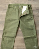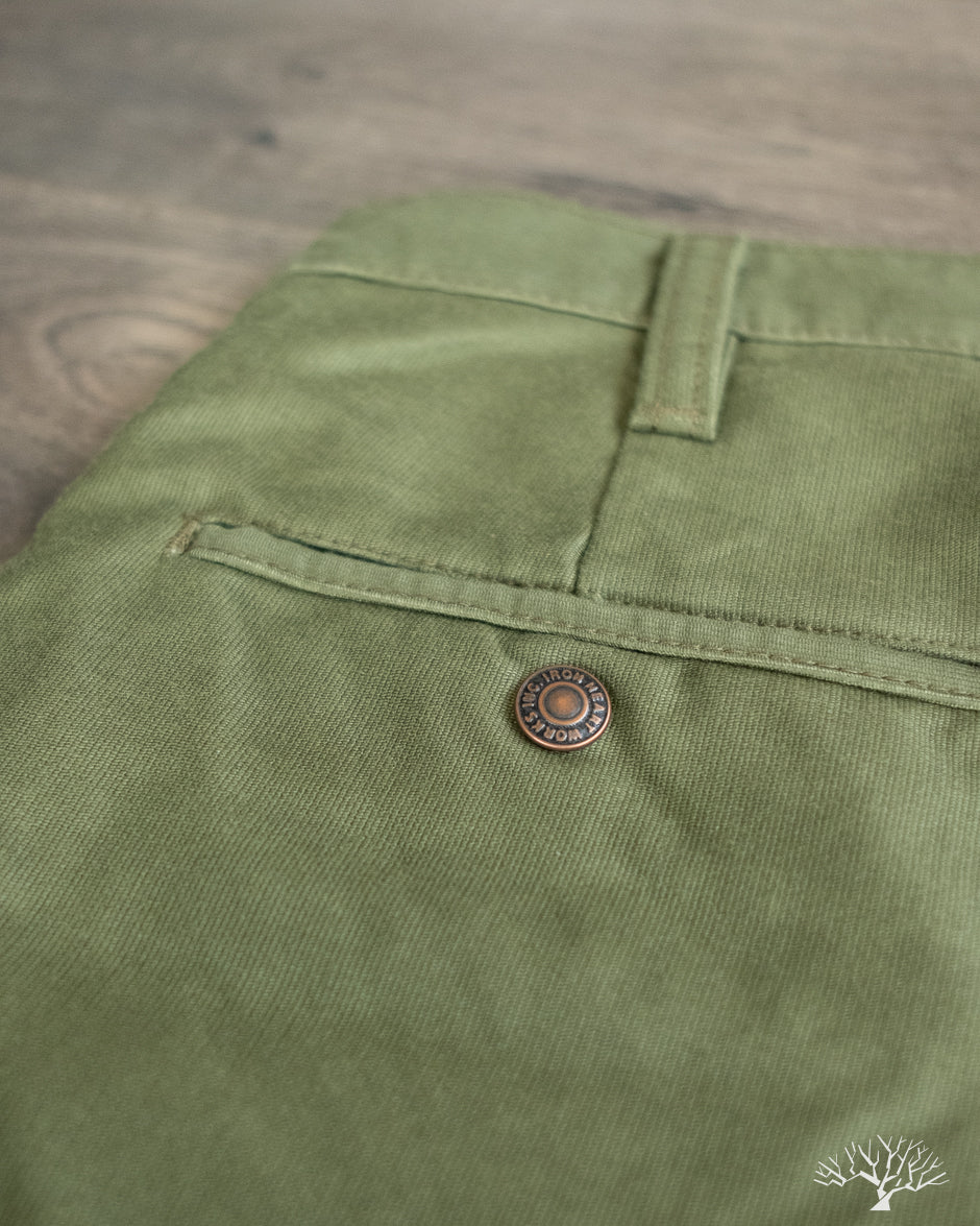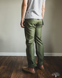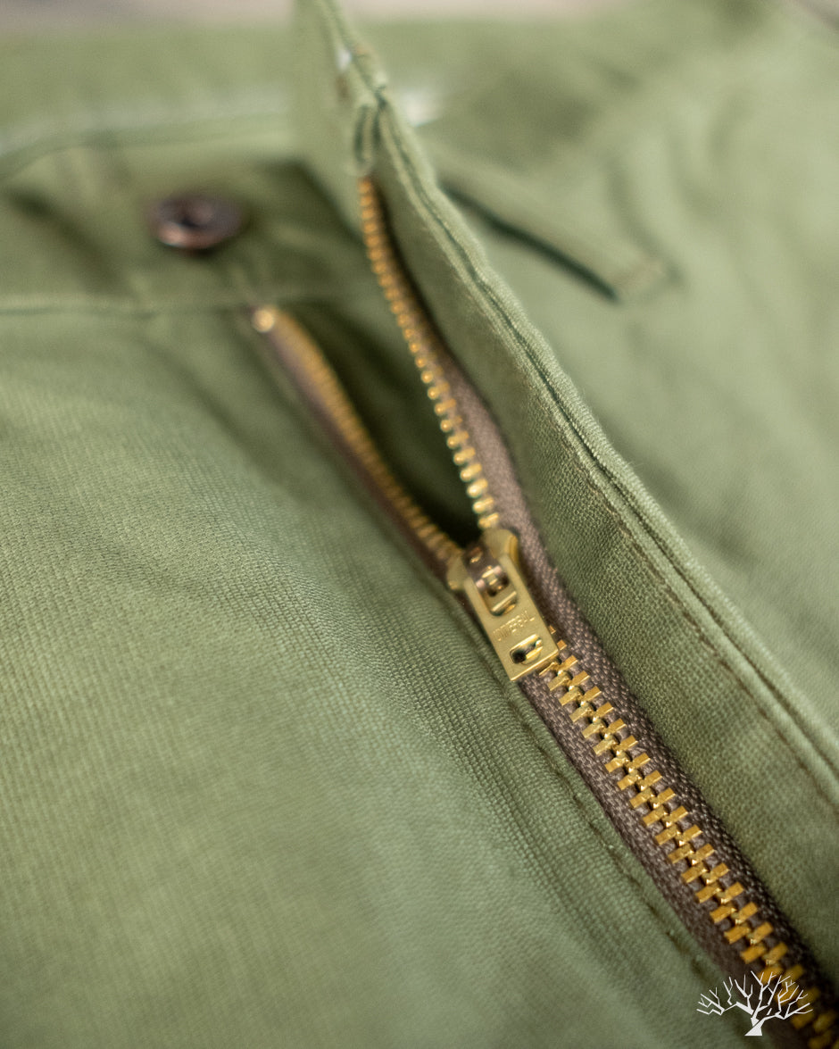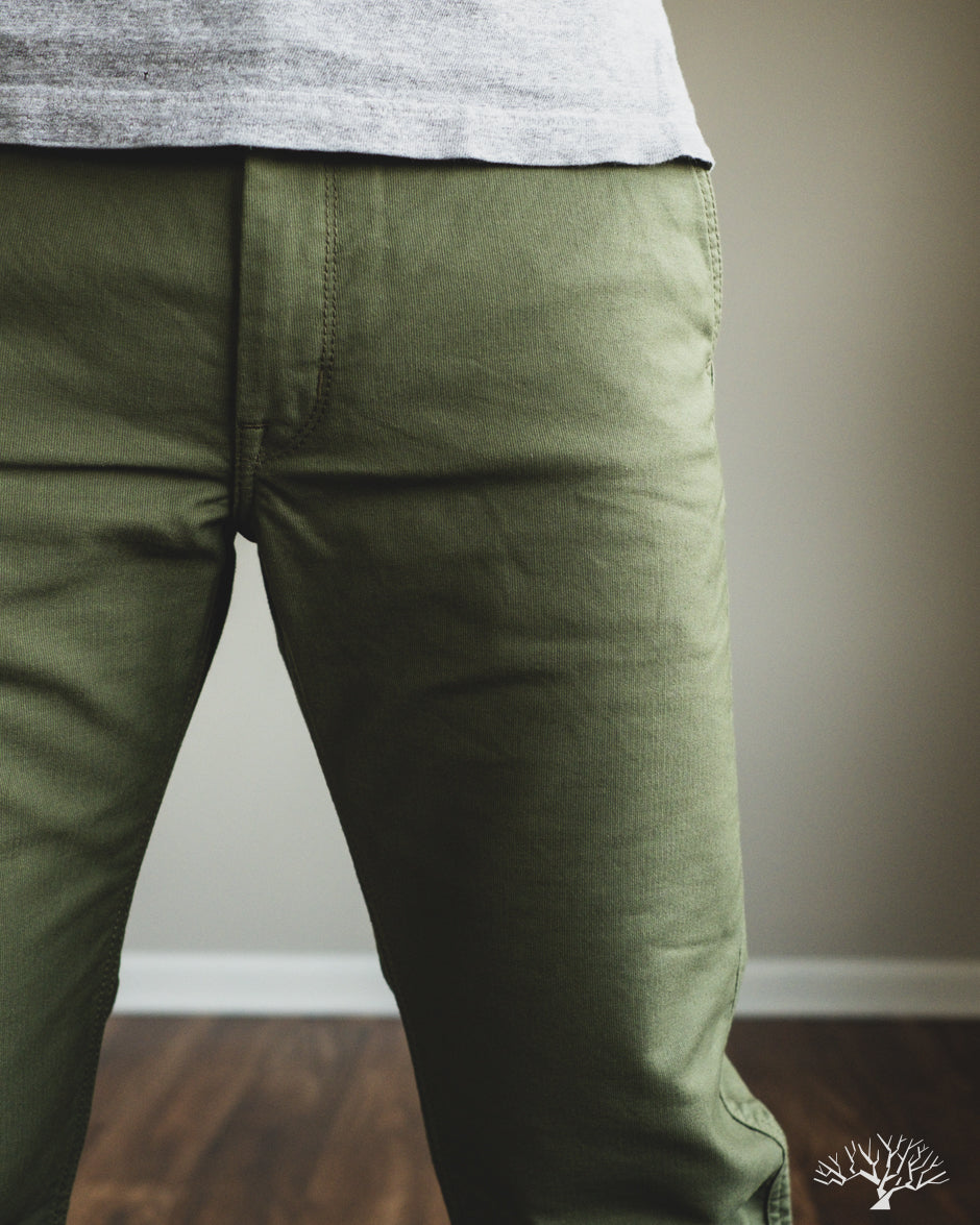 Iron Heart's 11oz Cotton Whipcord Work Pants in Olive come in a medium rise classic straight cut, a perfect pair that will transcend the test of time. The 11oz whipcord fabric is durable and heavy duty, yet with a slight sheen and smoothness to the touch. Iron Heart has designed this pair with a tightly woven cotton twill to make it extra hard-wearing and resilient to scratches and improved wind resistance.