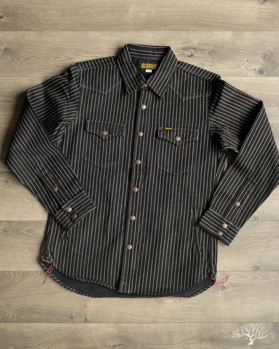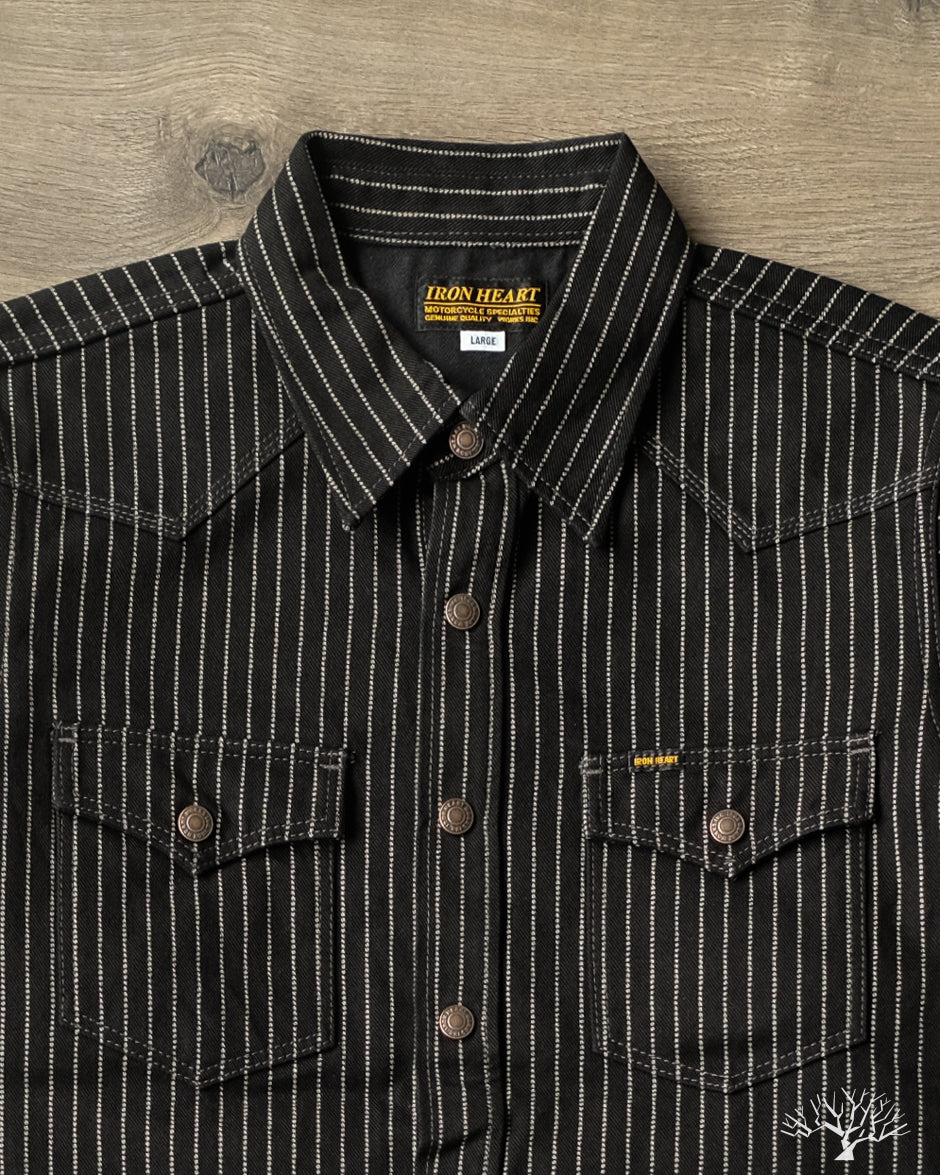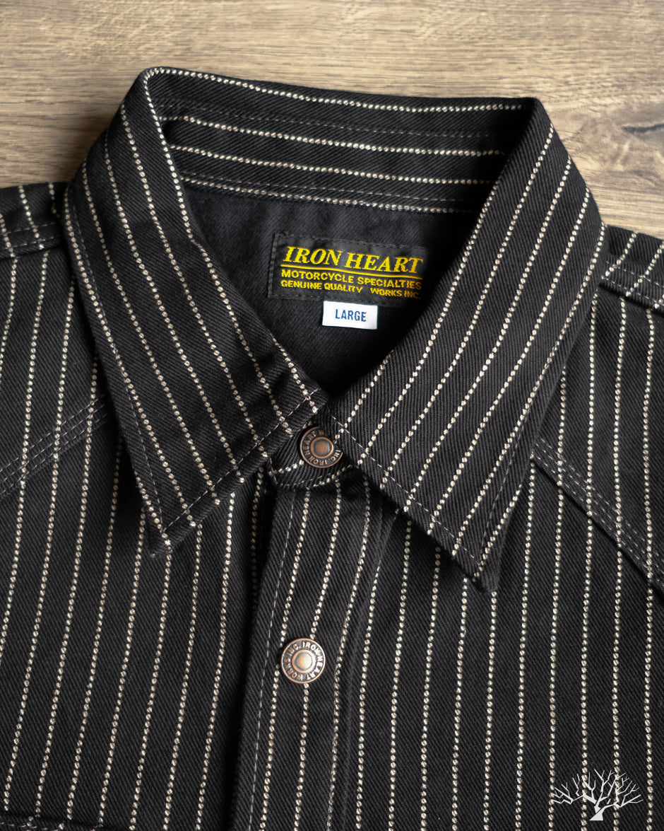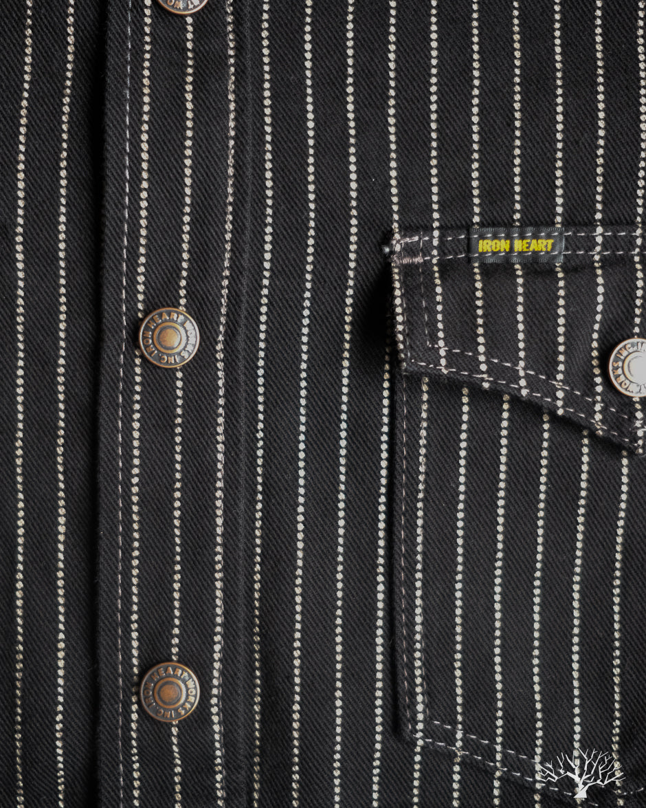 The newest addition to the Iron Heart 12oz Wabash family is this Black Wabash CPO Shirt. The Iron Heart Wabash fabric is known for its incredible fades that bring to life this vintage style hailing from the workwear days of the early to mid 1900s. Iron Heart uses a 12oz Black rope dyed Japanese wabash fabric that is sturdy in the hand but will soften up with wear. This CPO Shirt version comes with a slightly longer body, side entry handwarmer pockets, and oversized copper button snaps.