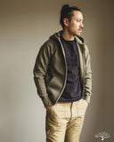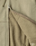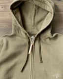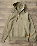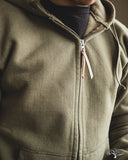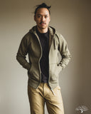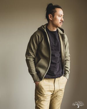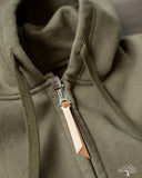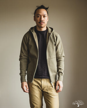 Iron Heart's Ultra Heavyweight Loopwheel Zip Hoody in Olive offers excellent comfort and durability for a zip sweat you can be sure will last you for many years to come. These are perfect for that evening walk with the dog, that 5am brisk walk from the parking lot to the gym, or just an at-home lounge piece. These hoodies feature loopwheel fleece woven in Wakayama at one of the few loopwheeler factories in the world, and clocks in at a thick 14oz weight. Constructed very well with a Union Special flat stitched seam and finished with two front pouch pockets and a two way zipper.