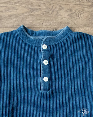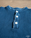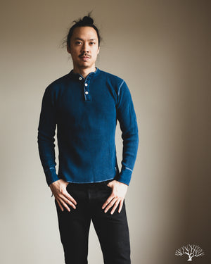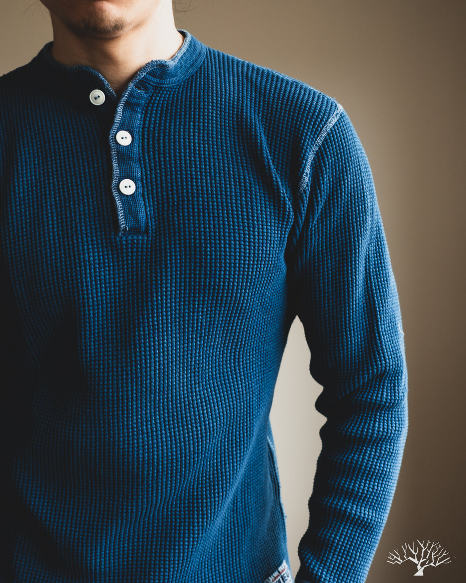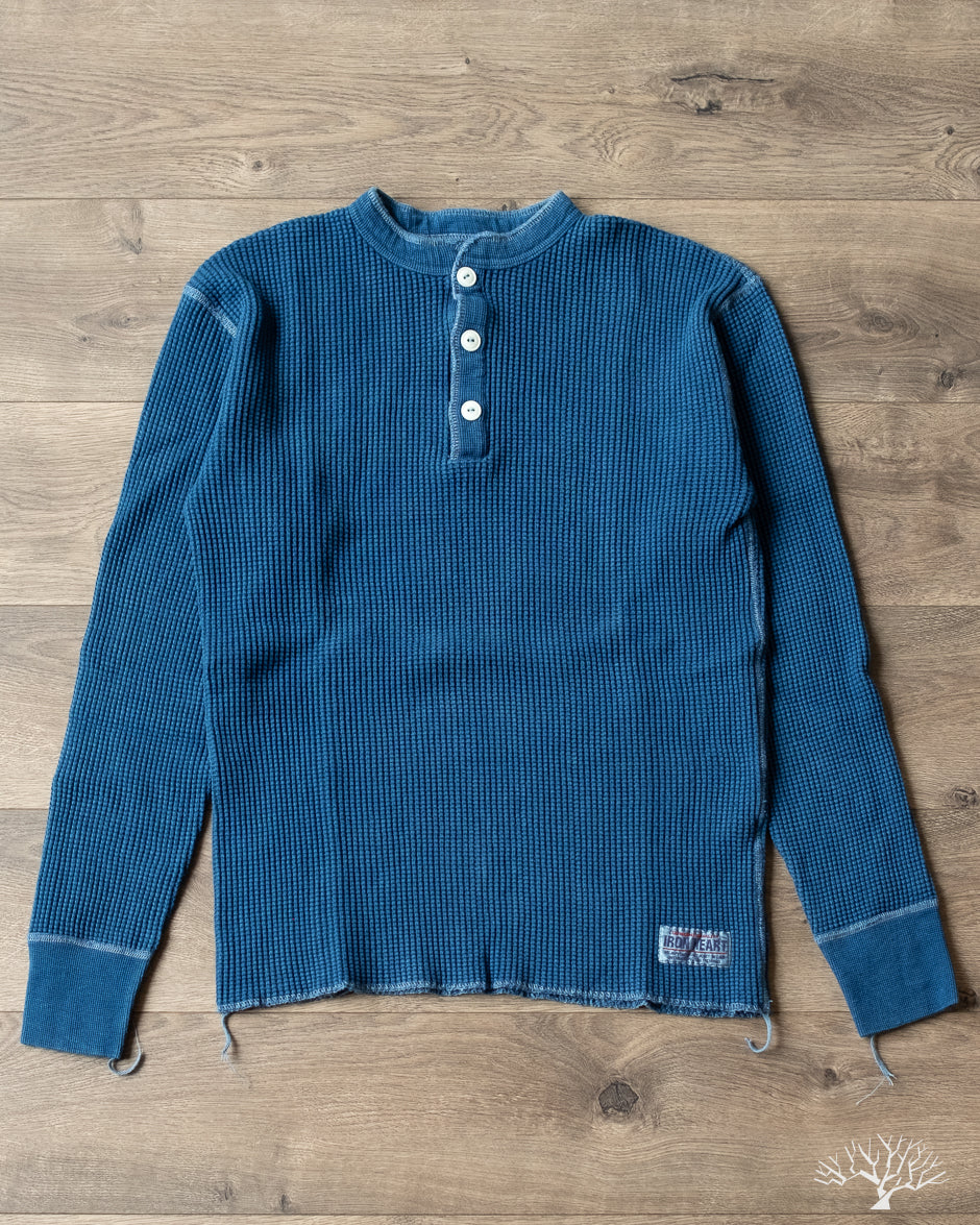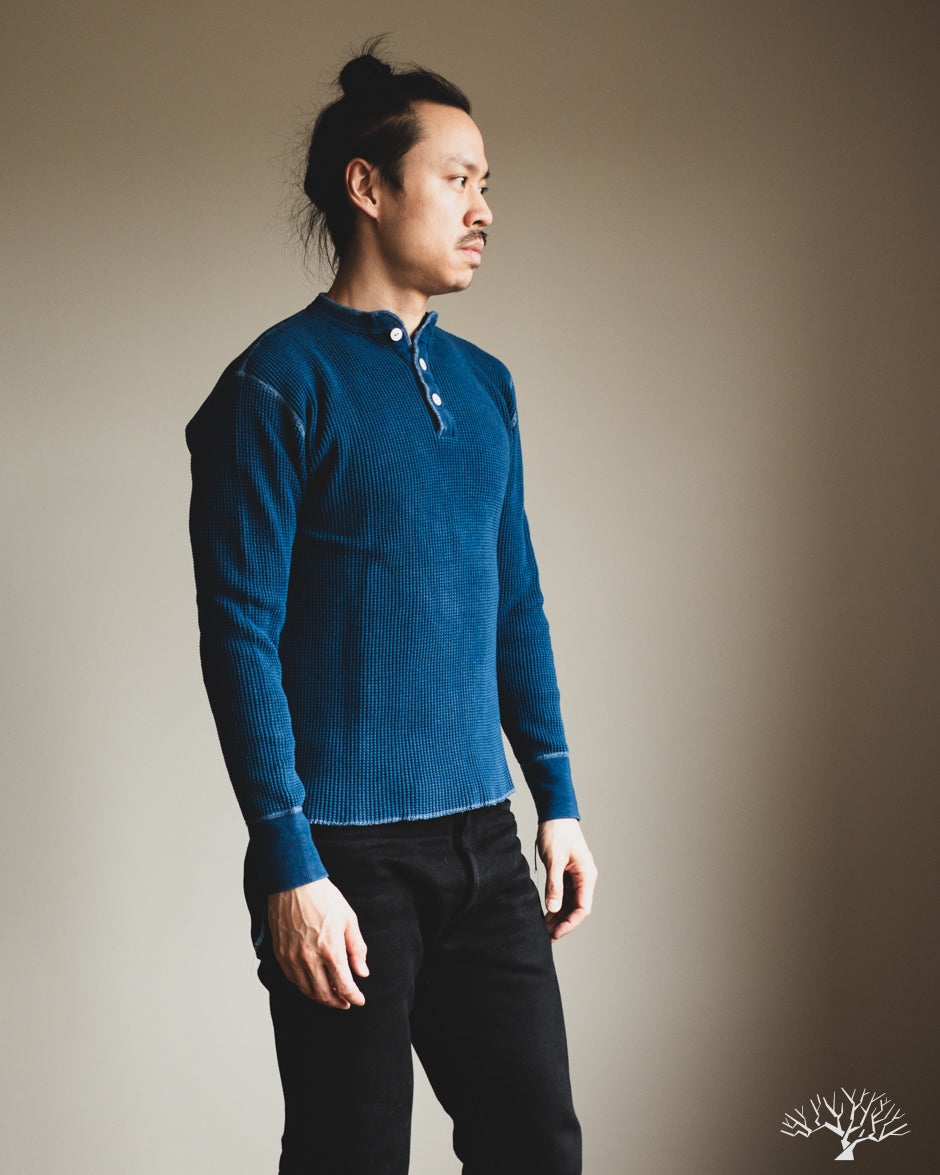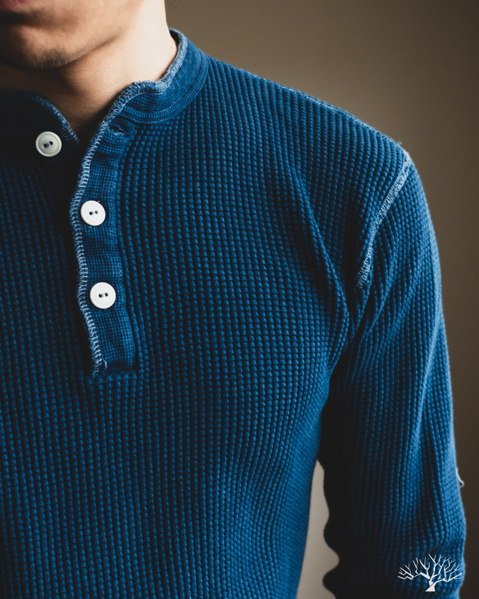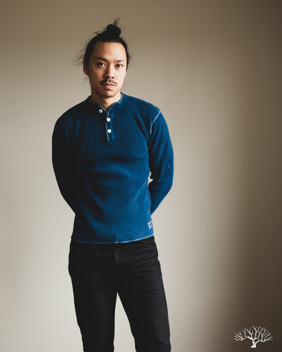 Iron Heart's classic Henley thermal makes its return in this beautiful indigo-dyed version. The IHTL-1213-IND uses their base 100% cotton waffle knit thermal and dips it in some indigo dye to create a deep indigo tone. All the same thermal characteristics you've come to love from the Iron Heart thermals, now in an indigo-dye. The Henley pattern makes these a little easier to get on over the head, but also add some details to your overall outfit. These make wearing the thermals as a standalone that much better!