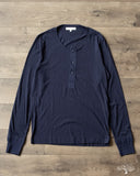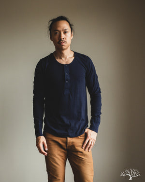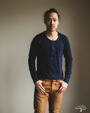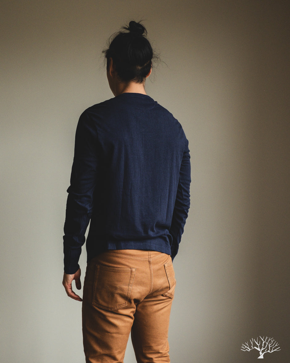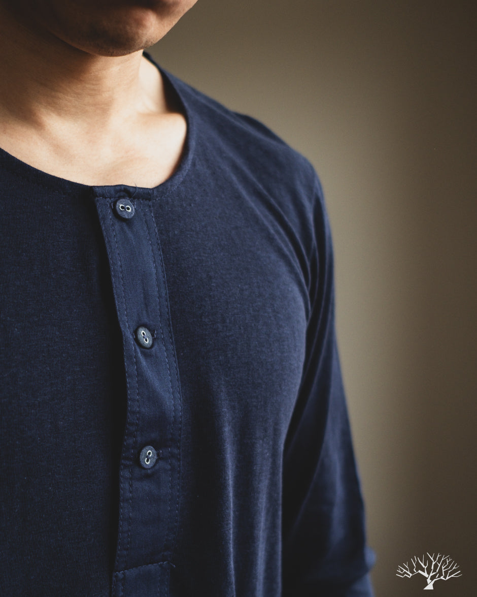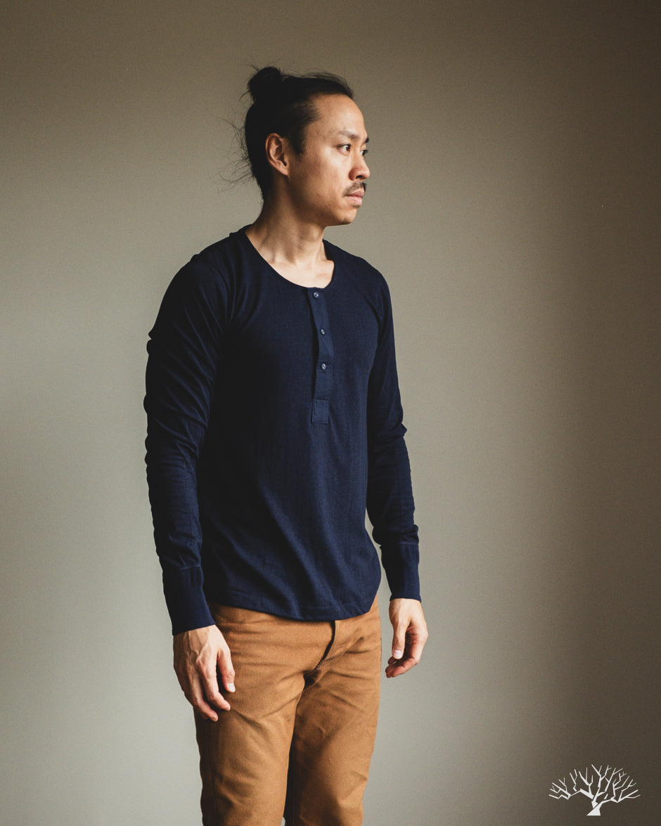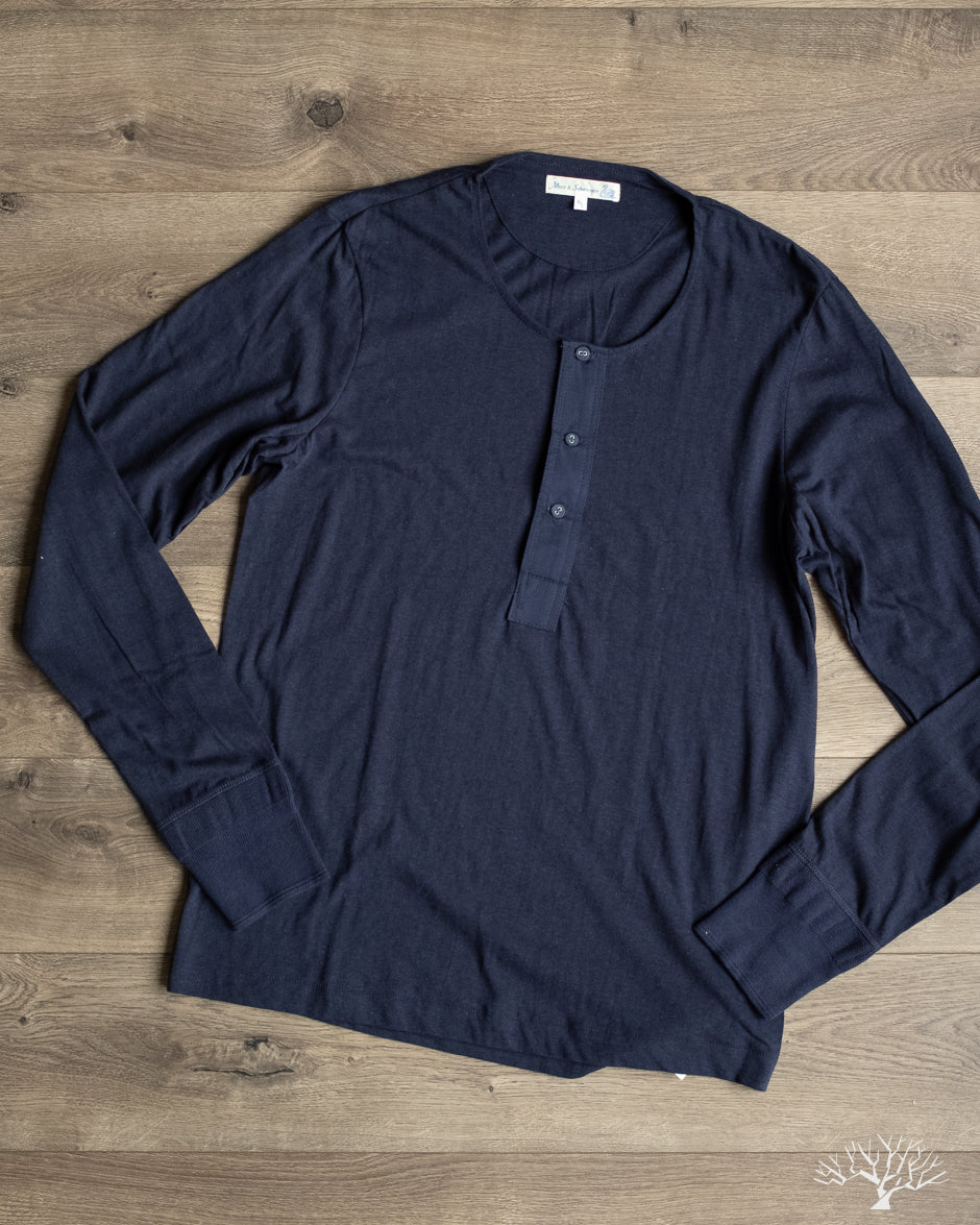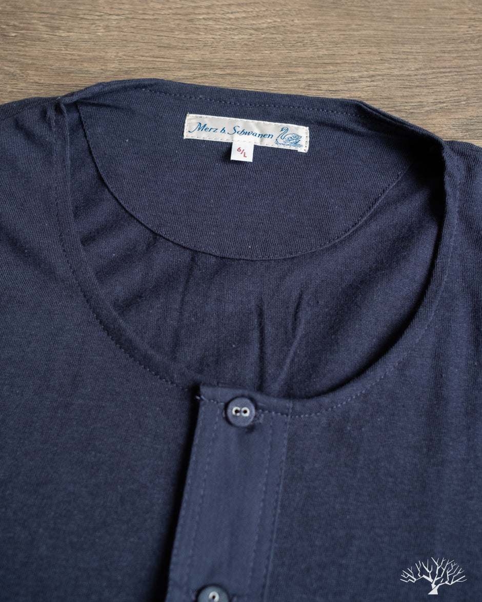 Merz b. Schwanen's 102 Vintage Henley in Ink Blue takes inspiration from the original 1911 "worker button-up shirt" that jumpstarted all of Merz. It features an authentic neckline with the collar being turned over by hand twice - the exact way how the neckline was processed over 100 years ago. This is an absolute favorite of ours for its form-fitting look and vintage aesthetic.