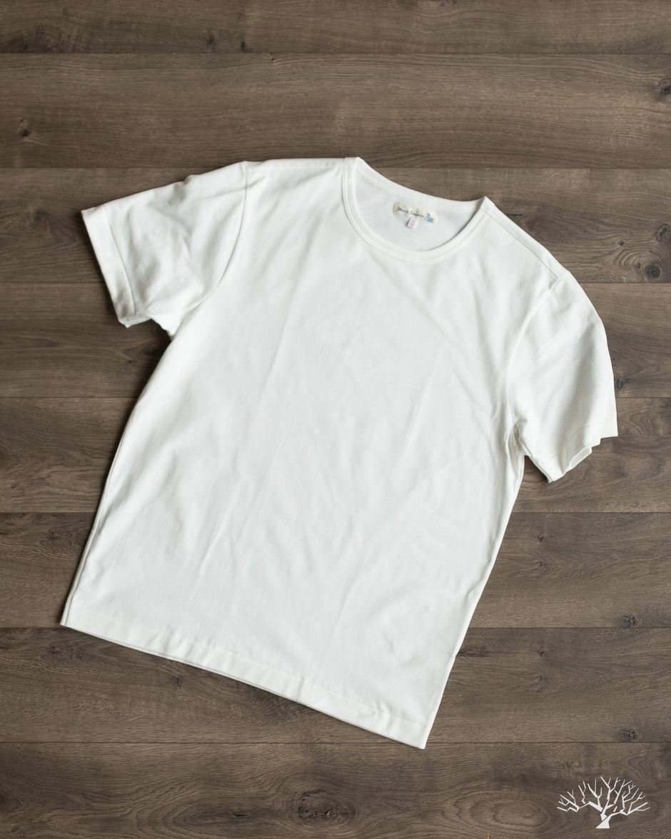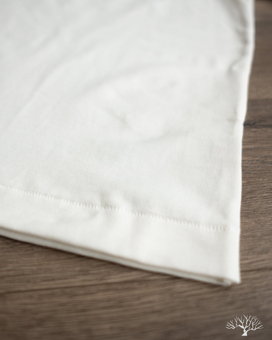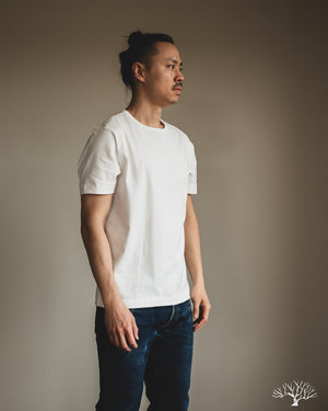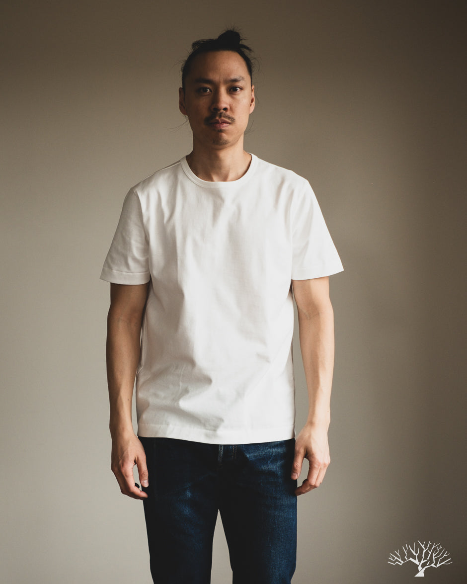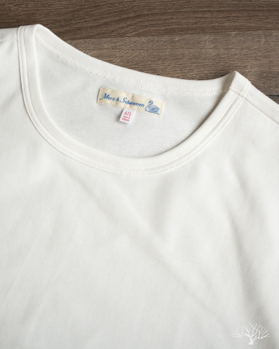 The Merz b. Schwanen 2M15 White t-shirt is a solid medium-to-heavyweight t-shirt made with 100% organic cotton and made using vintage circular knitting machines. This jersey t-shirt is a solid alternative to their popular 215 t-shirt, with a slightly lighter fabric weight and side seams that may allow for some to have a better fit.