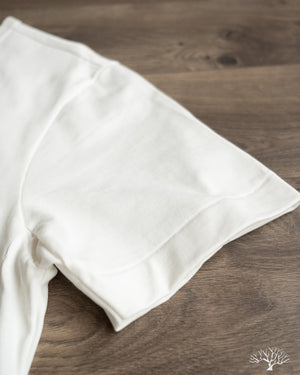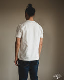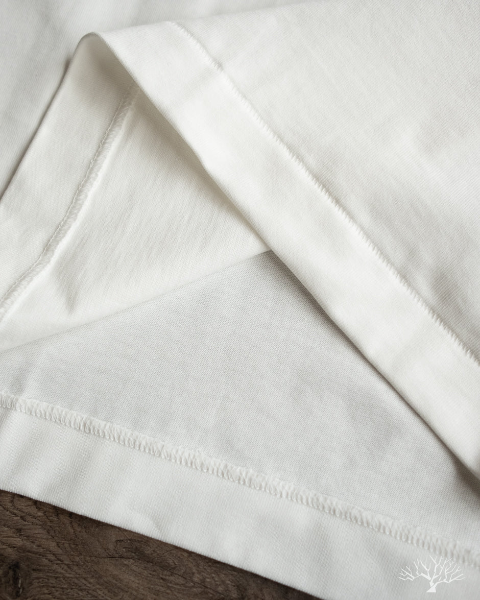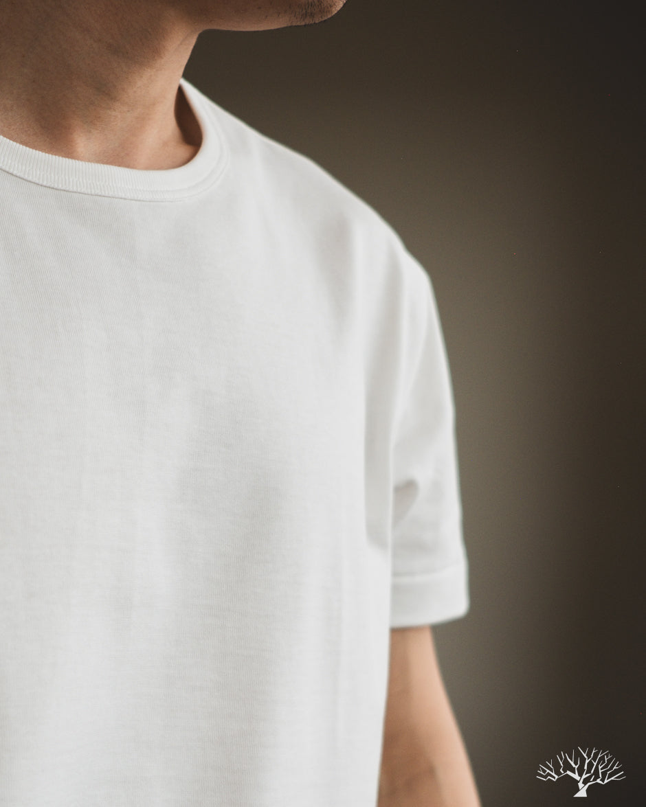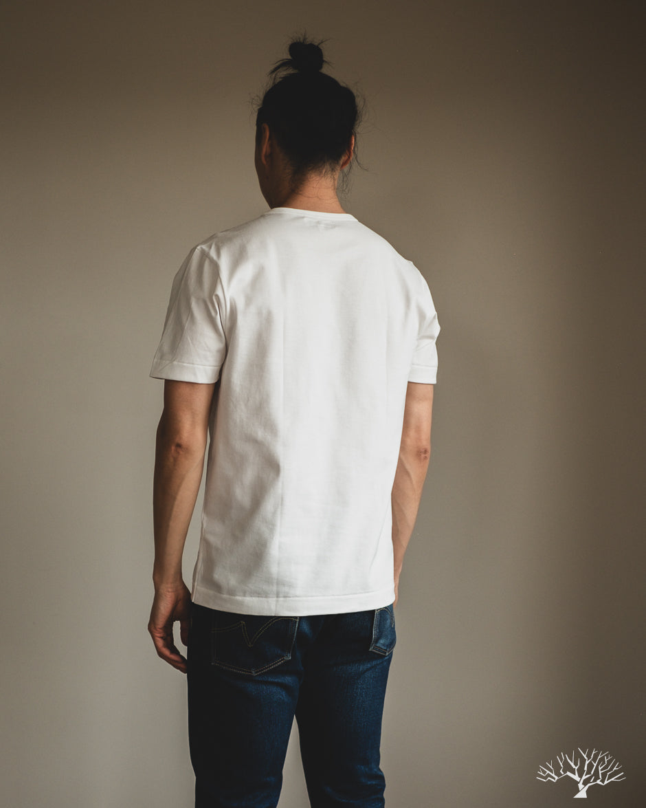 The Merz b. Schwanen 2M15 White t-shirt is a solid medium-to-heavyweight t-shirt made with 100% organic cotton and made using vintage circular knitting machines. This jersey t-shirt is a solid alternative to their popular 215 t-shirt, with a slightly lighter fabric weight and side seams that may allow for some to have a better fit.