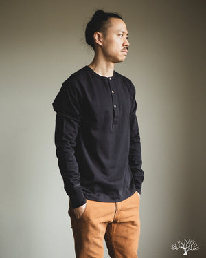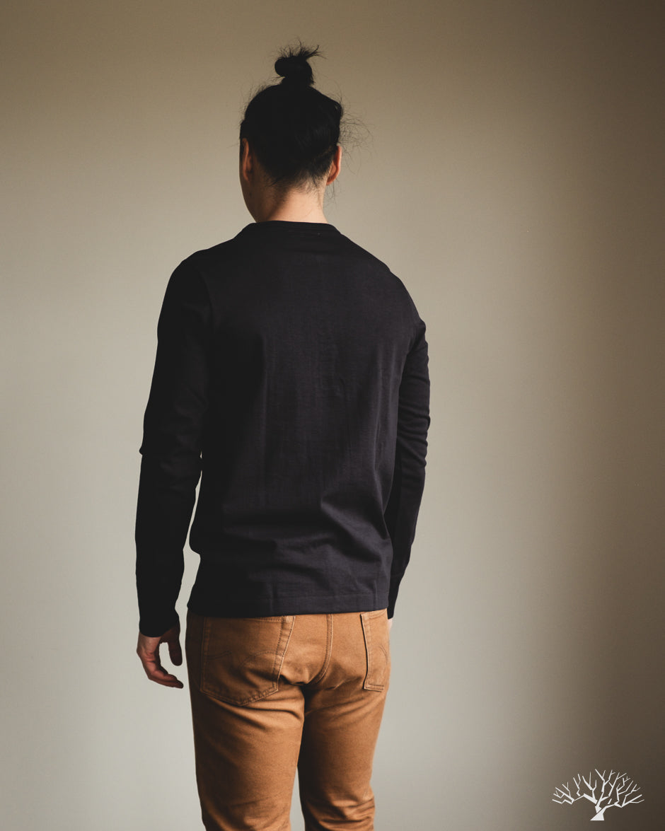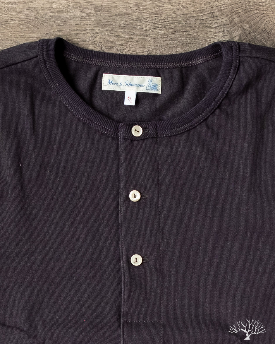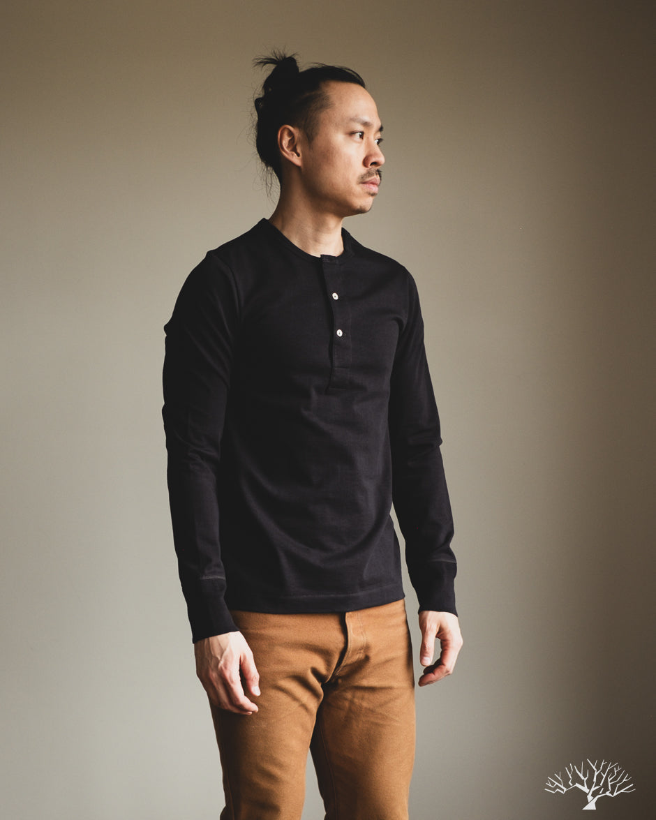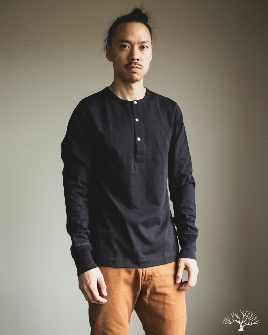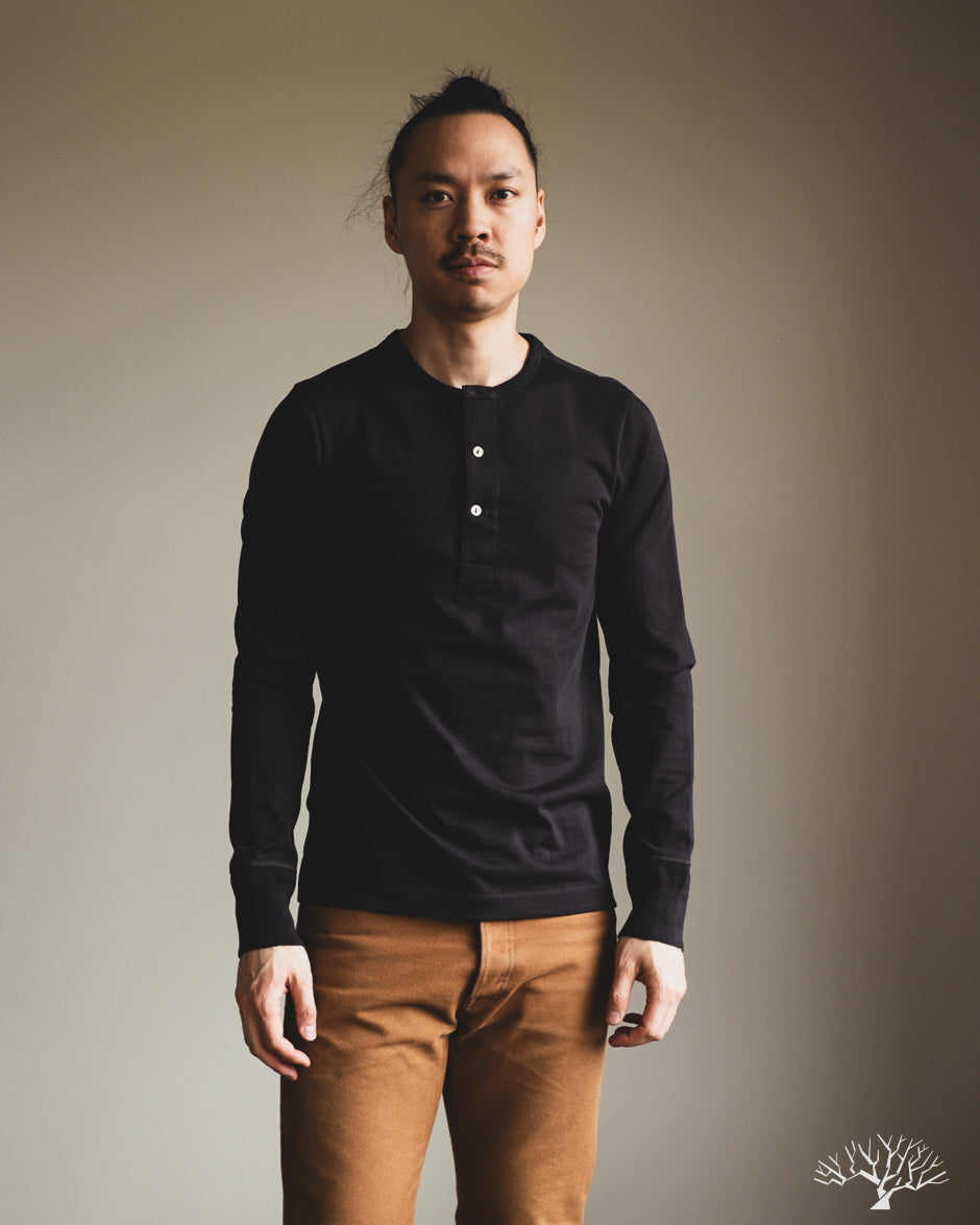Merz b. Schwanen's (206) Long Sleeve Henley is arguably the most popular henley on the market due to their use of 100% organic cotton in a weight that strikes the perfect balance between thin and thick, and coming in a slim silhouette. The henley is a year-round article of clothing that works well as a base layer, or also as the primary layer during warmer months. These henleys are Merz's claim to fame and have that vintage look that will make this henley stand out among all the others. Made on original loopwheelers in Germany-one of two remaining loopwheeler operations in the world, the result is a seamless tubular fabric that will be your most comfortable henley. Shown here with the Railcar Fine Goods Camel Flight Trousers.