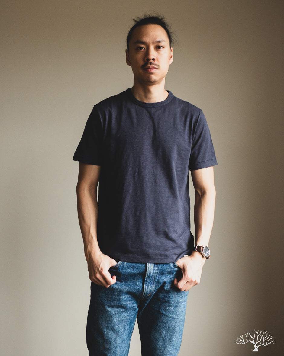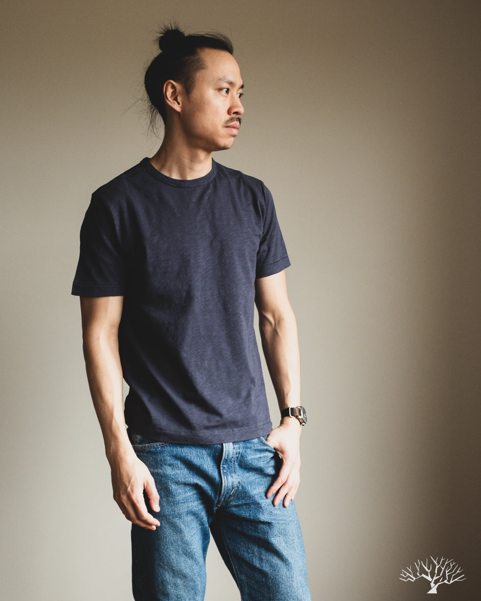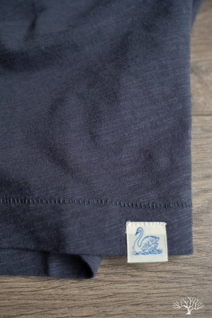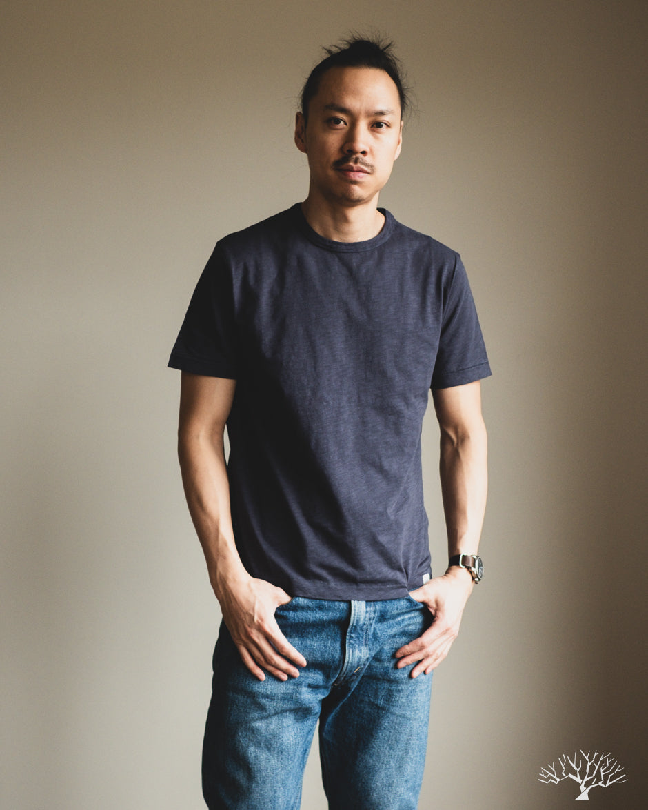 Enjoy this Slub Pima Cotton tee in a lovely Denim blue, from Merz b. Schwanen's Good Basics line. These relaxed fit tees have an excellent soft and casual look and feel with a bit of slub to the texture. The extra-long fibers due to the pima cotton results in a luxurious feeling tee. We brought these in for this specific reason, you won't regret trying it out.