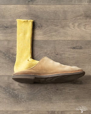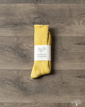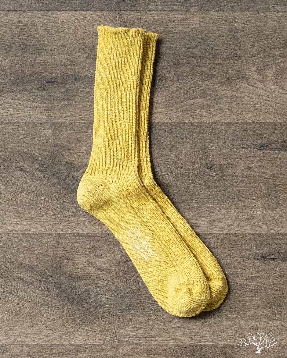 Nishiguchi Kutsushita Hemp Cotton Ribbed Socks are an excellent pair if you're in search of some solid cotton socks with a little more breathability. This Vintage Yellow sock uses a cotton/hemp blend for a slightly more durable and breathable pair, and with a dry hand these are excellent for those hotter days.