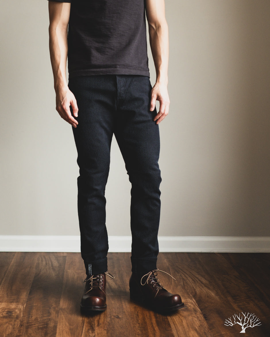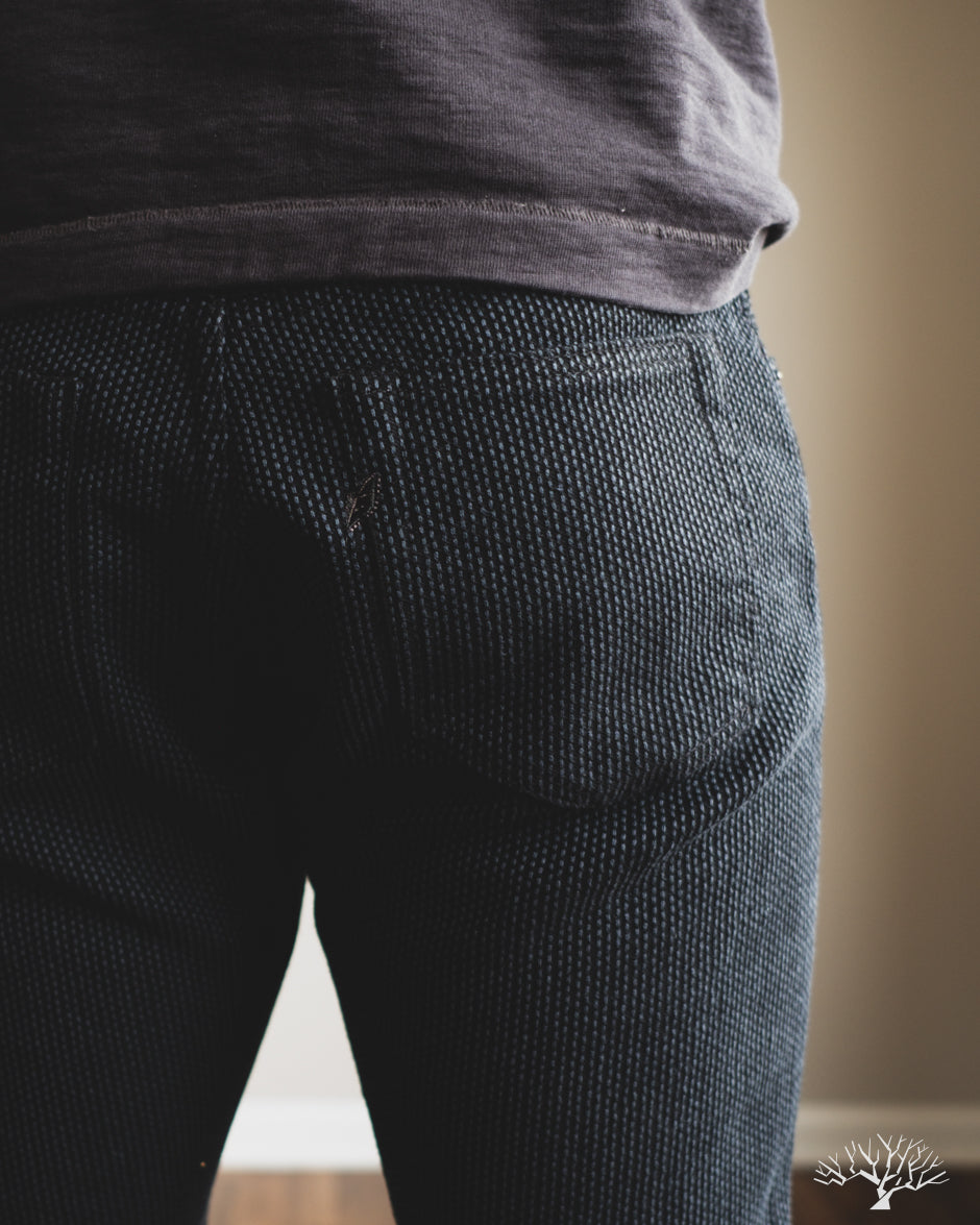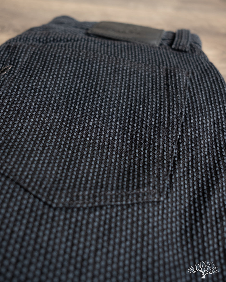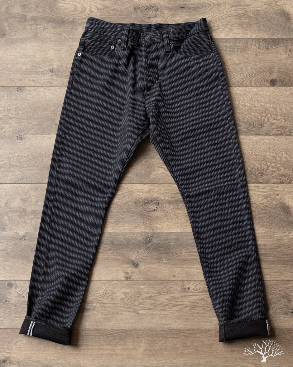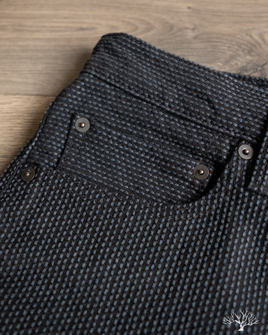 Pure Blue Japan Sashiko Pants in their Relaxed Taper Fit and a Grey x Black Sashiko fabric. These feature the same original jacquard weave Sashiko as found on their jackets, but in a 5 pocket pants style, with a roomy top block and strong taper through the knees on down. These will fade beautifully with wear and are an easy pair to wear from the start.