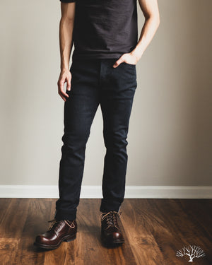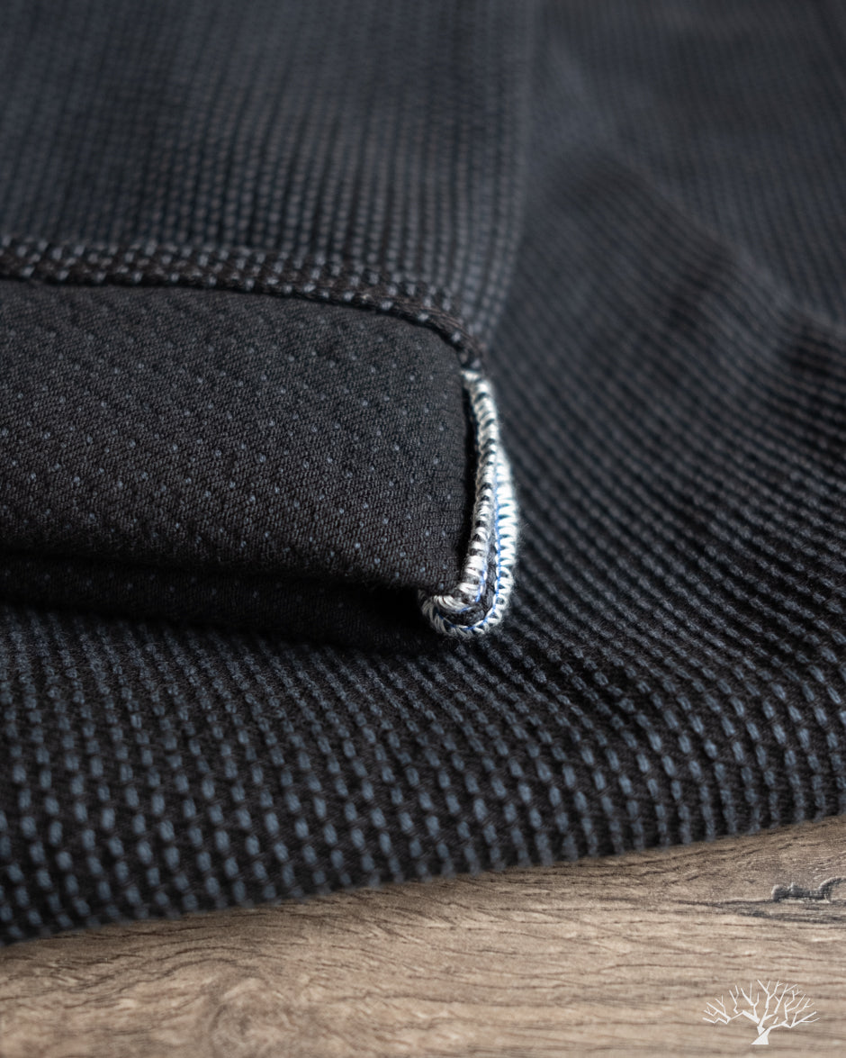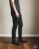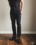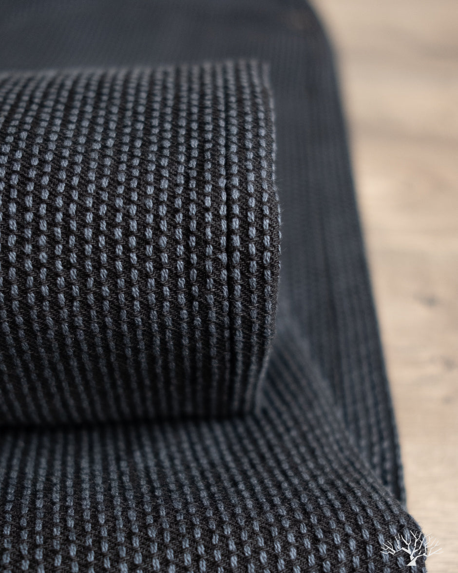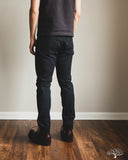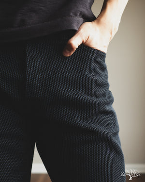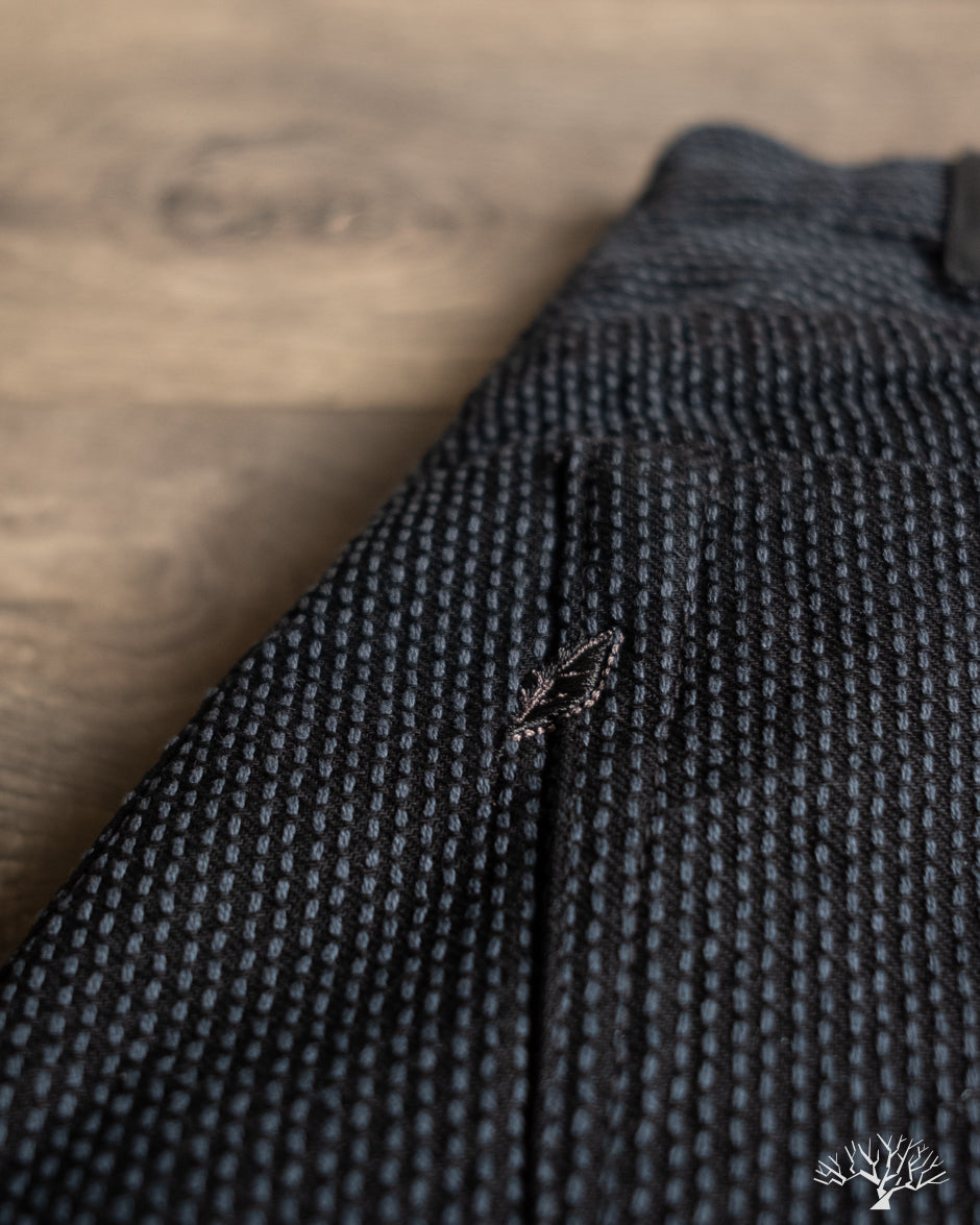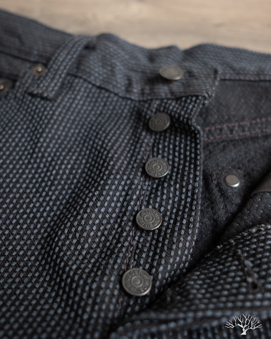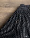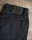 Pure Blue Japan Sashiko Pants in their Relaxed Taper Fit and a Grey x Black Sashiko fabric. These feature the same original jacquard weave Sashiko as found on their jackets, but in a 5 pocket pants style, with a roomy top block and strong taper through the knees on down. These will fade beautifully with wear and are an easy pair to wear from the start.