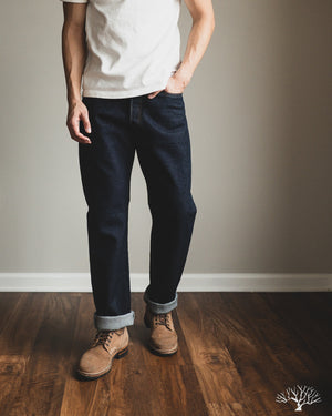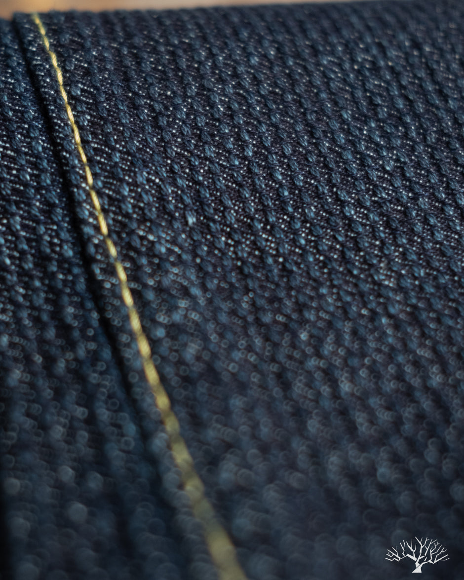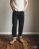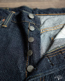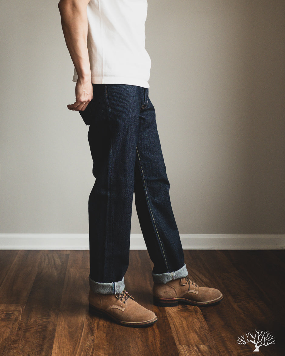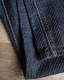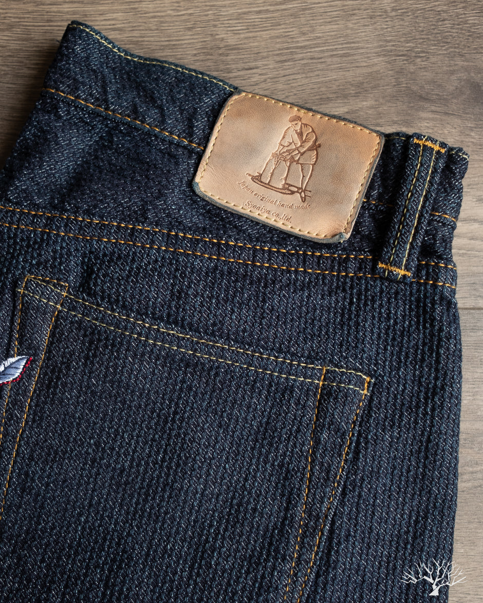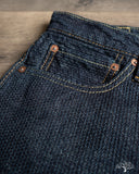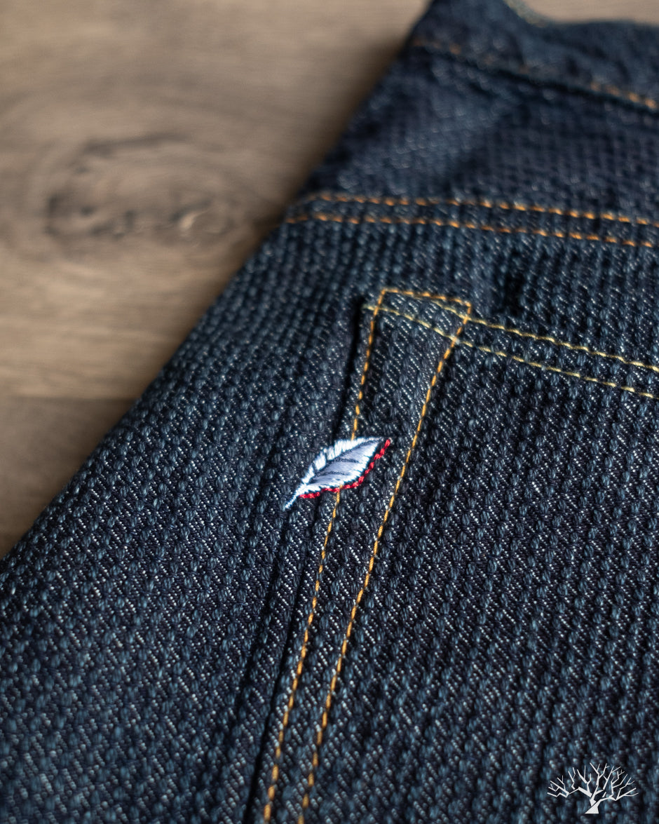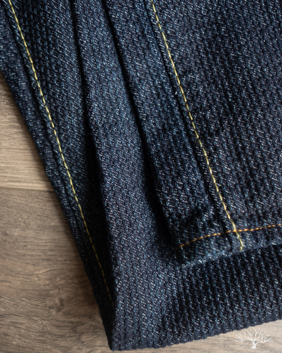 These Pure Blue Japan Sashiko Pants in an Indigo x Indigo colorway are an excellent, slightly more relaxed pair of pants than their typical cuts. These feature the same original jacquard weave Sashiko as found on their jackets, but in a loose fit and pre-rinsed pair. These will fade beautifully with wear and are an easy pair to wear from the start.