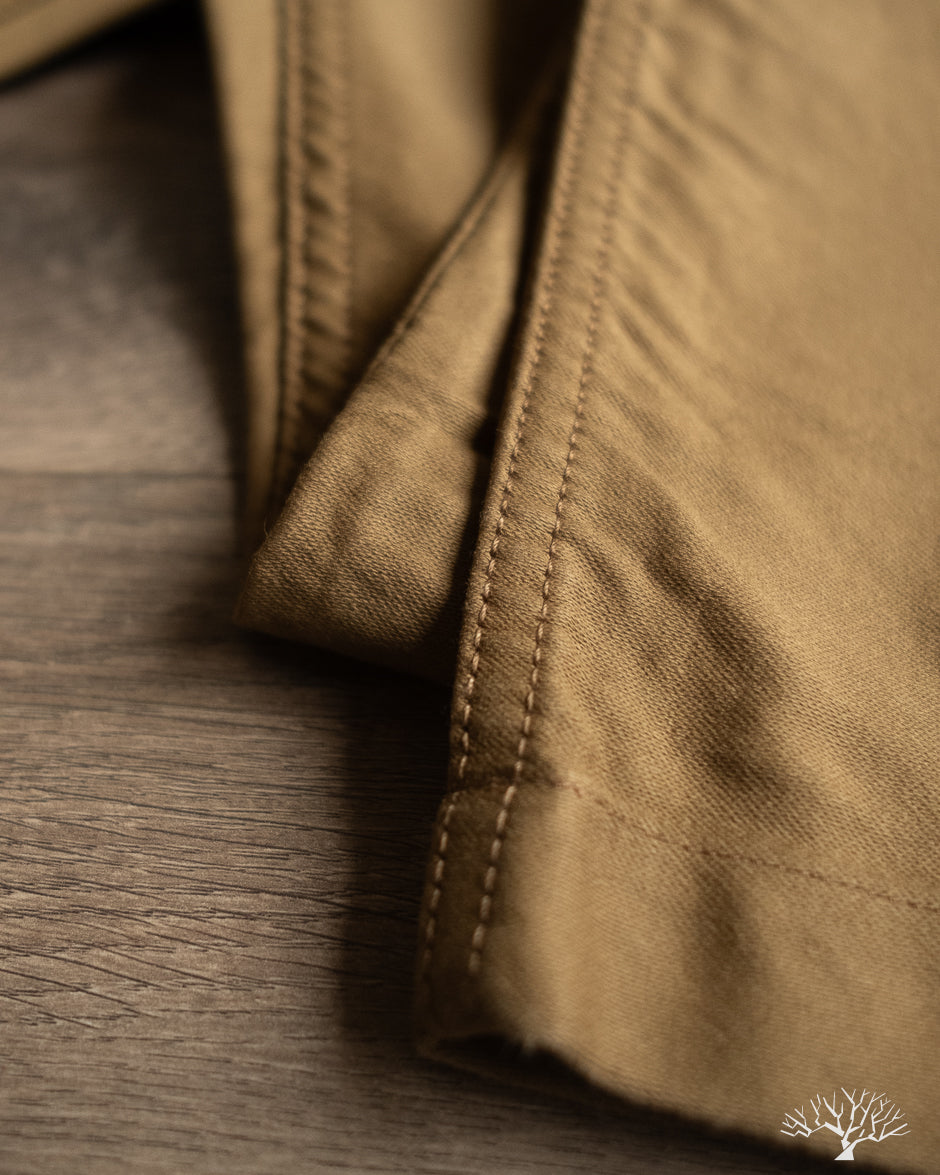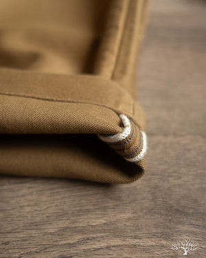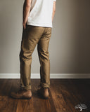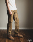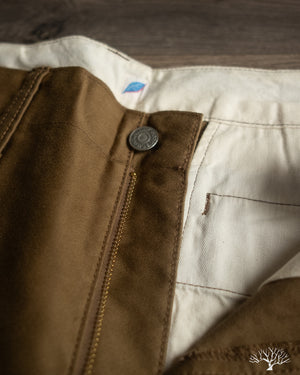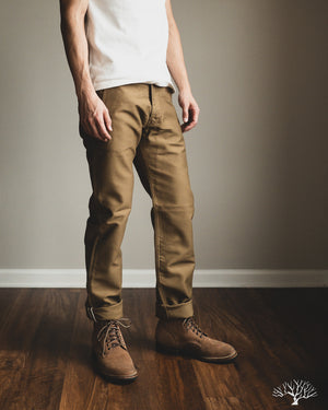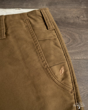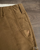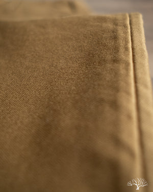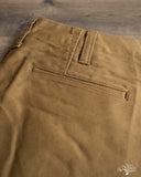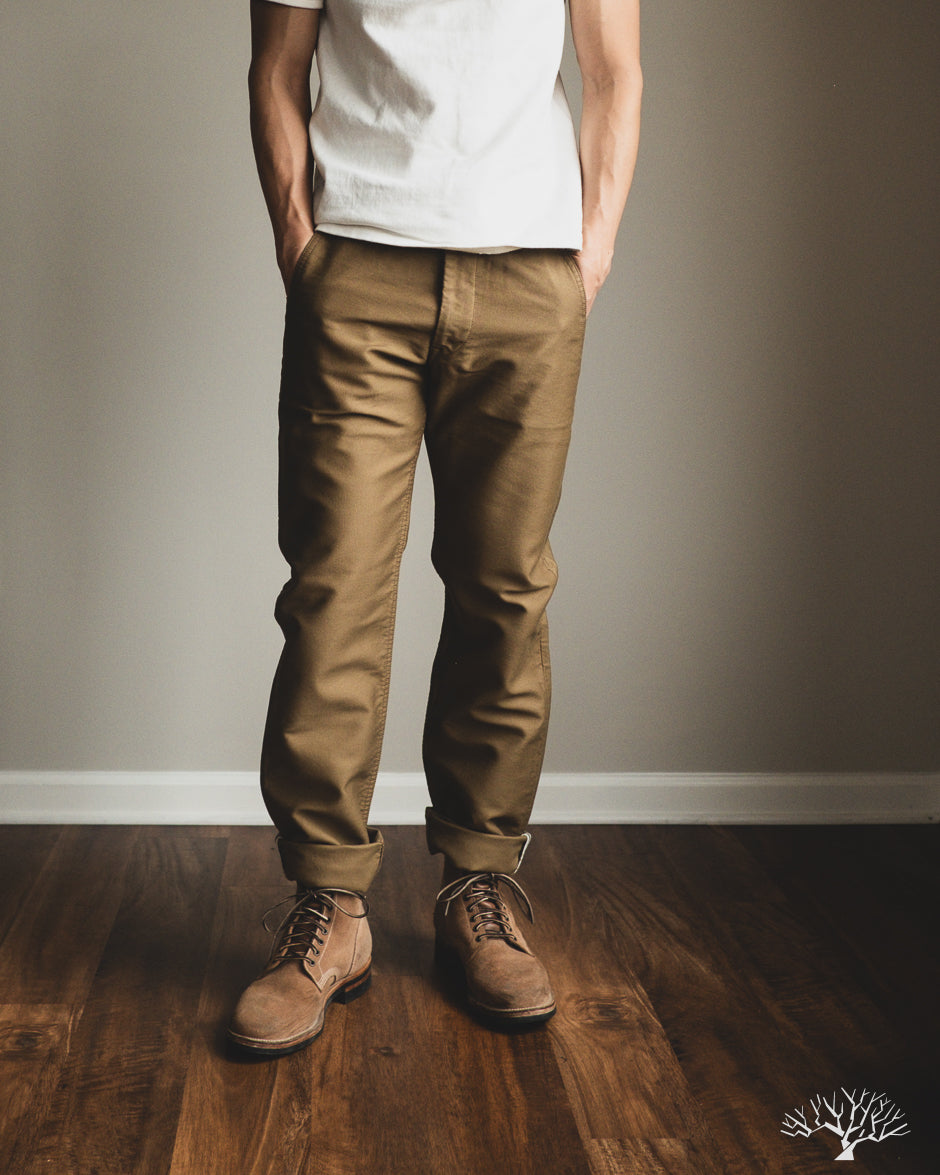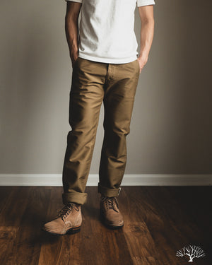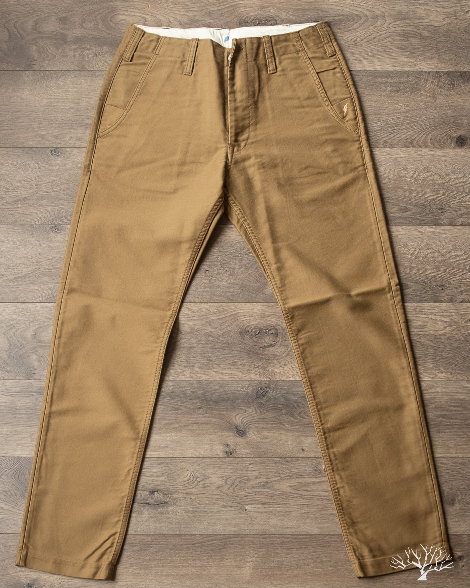 Pure Blue Japan's Moleskin Trousers in a Dark Beige classic straight cut pair. These are a solid pair for the cooler seasons of the year due to the soft yet dense and durable moleskin fabric. This Dark Beige color will pair well with a variety of outfits, and you can cuff the bottoms for a nice double-line white-stitch accent.