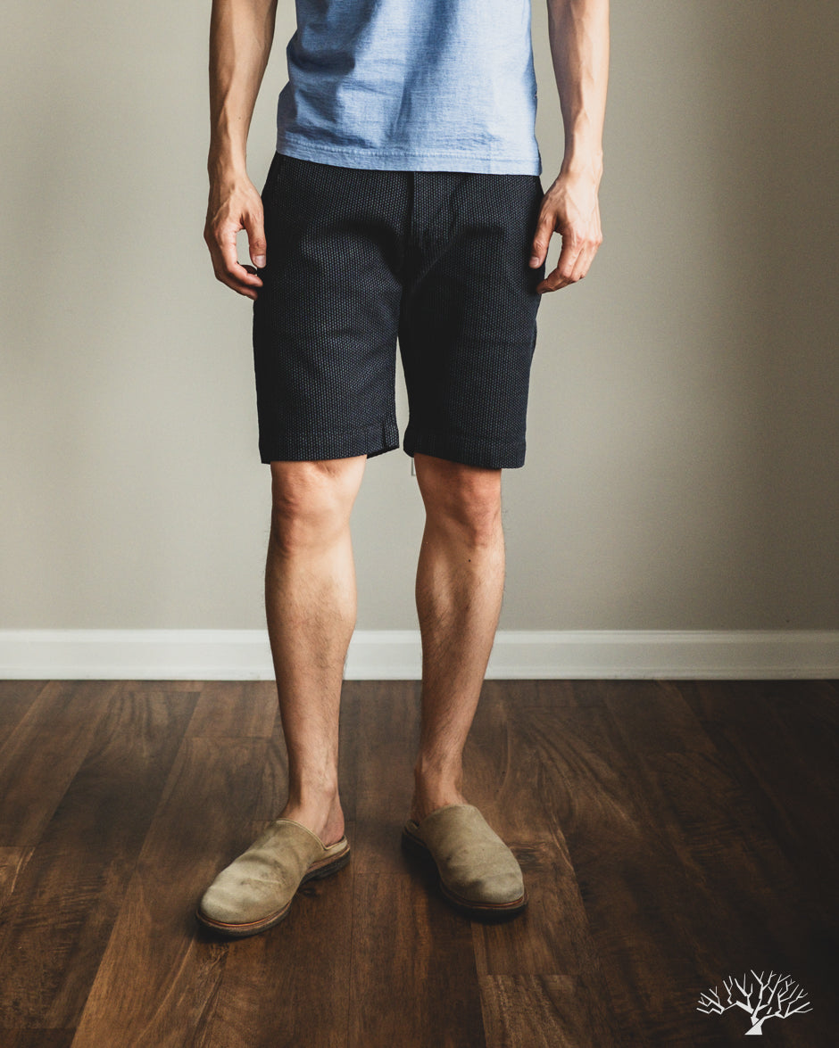 These Pure Blue Japan Sashiko shorts are a stunning pair for the warm weather. Made using Pure Blue Japan's special sashiko weave, this black pair of shorts features a grey sashiko weave for a not-quite-black pair of shorts. The shorts have two side slant pockets and two rear patch pockets.