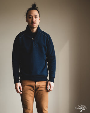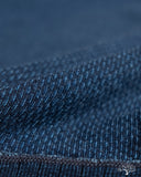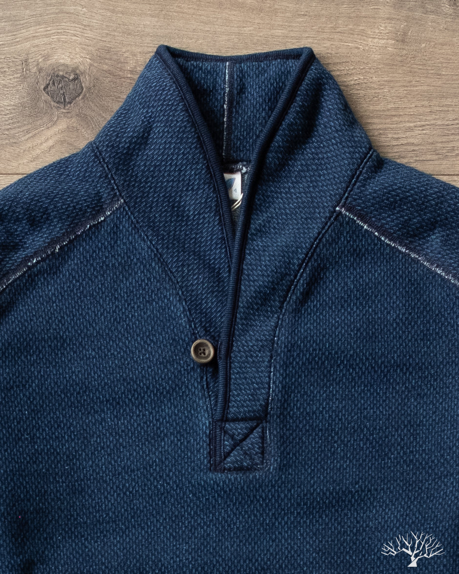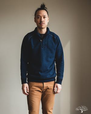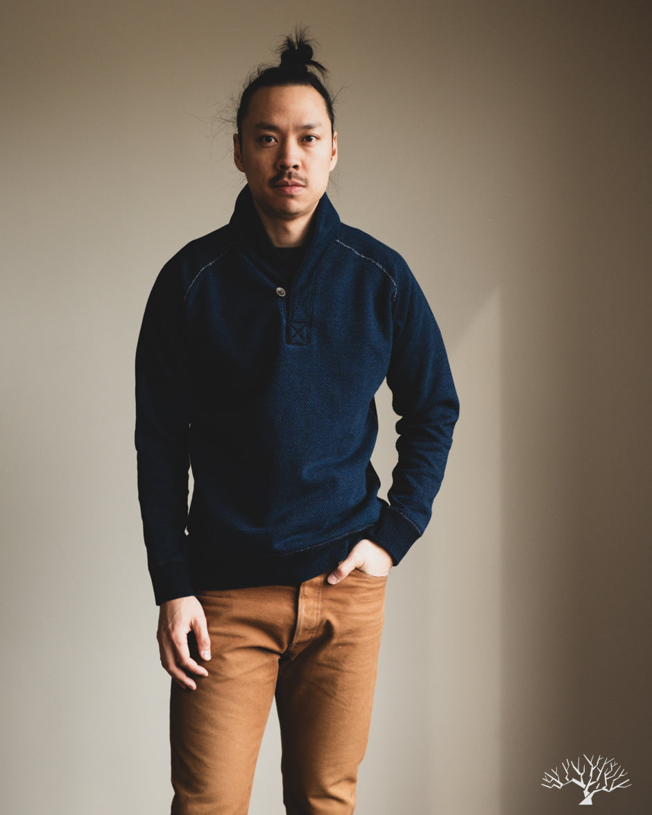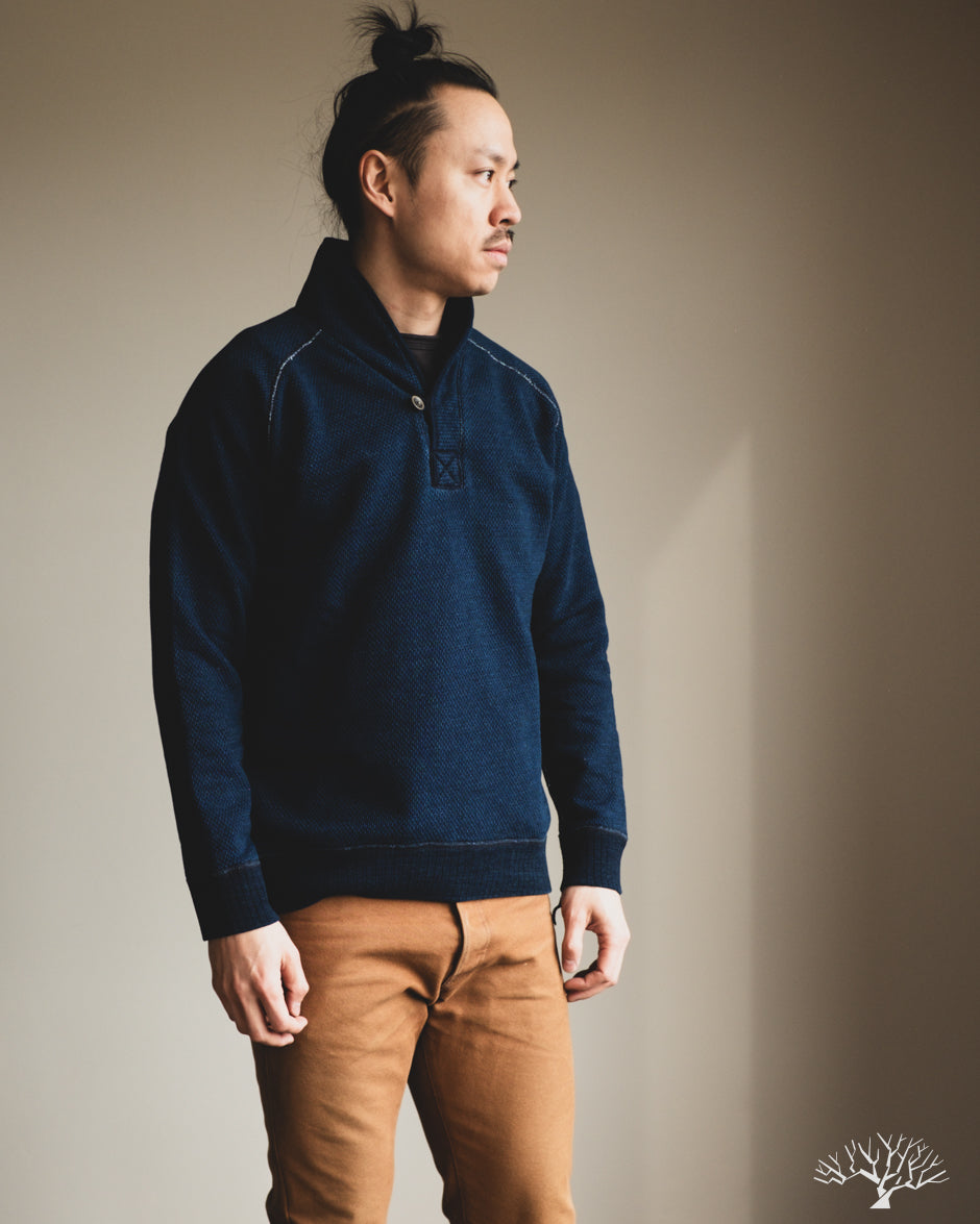The Pure Blue Japan Shawl Collar Sweatshirt in a lovely indigo "Sashiko" fabric - made for a slightly elevated version of their standard indigo-dyed sweatshirts. Similar to their other indigo sweatshirts, the interior features a terry-like back and the exterior face, a Sashiko-like visual effect. The fabric is created using a dark indigo rope-dyed base, and the Sashiko-like effect is created with a slightly lighter indigo rope-dyed yarn. The shawl collar has a clean finish and a single button detail is included for buttoning-up the collar if so desired. The raglan sleeves finish off some of these notable details for a comfortable and accommodating fit.