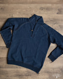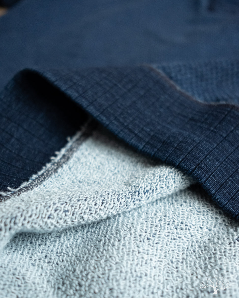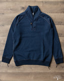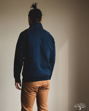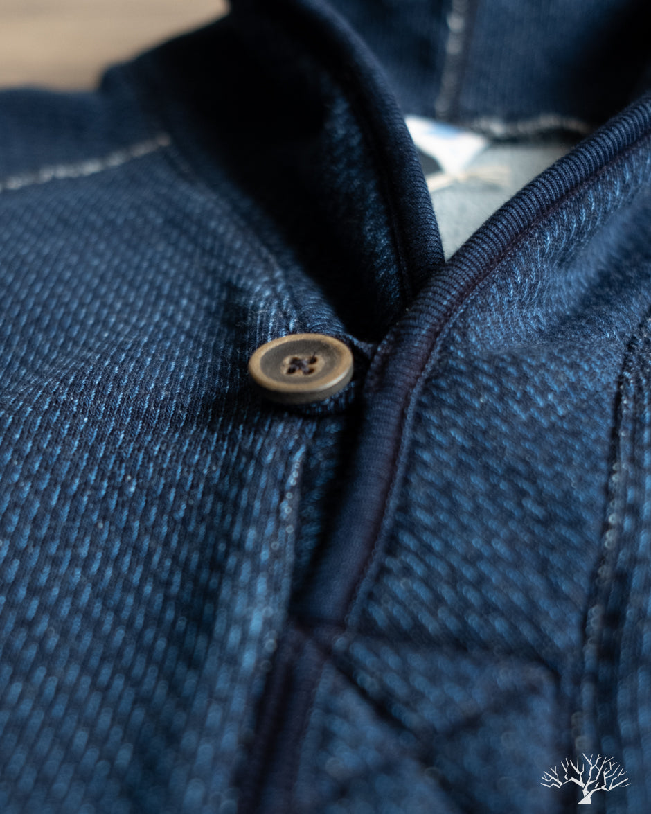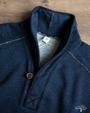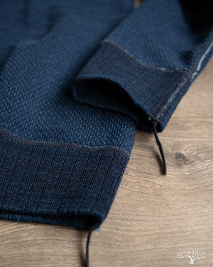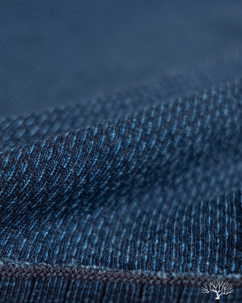 The Pure Blue Japan Shawl Collar Sweatshirt in a lovely indigo "Sashiko" fabric - made for a slightly elevated version of their standard indigo-dyed sweatshirts. Similar to their other indigo sweatshirts, the interior features a terry-like back and the exterior face, a Sashiko-like visual effect. The fabric is created using a dark indigo rope-dyed base, and the Sashiko-like effect is created with a slightly lighter indigo rope-dyed yarn. The shawl collar has a clean finish and a single button detail is included for buttoning-up the collar if so desired. The raglan sleeves finish off some of these notable details for a comfortable and accommodating fit.