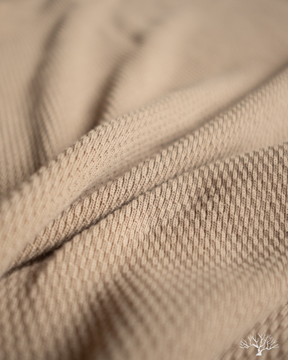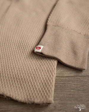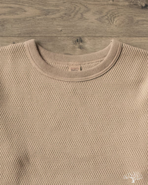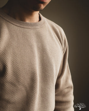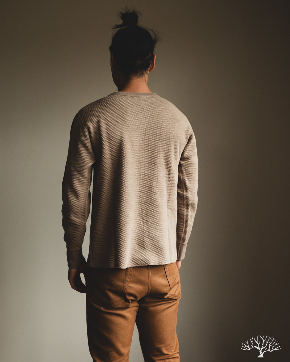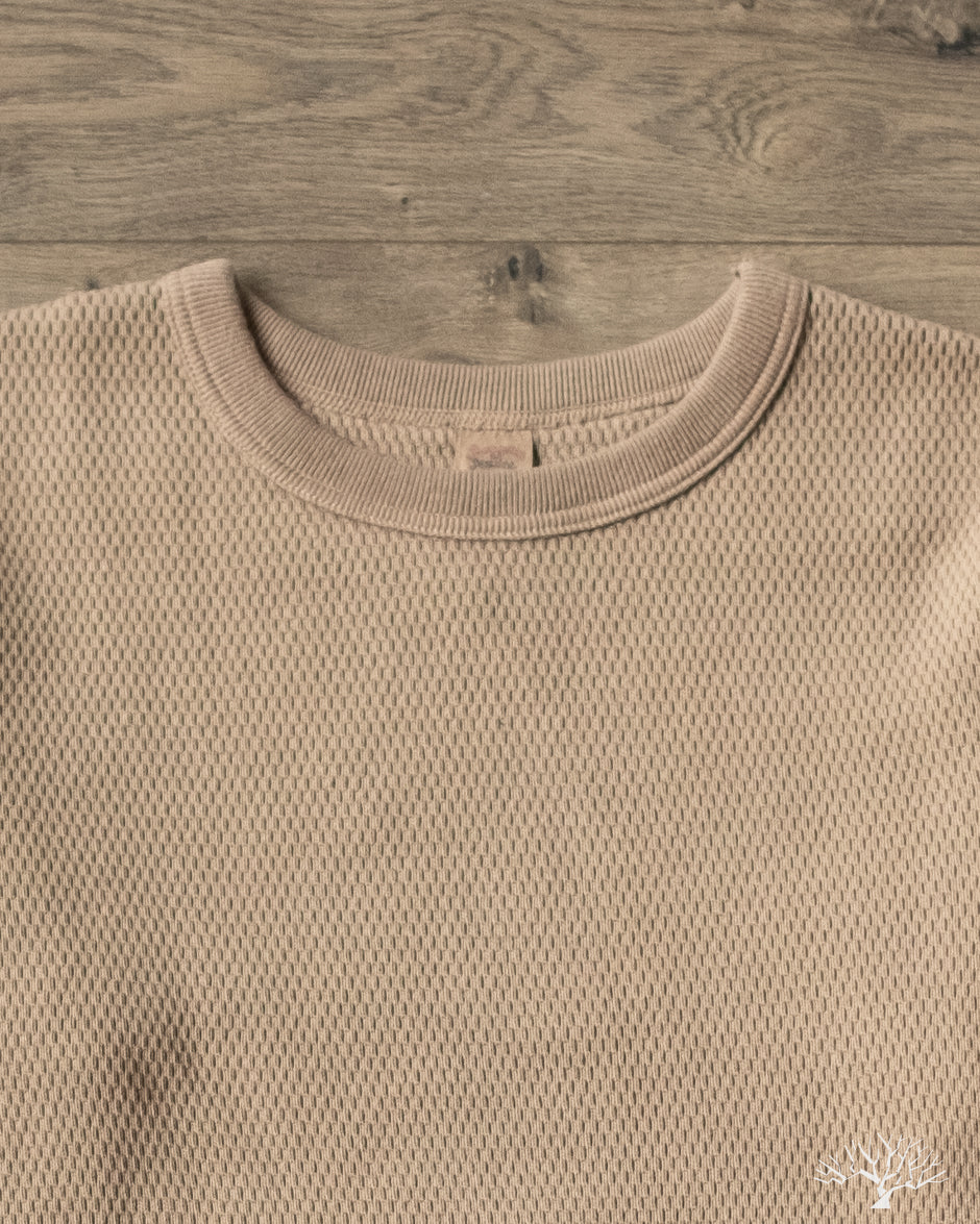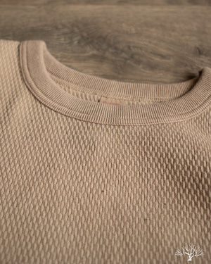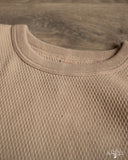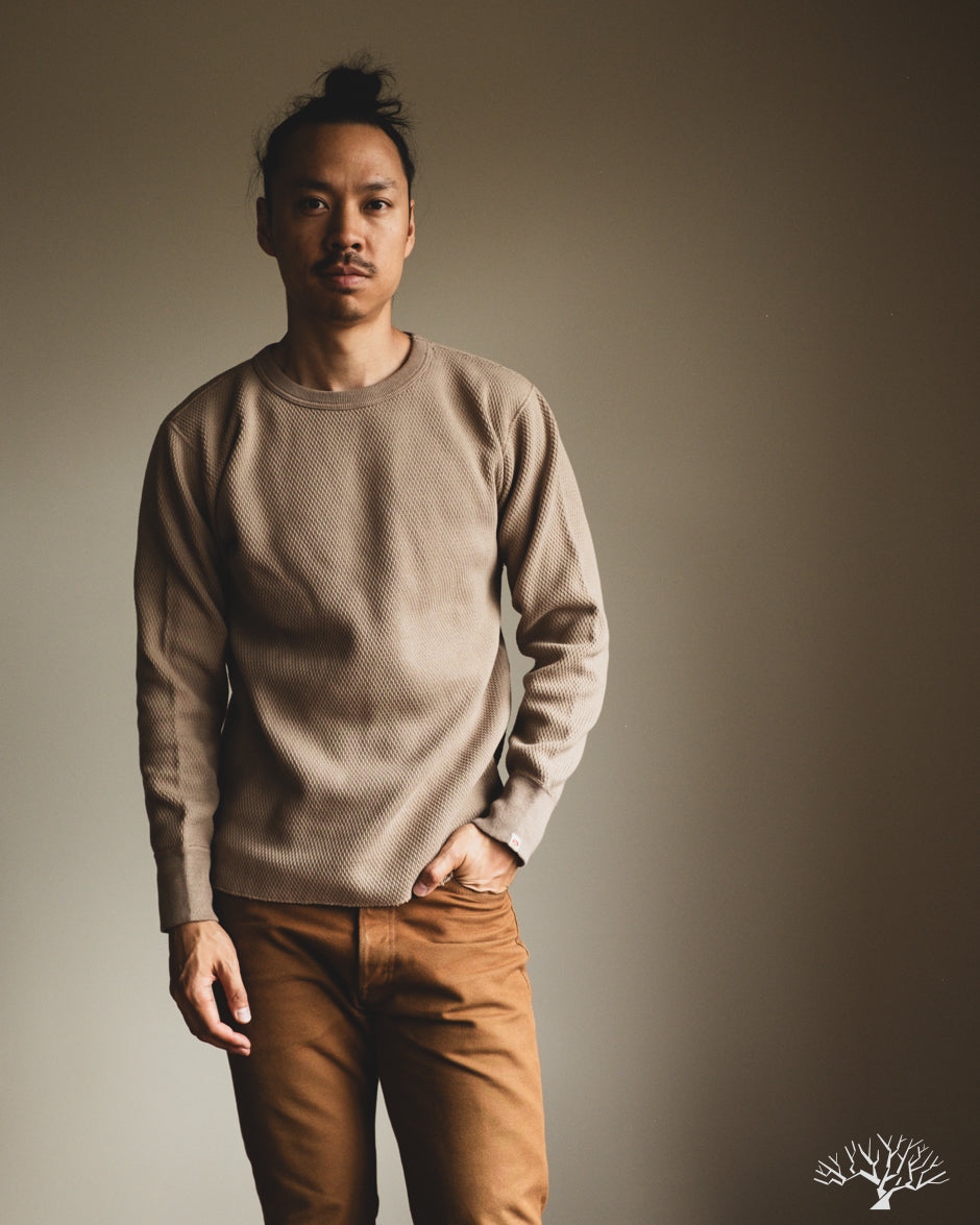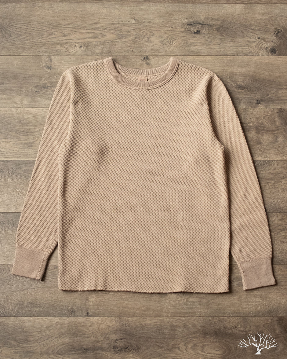 The UES Sand Beige 60WH Double Honeycomb Thermal is a thicker version of the 60TR Regular Thermal, with the same four-needle flat seam construction for a heavy and well constructed thermal. These work well as a standalone base layer during the modest Fall/Winter days, or a nice heavy initial layer to pile on some flannels and jackets on top of in the darkest of winter days. These have a similar feel and density as the Iron Heart IHTL-1700 Thermal Sweaters.