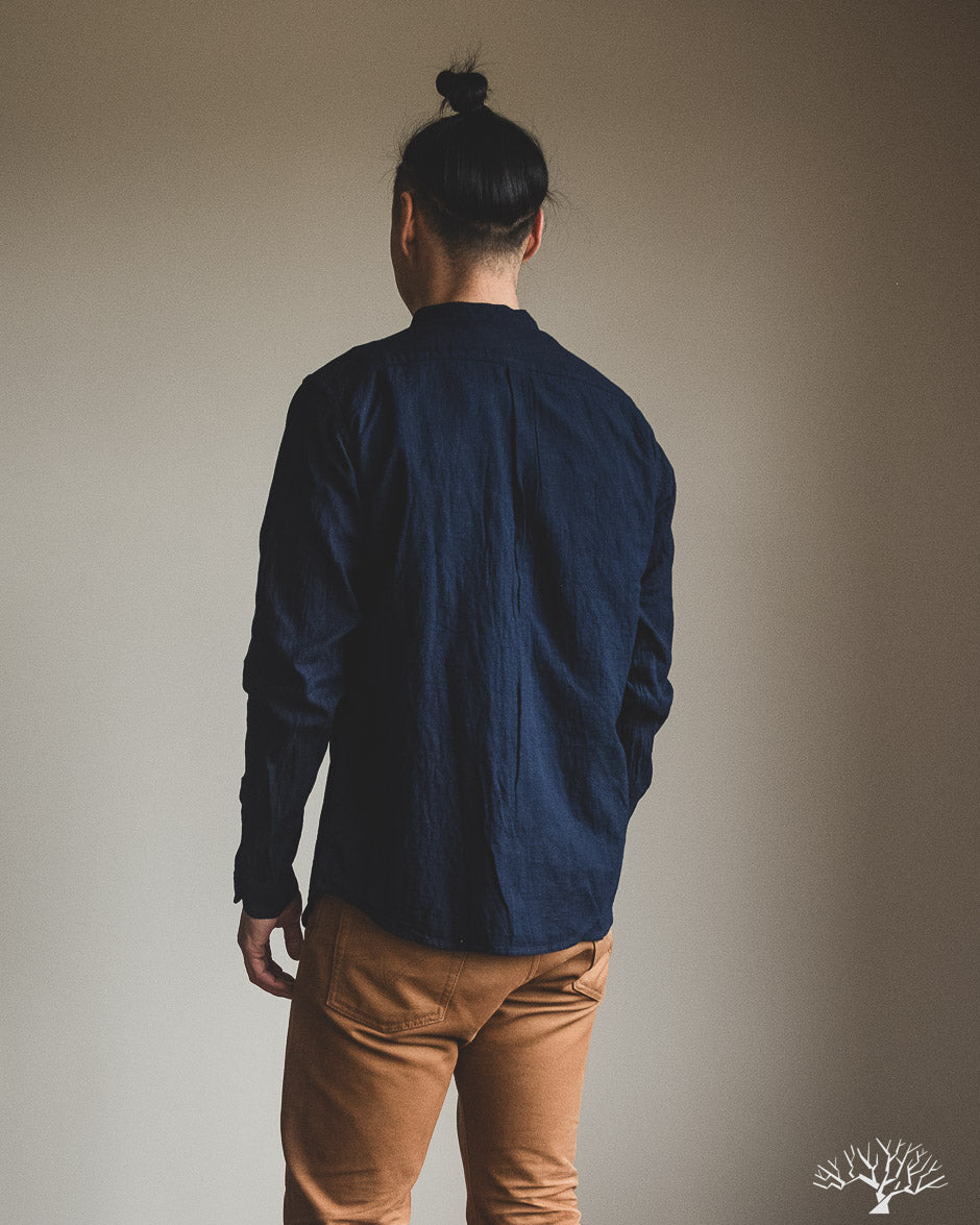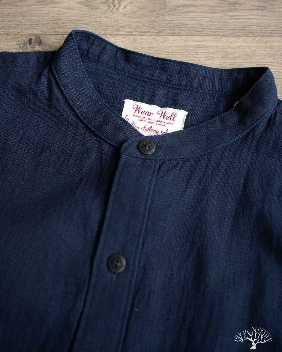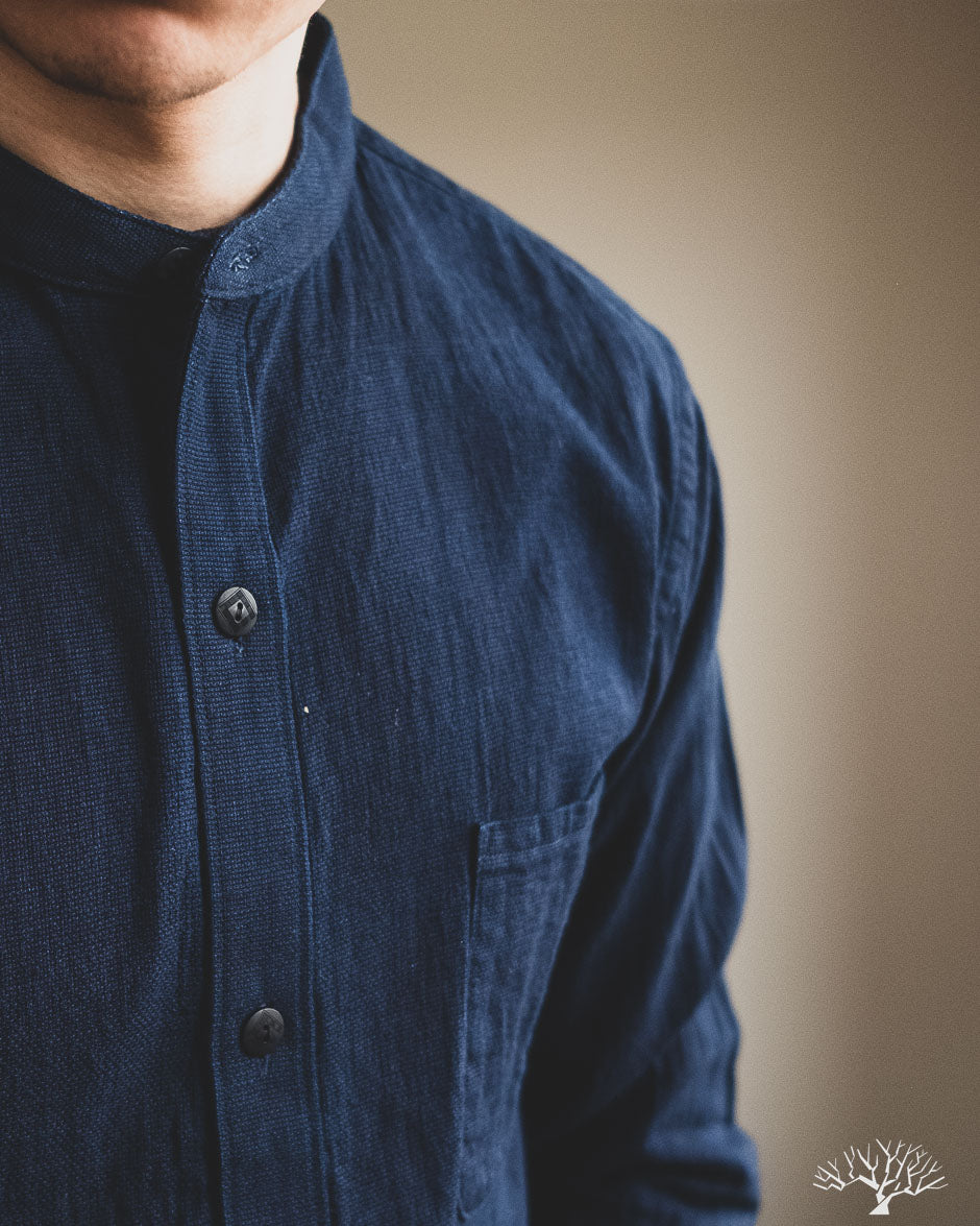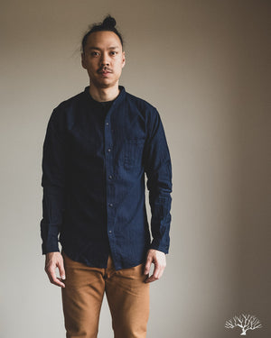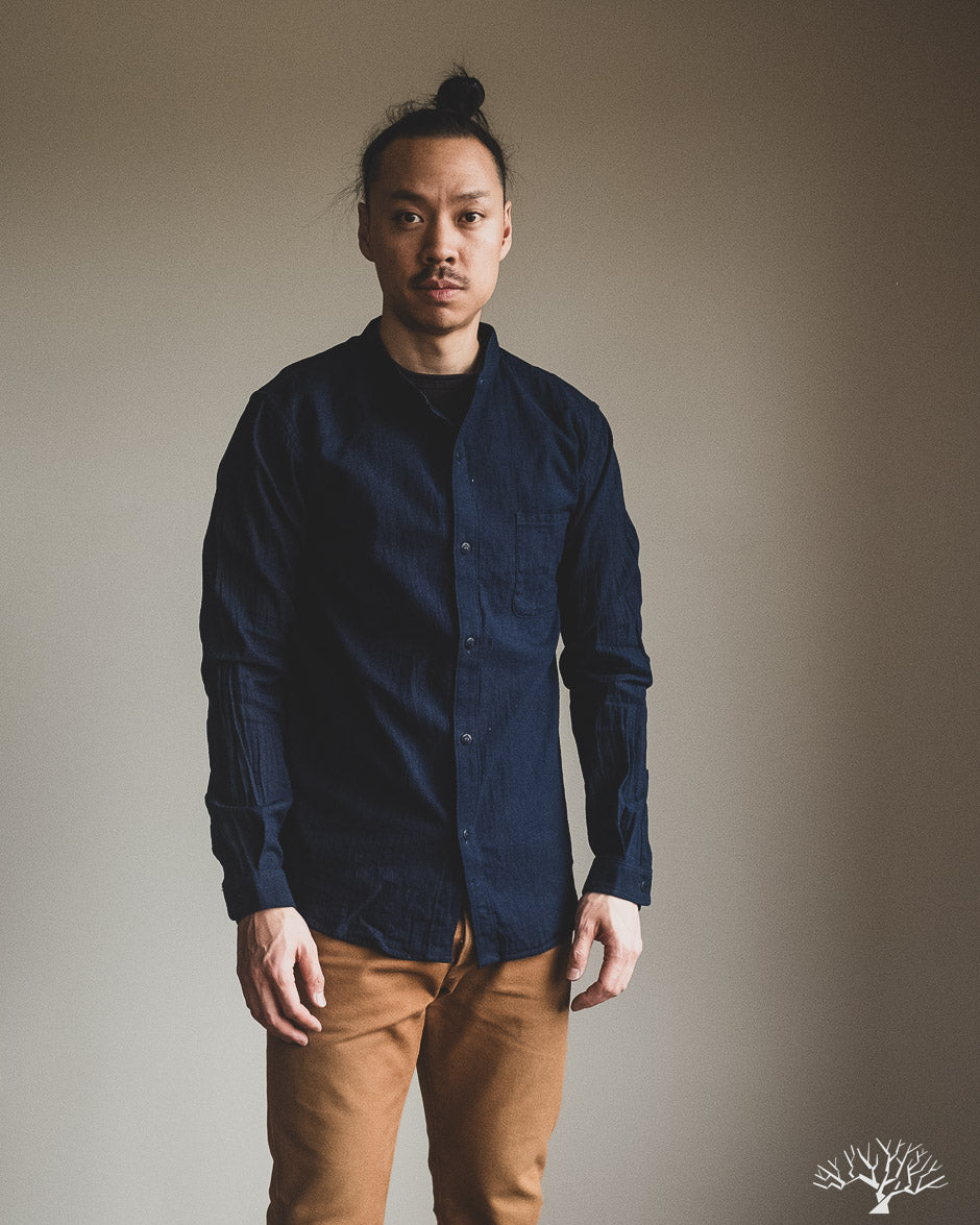 The UES Band Collar shirt returns in a lightweight 5oz selvedge indigo dobby fabric. The band collar can clean up nicely when fully buttoned, or keep it slightly more casual by leaving the top button open. This fabric is woven on a dobby loom to give it a waffle-like surface and uniquely will become slightly thicker with washes.