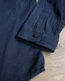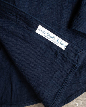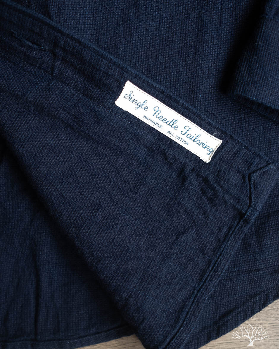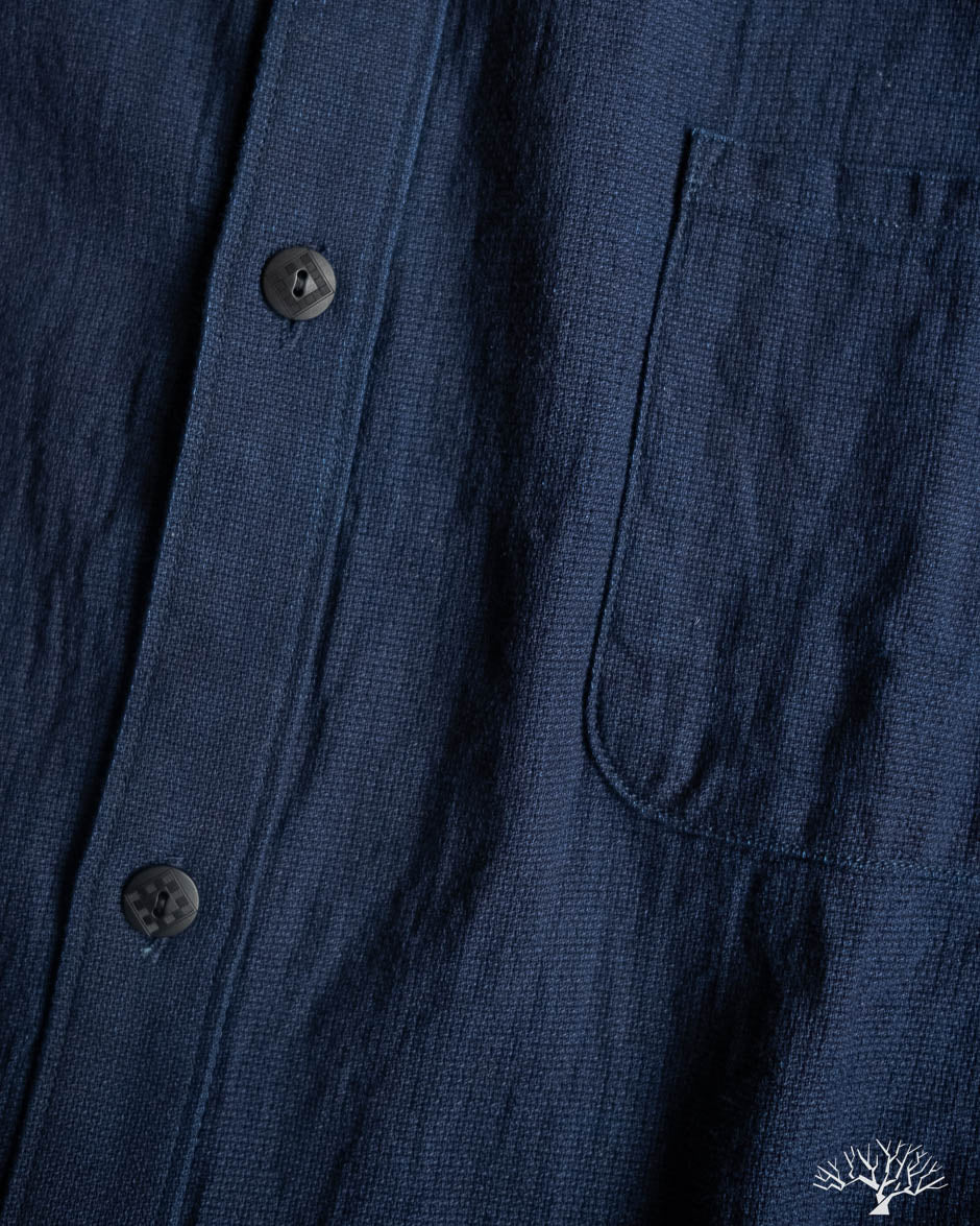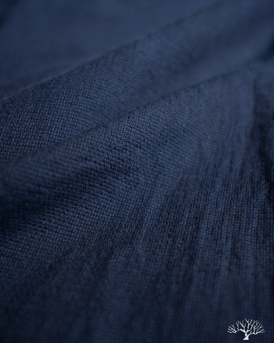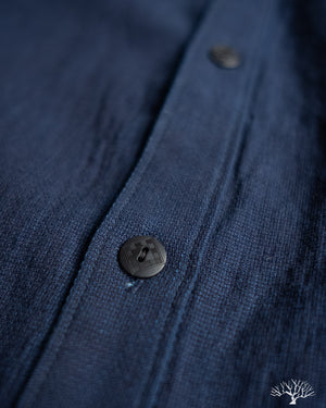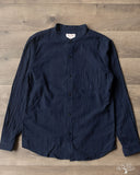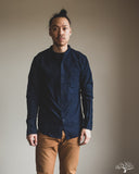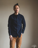 The UES Band Collar shirt returns in a lightweight 5oz selvedge indigo dobby fabric. The band collar can clean up nicely when fully buttoned, or keep it slightly more casual by leaving the top button open. This fabric is woven on a dobby loom to give it a waffle-like surface and uniquely will become slightly thicker with washes.