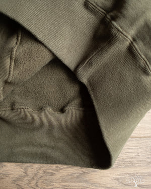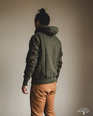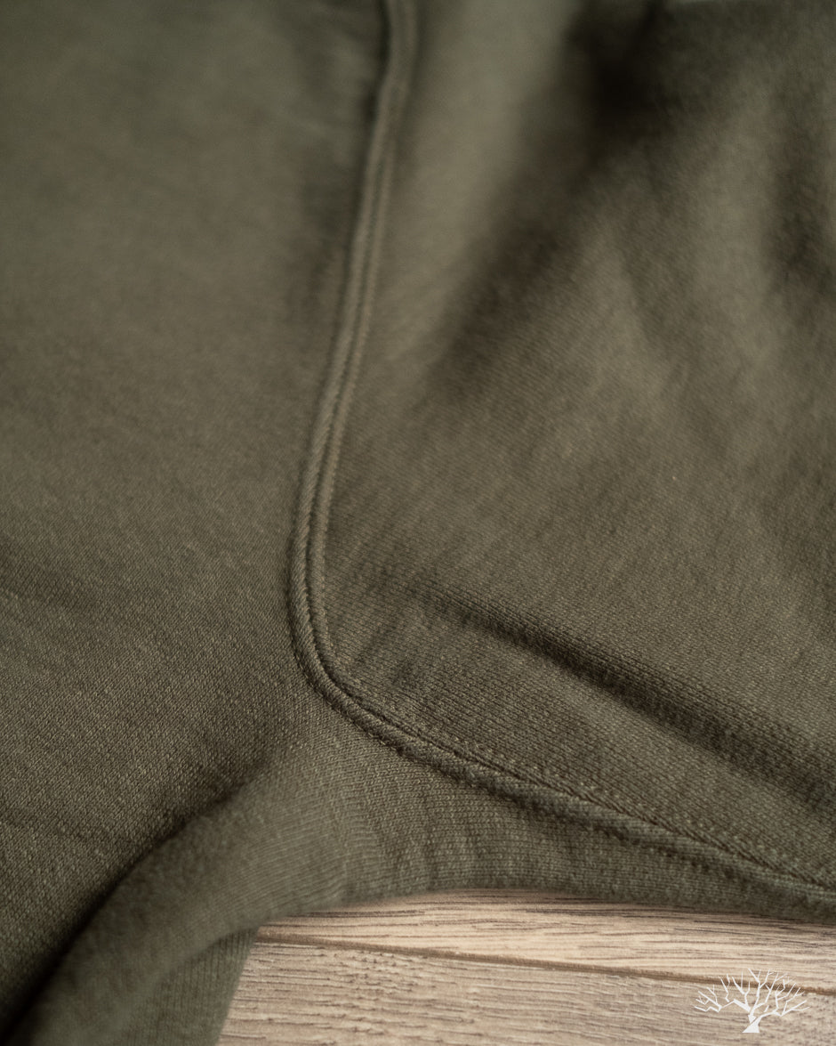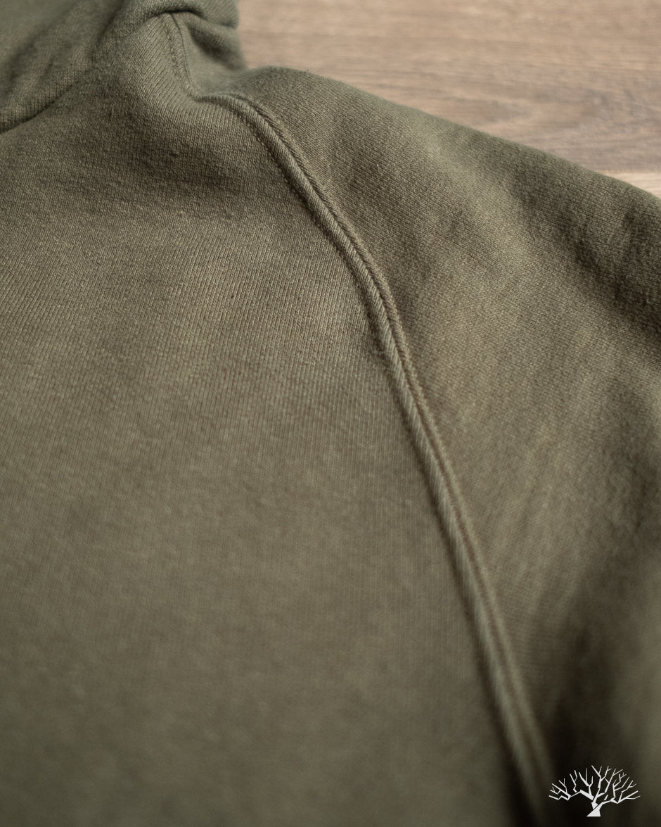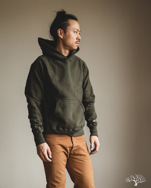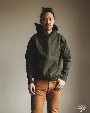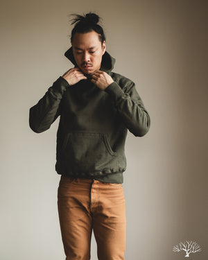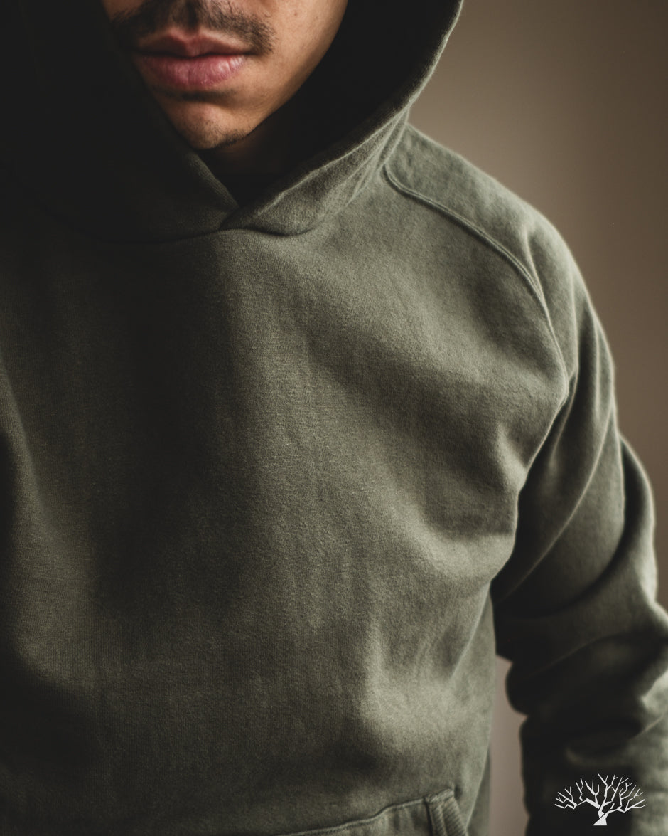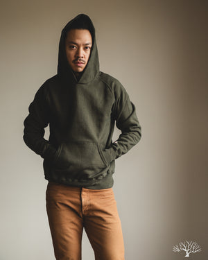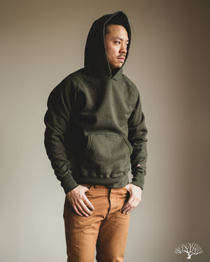 The UES Hood Sweatshirt in Olive Green is an excellent pullover hoodie with a heavyweight fleece and a classic, no frills appearance. This olive green color pairs well with denim and duck canvas pants, and definitely pack some weight to deliver solid warmth. These have a comfortable fit through the biceps and a slim fit through the elbows/wrists, and unique with these sweatshirts are the seamless transition through the armpits with the raglan shoulders and sleeves, giving you a wider range of movement and a comfortable fit.