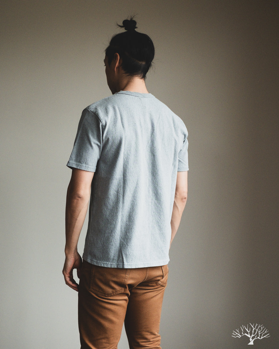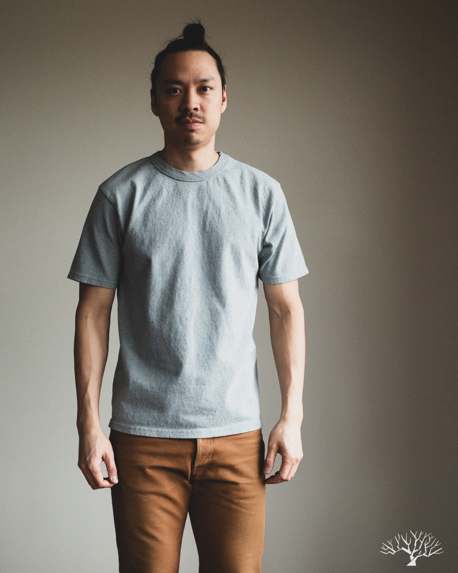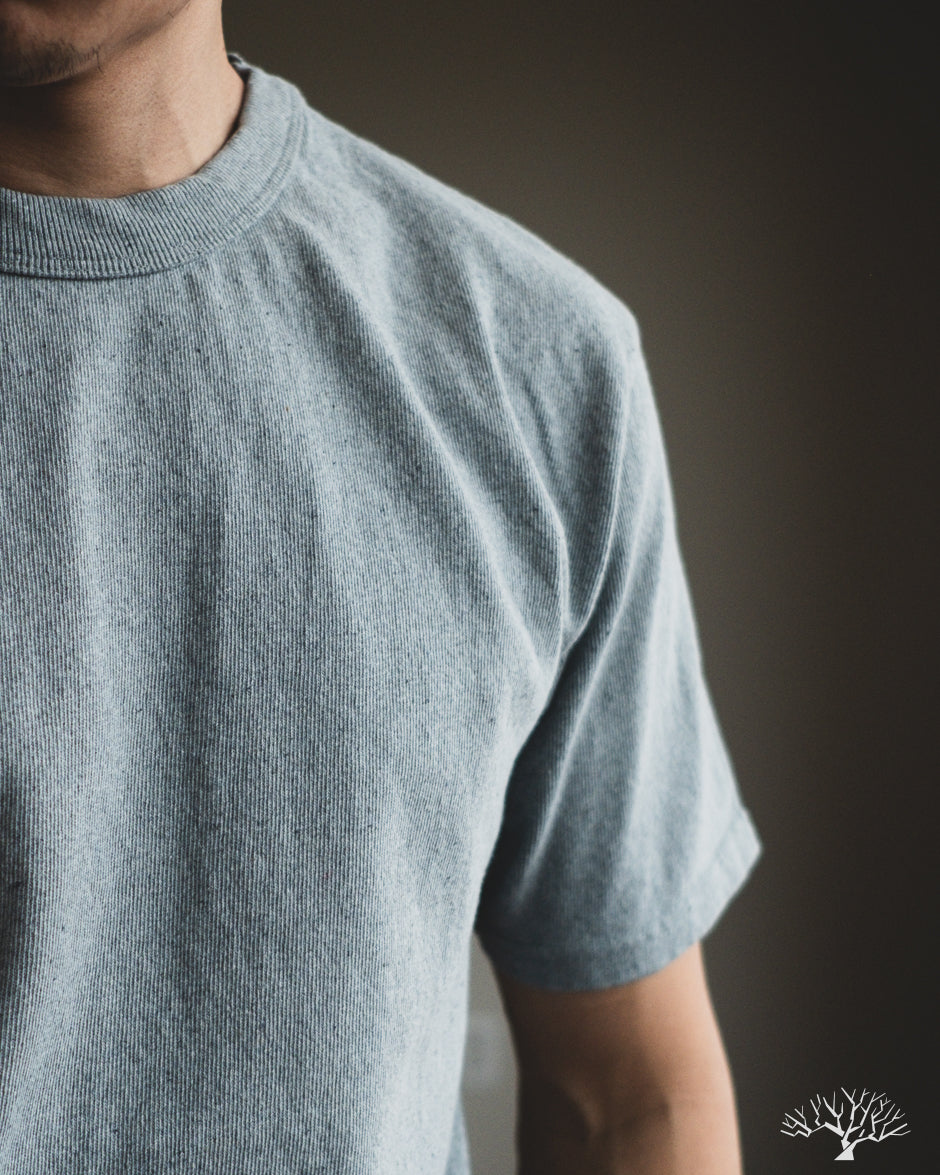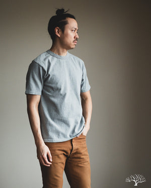 The UES Recycled Denim T-Shirt in Sax Blue is a newer style featuring recycled denim yarn from Ferree in Spain. The result is a heathered light indigo appearance that is similar in weight to their flagship No. 8 Slub T-Shirt, but with slightly less slub and a softer, fuzzier hand. Note that these t-shirts are more prone to fade and change in color when exposed to sunlight; to minimize this change, UES recommend storing away from direct sunlight.