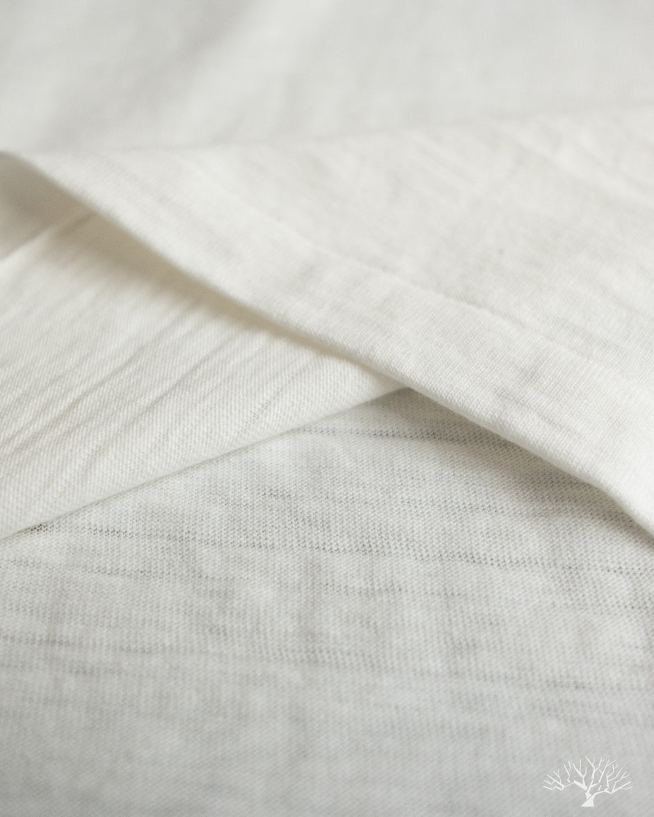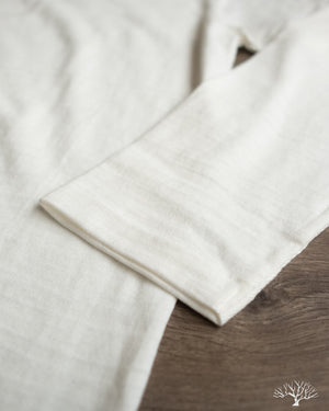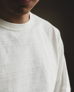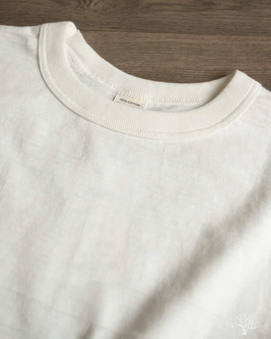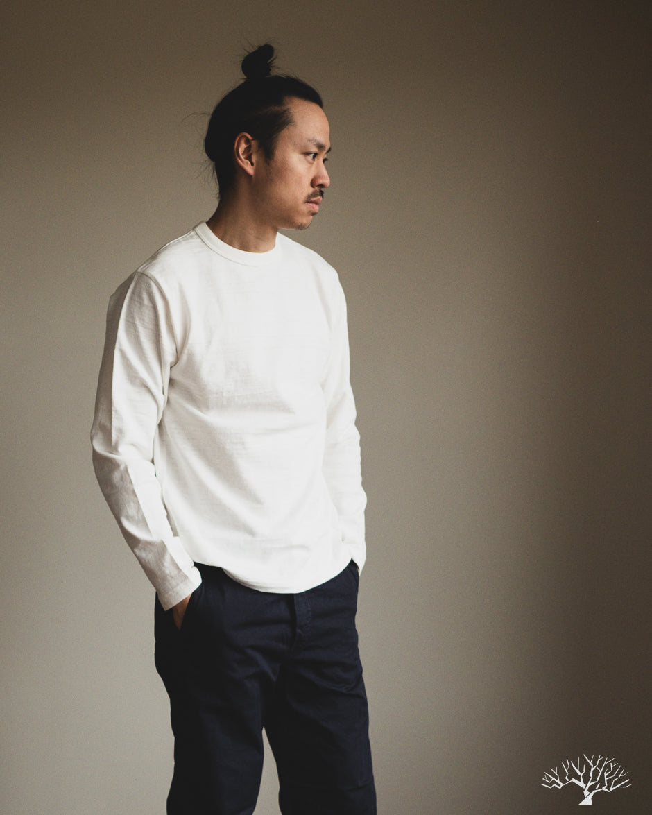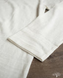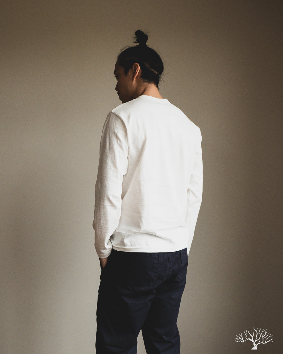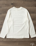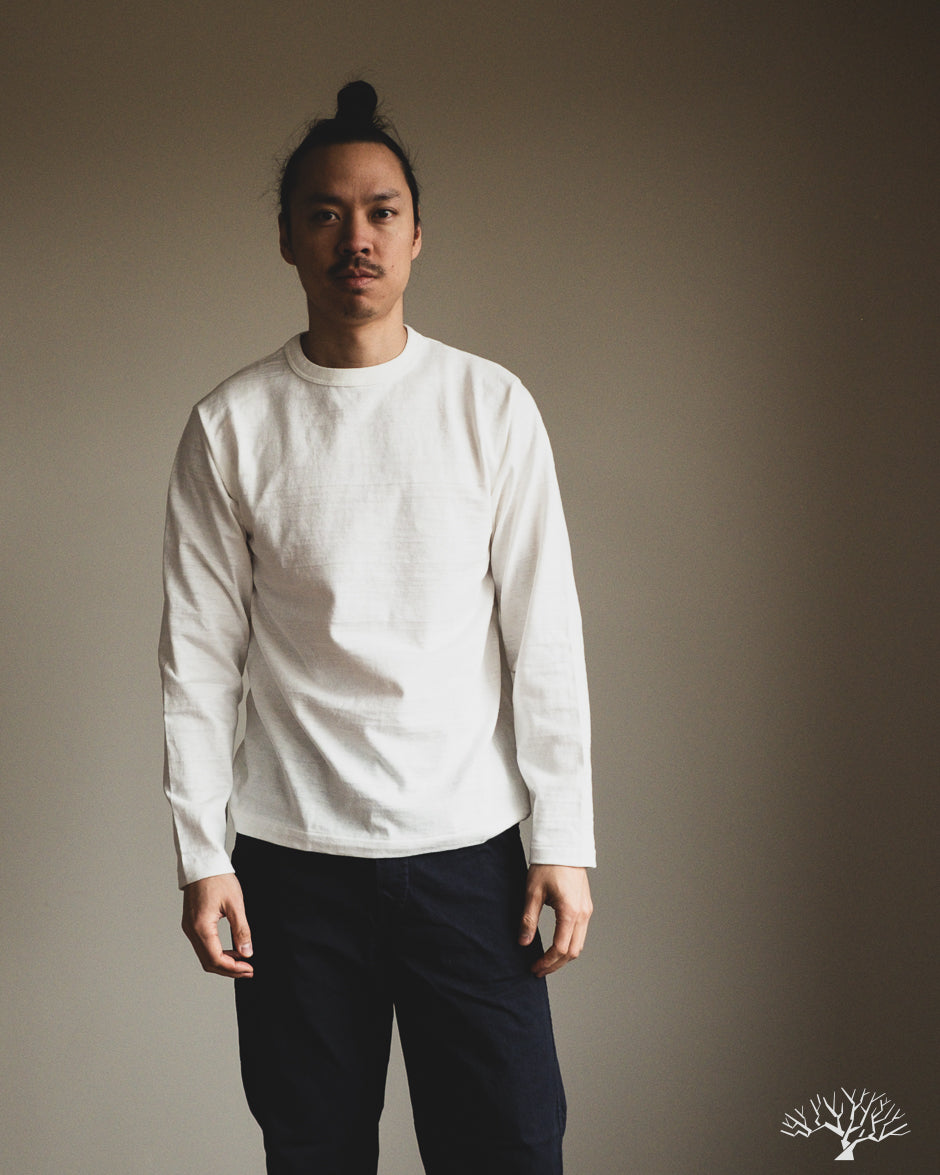 The Warehouse Long-Sleeve Crew Neck T-Shirt features their well-regarded light-to-midweight slub fabric that exhibits some unique texture that catches the eye. This off-white t-shirt is made with 100% cotton and knit on vintage 1960s sinker knitting machines. The result is a t-shirt with no side seams (tubular knit) and a beautiful uneven textured appearance. Notable are the horizontal streaks of texture that you'll see at certain angles, and a perfectly reinforced collar that has just the right amount of give to let it slide on. These Warehouse tees have an excellent hand, and are a nice balance between soft and comfortable, yet with a decent weight to them.